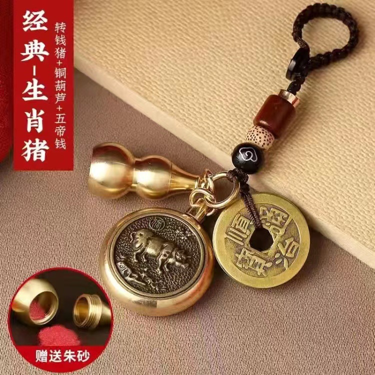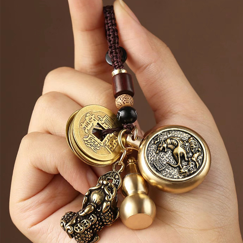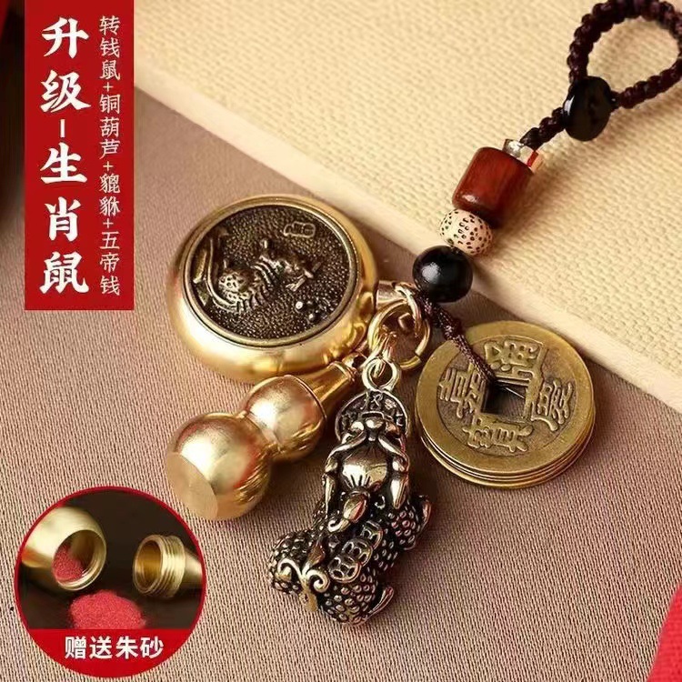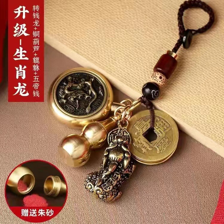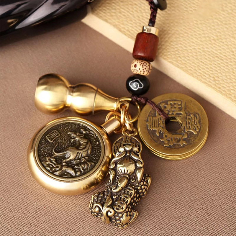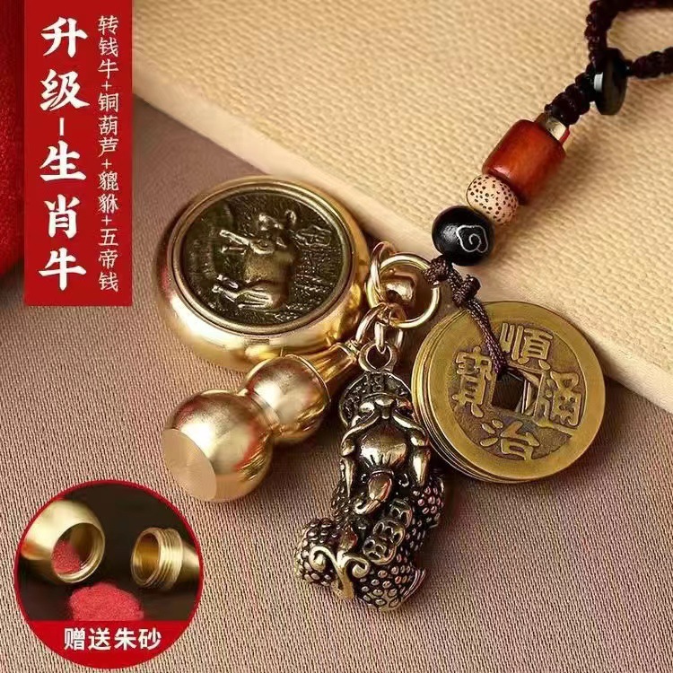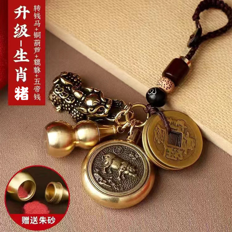 순황동 주사석 비우(貔貅) 동조롱박 자물쇠 열쇠고리, 12지신 자동차 키체인, 오황제 동전 펜던트, 부를 부르는 장신구