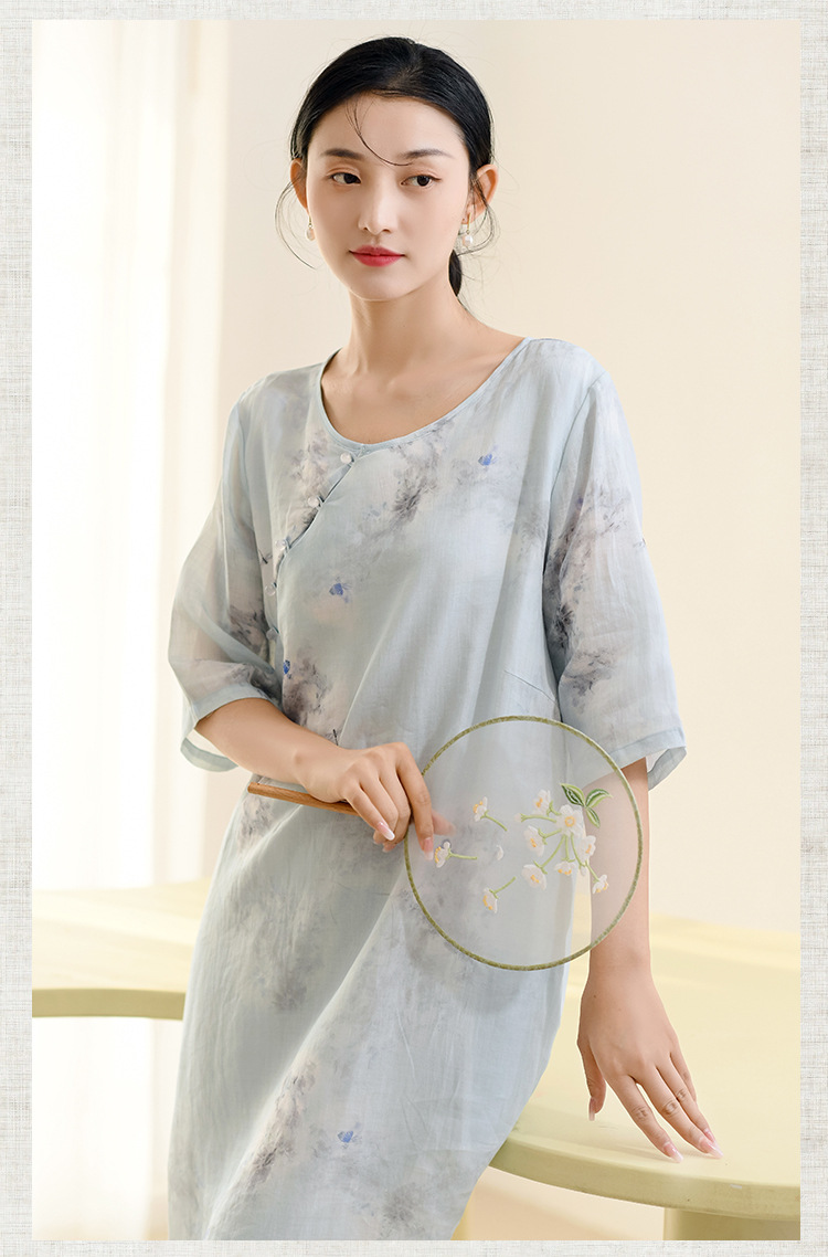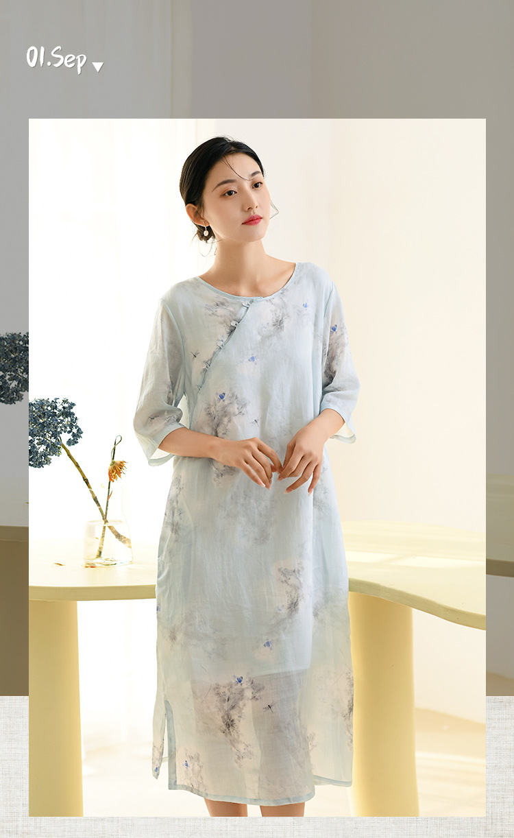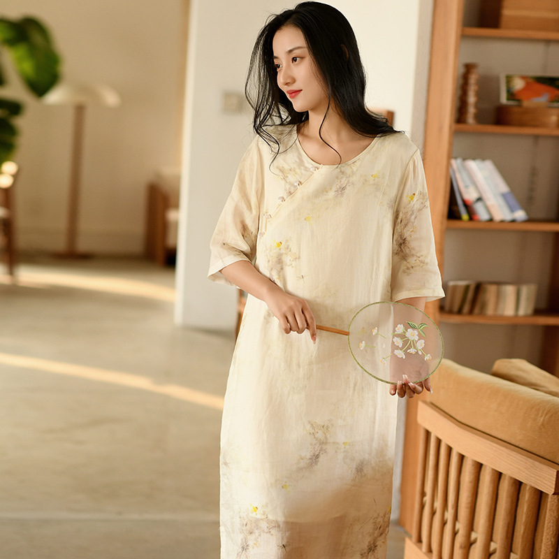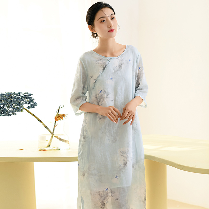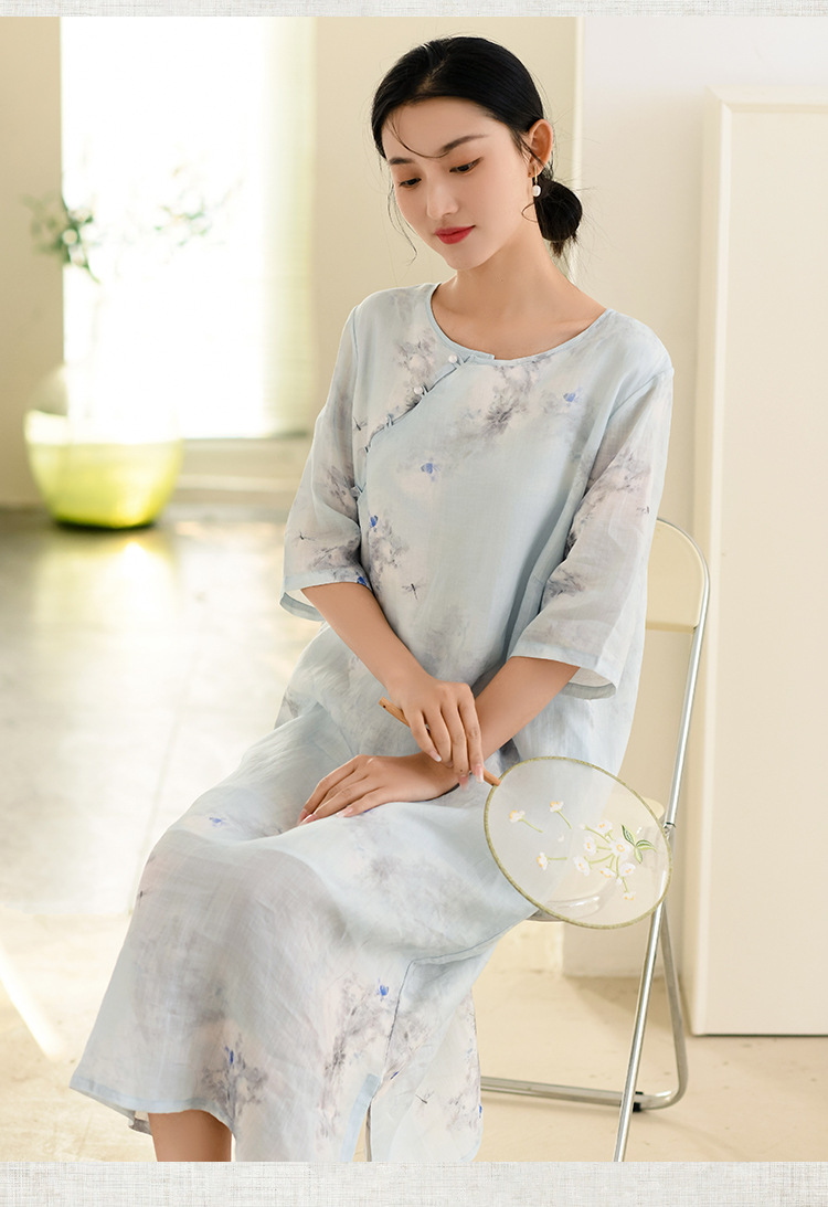 면과 린넨 여성 의류 2023 봄과 여름 새로운 빈티지 원피스 새로운 중국 라미 수정 치파오 중국 스타일 차 의류스토어 가기