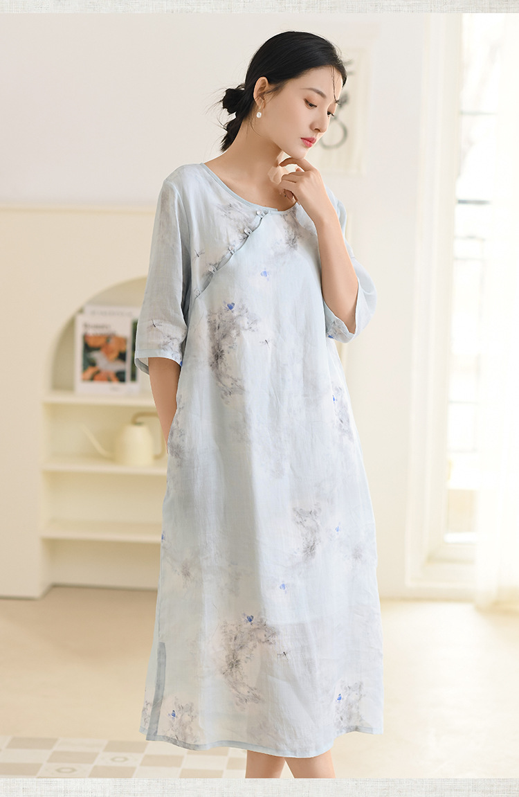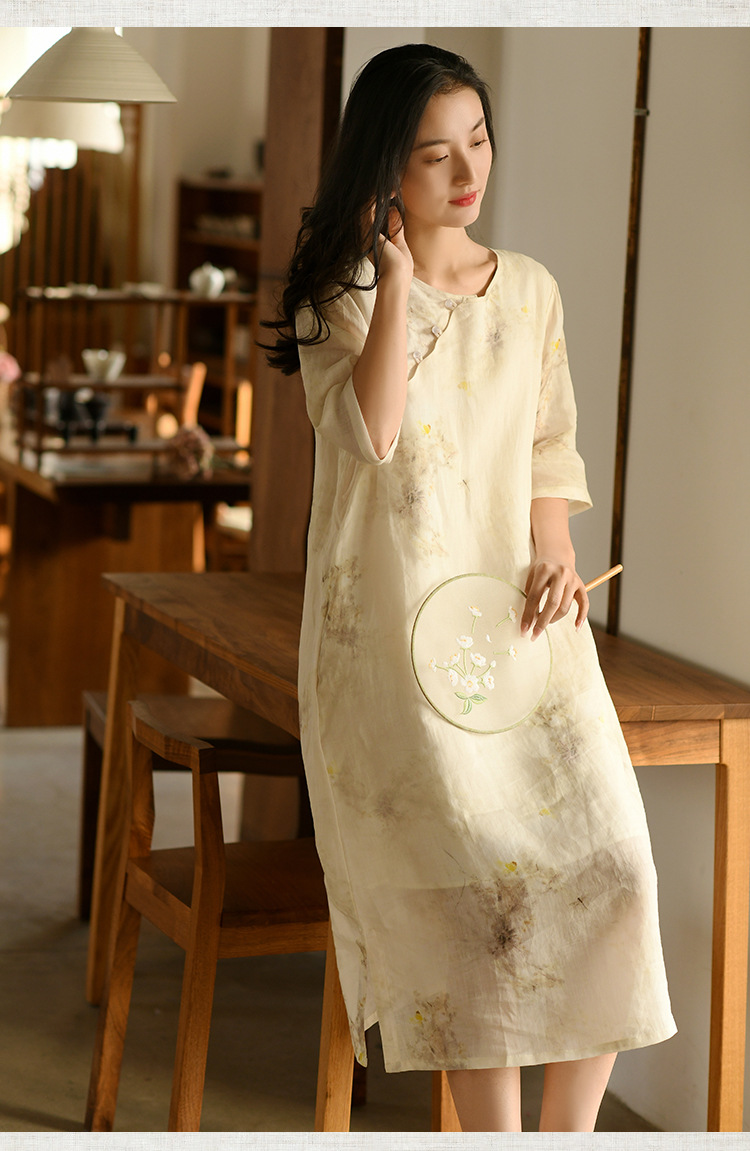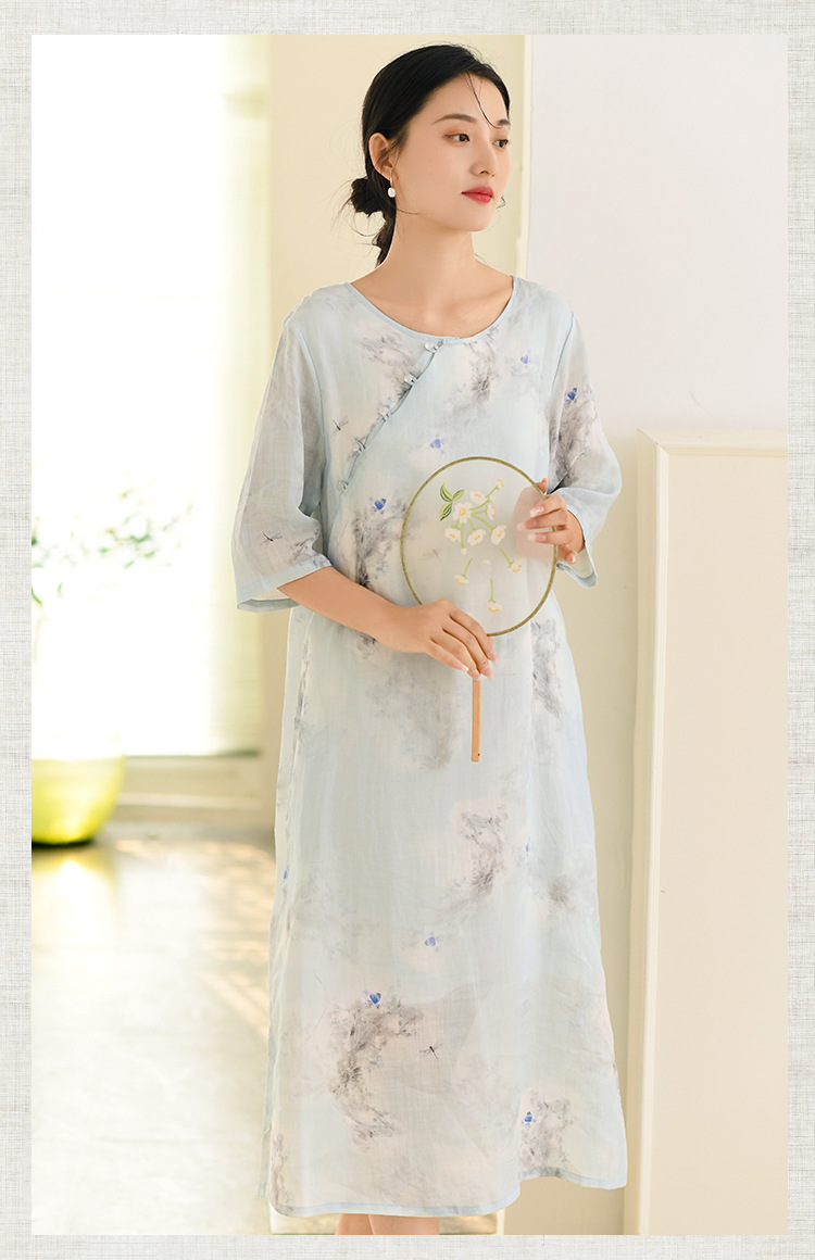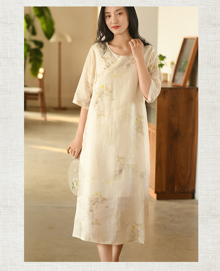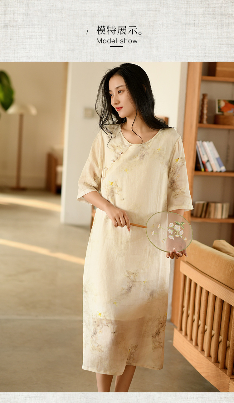 면과 린넨 여성 의류 2023 봄과 여름 새로운 빈티지 원피스 새로운 중국 라미 수정 치파오 중국 스타일 차 의류스토어 가기