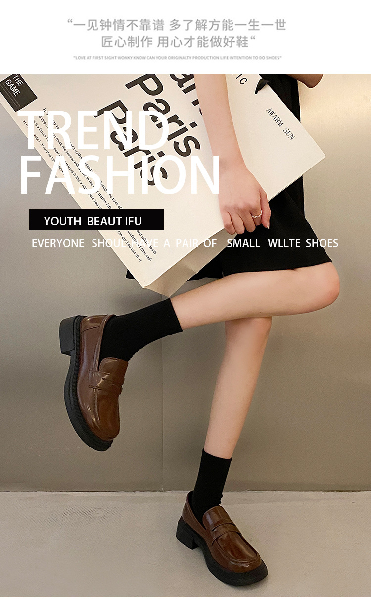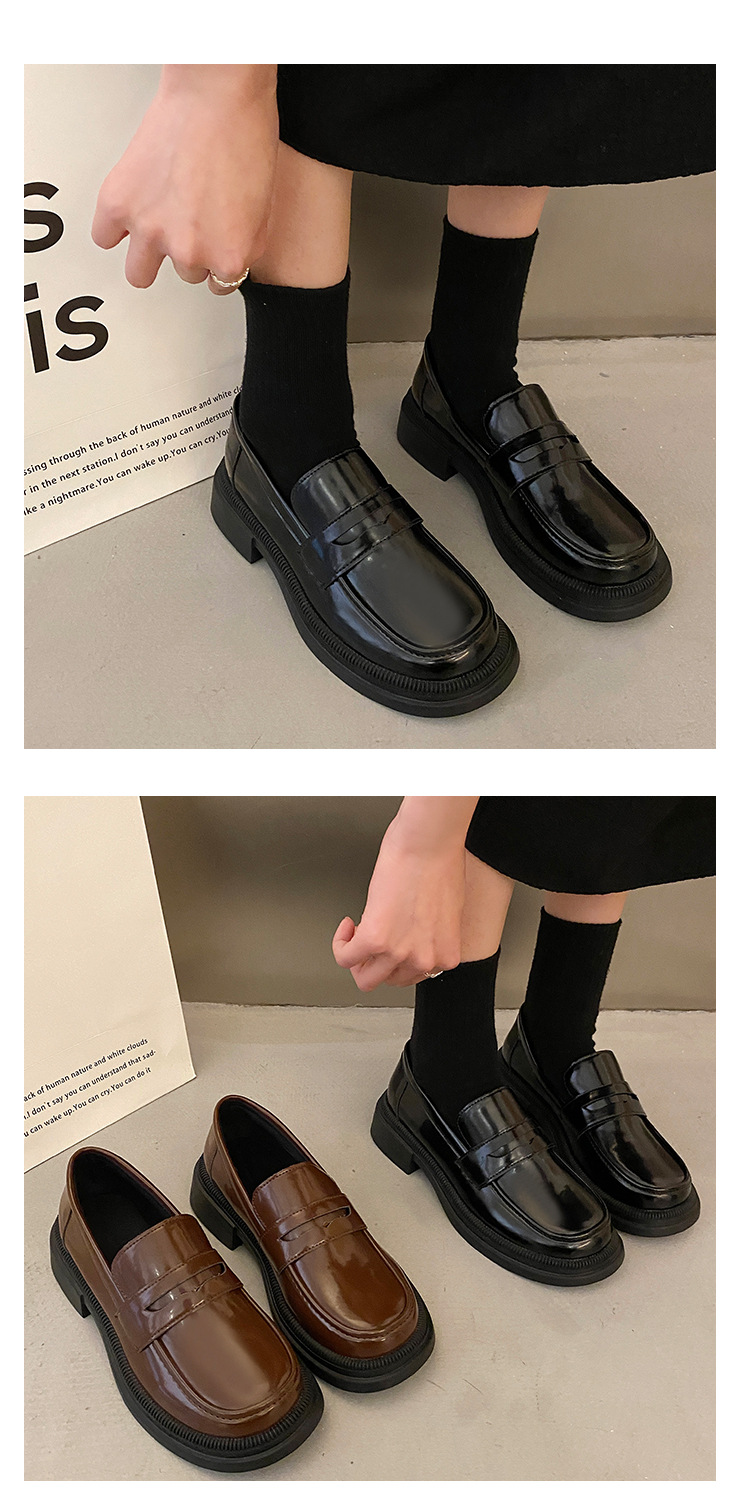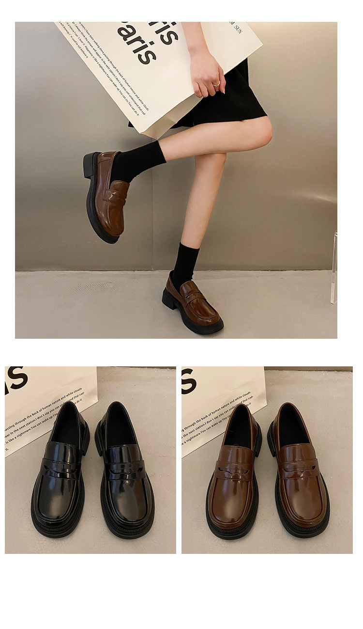 블랙 다크 브라운 작은 가죽 신발 여성의 영국 스타일 2023 봄 새로운 복고풍 두꺼운 힐 슬립 온 패션 로퍼 여성용스토어 가기