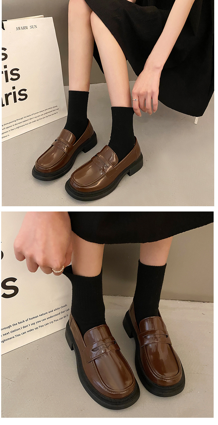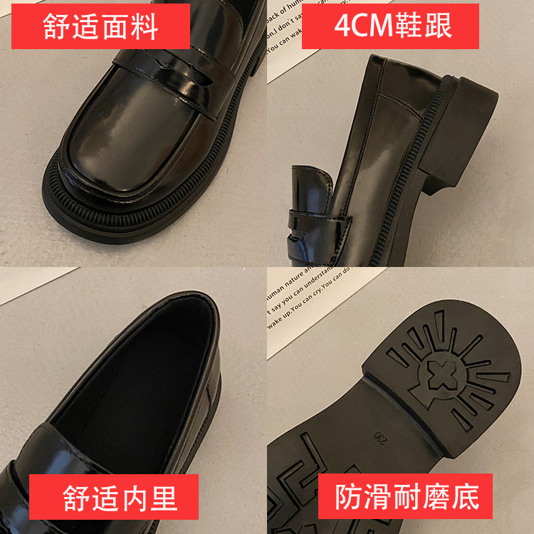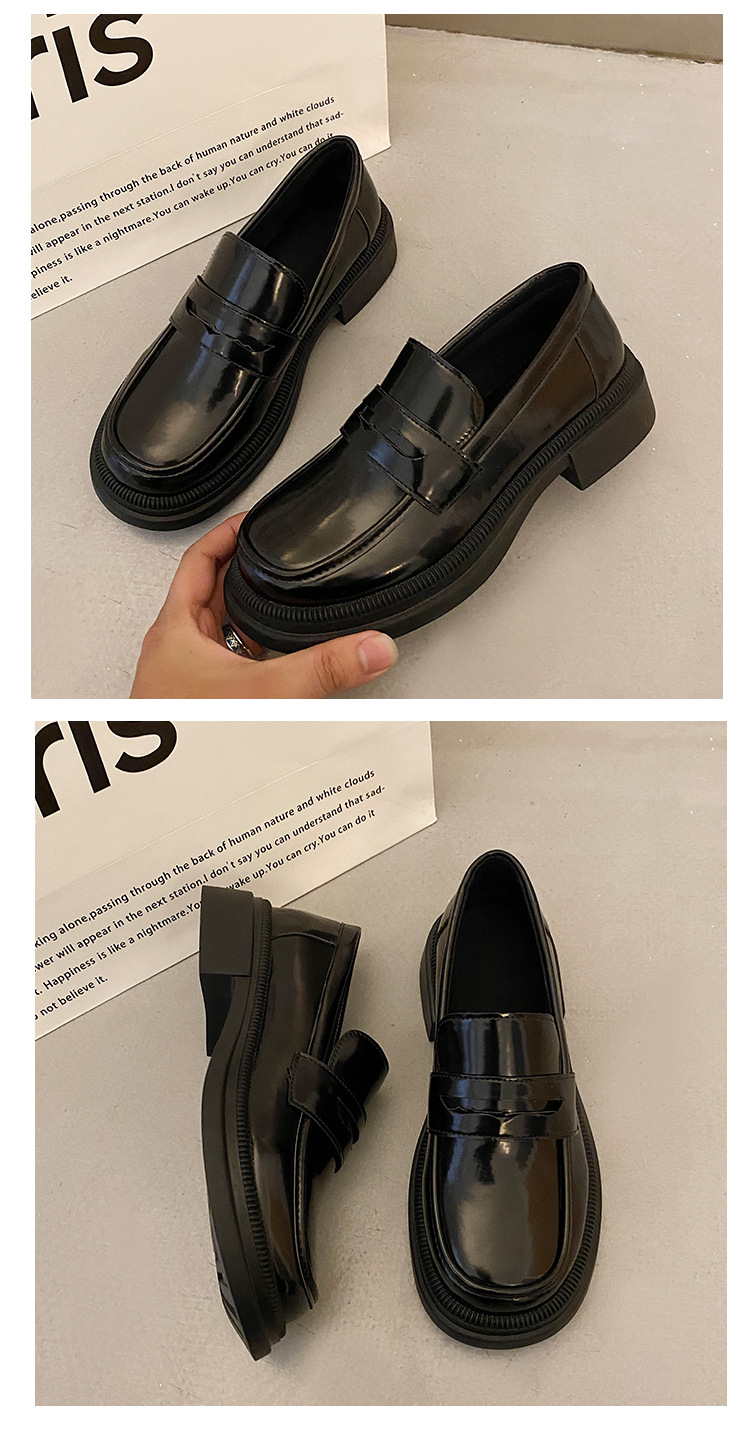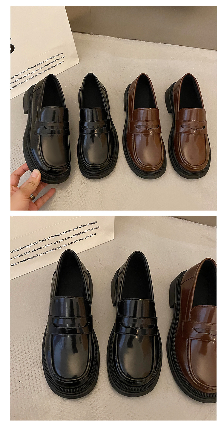 블랙 다크 브라운 작은 가죽 신발 여성의 영국 스타일 2023 봄 새로운 복고풍 두꺼운 힐 슬립 온 패션 로퍼 여성용스토어 가기