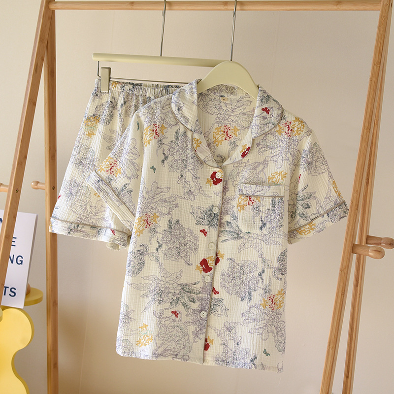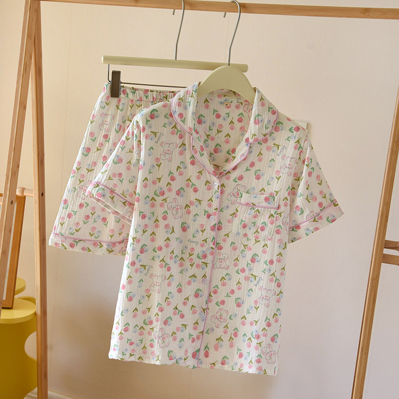 면 짧은 소매 반바지 여자의 세트 봄과 여름 얇은 플러스 사이즈 면 가정 옷 느슨한 통기성 땀 흡수 통기성스토어 가기