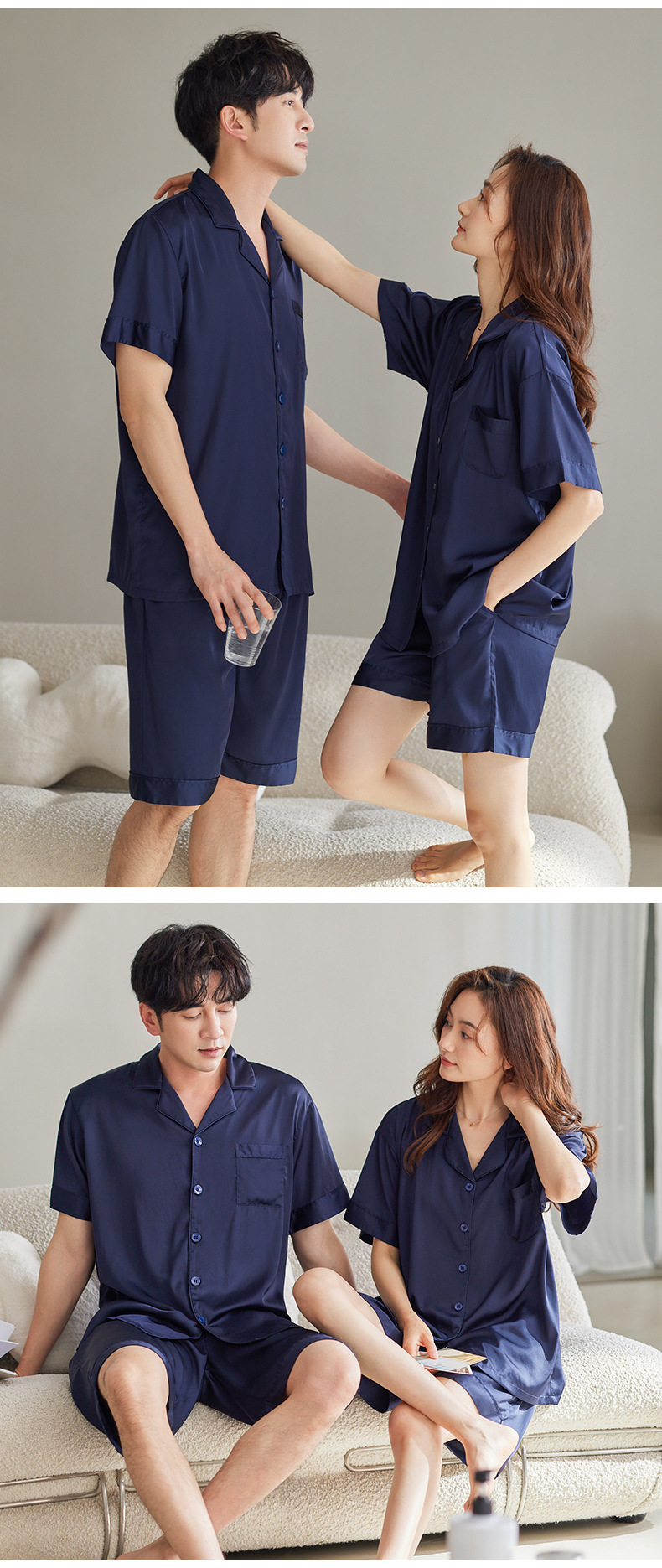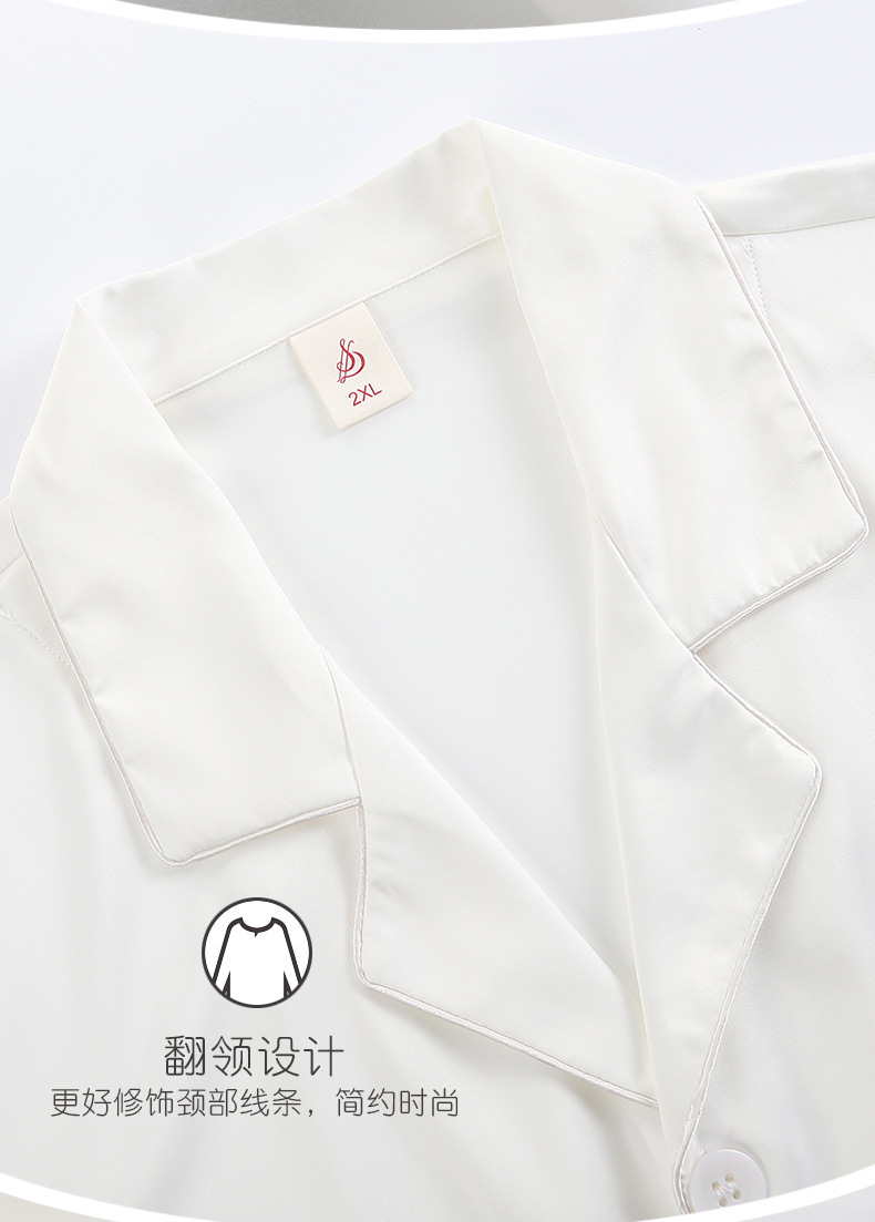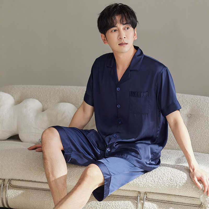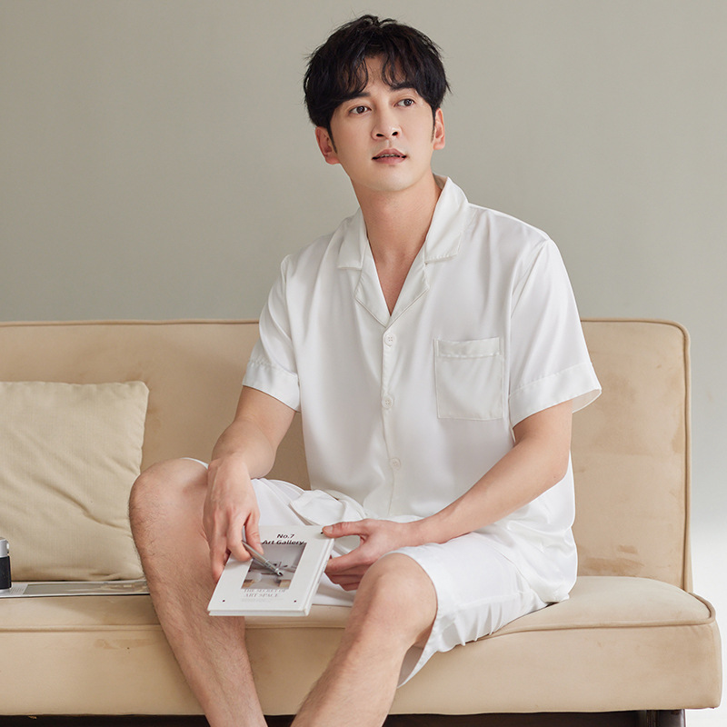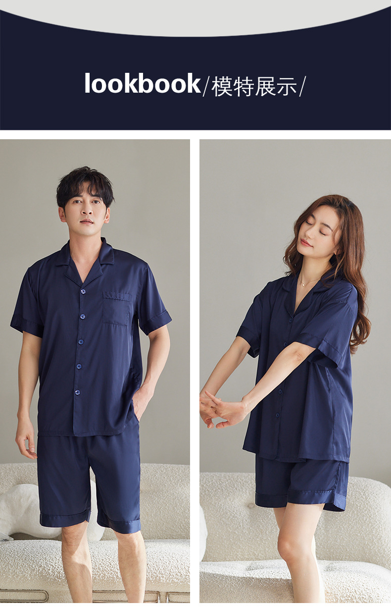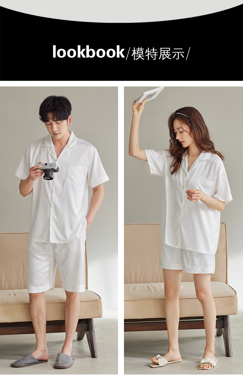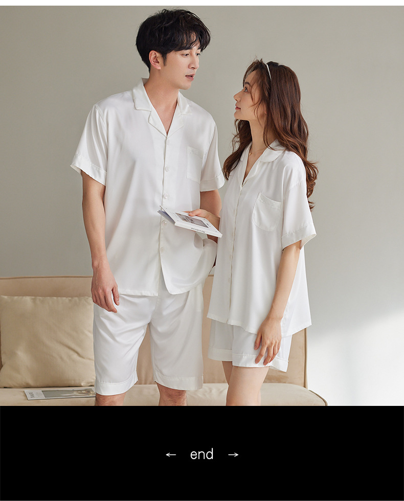 커플 잠옷 여성용 아이스 실크 반팔 가정복 봄과 여름 한국식 단색 실크 반바지 여름 세트