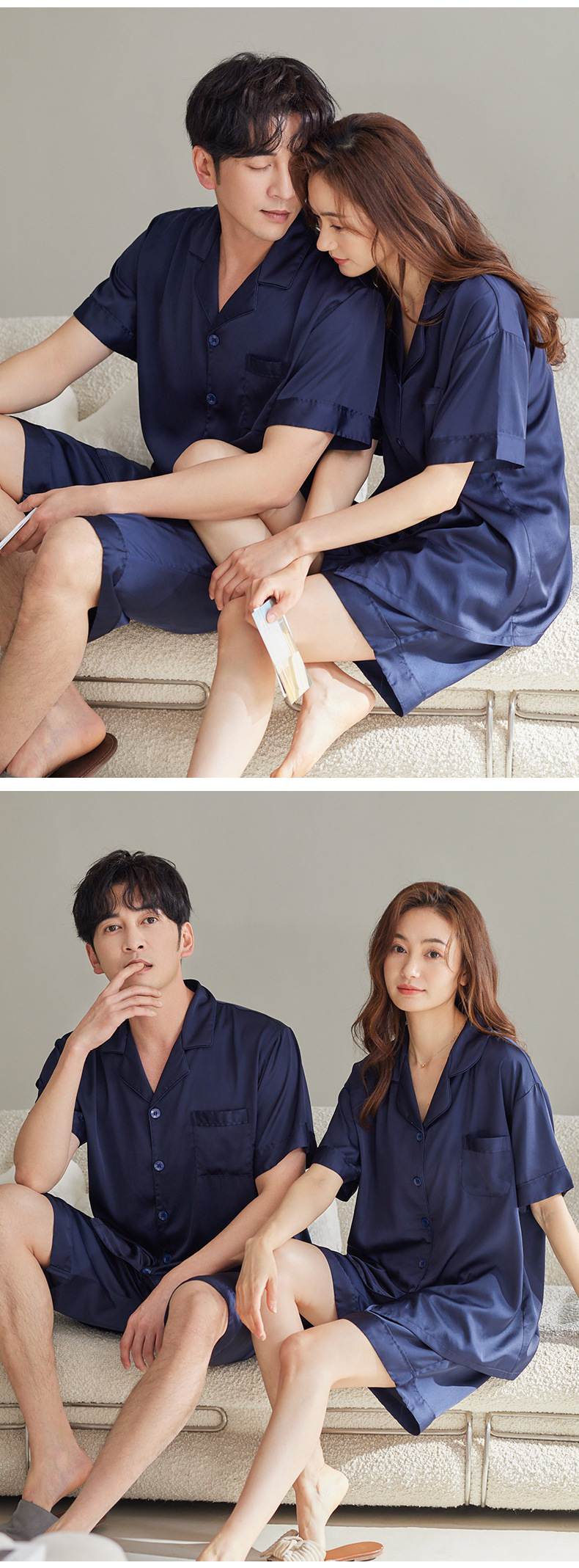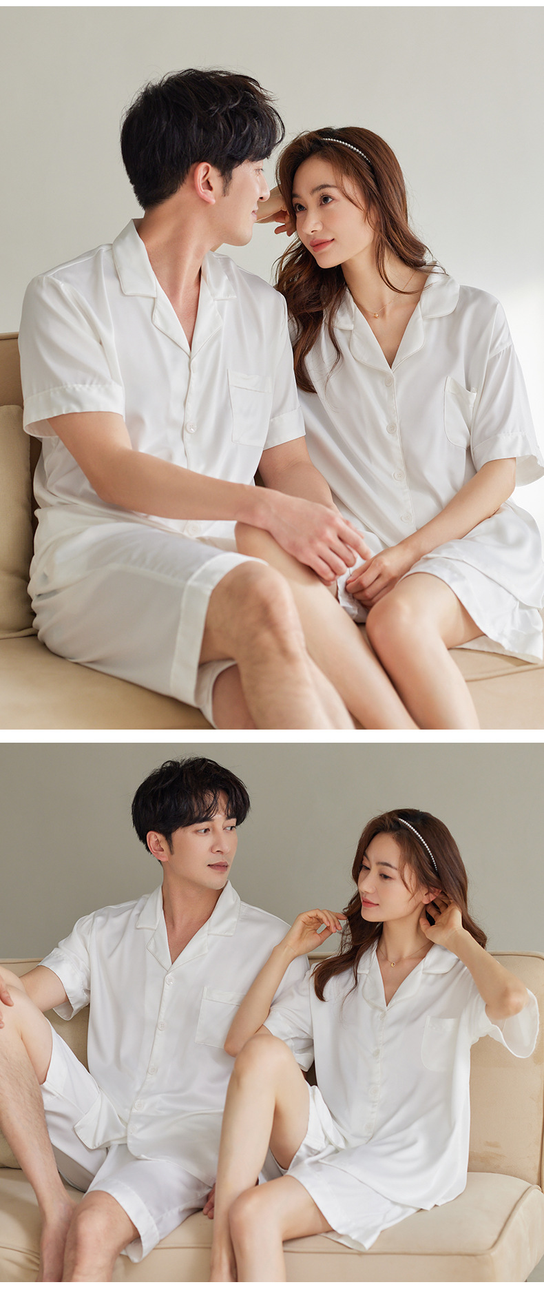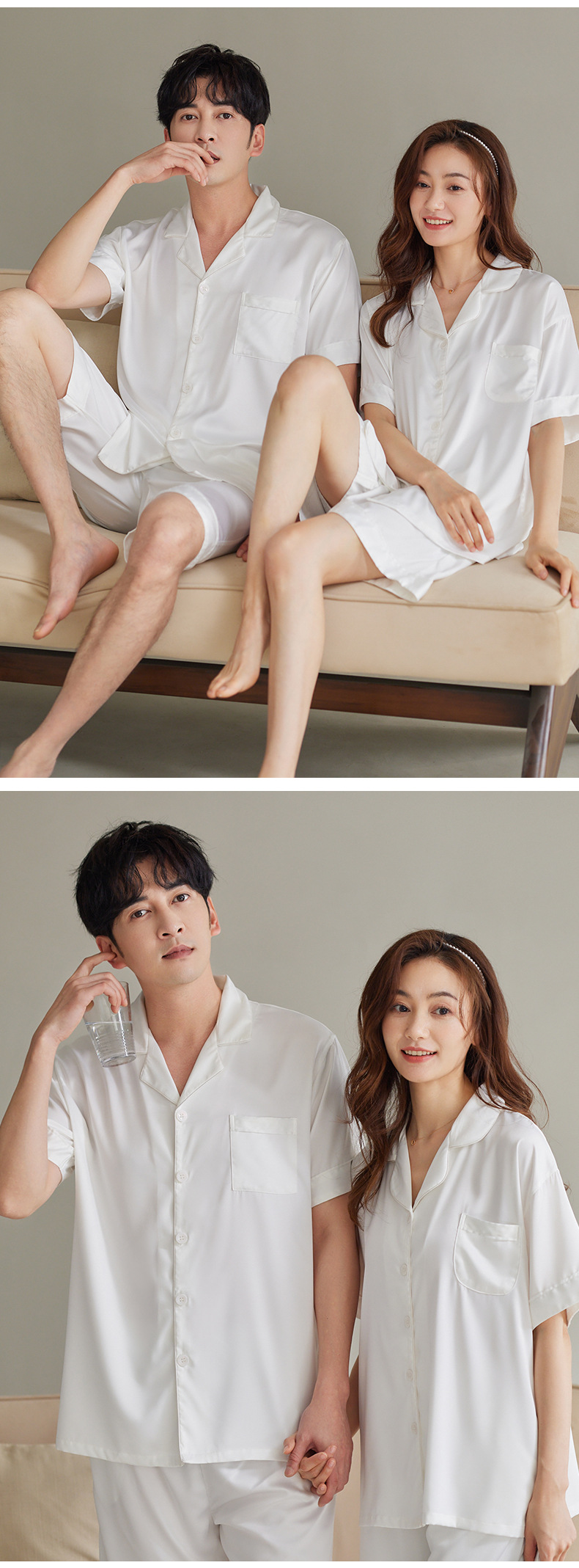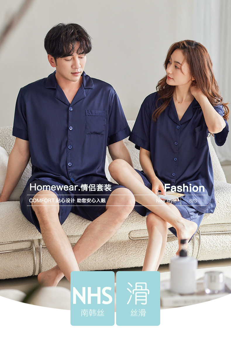 커플 잠옷 여성용 아이스 실크 반팔 가정복 봄과 여름 한국식 단색 실크 반바지 여름 세트스토어 가기