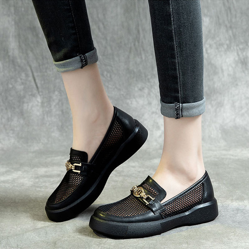 플랫 메쉬 신발 여성용 여름 새로운 통기성 중공 메쉬 로퍼 탑 레이어 소가죽 소프트 하단 로퍼