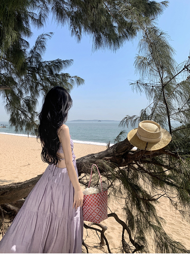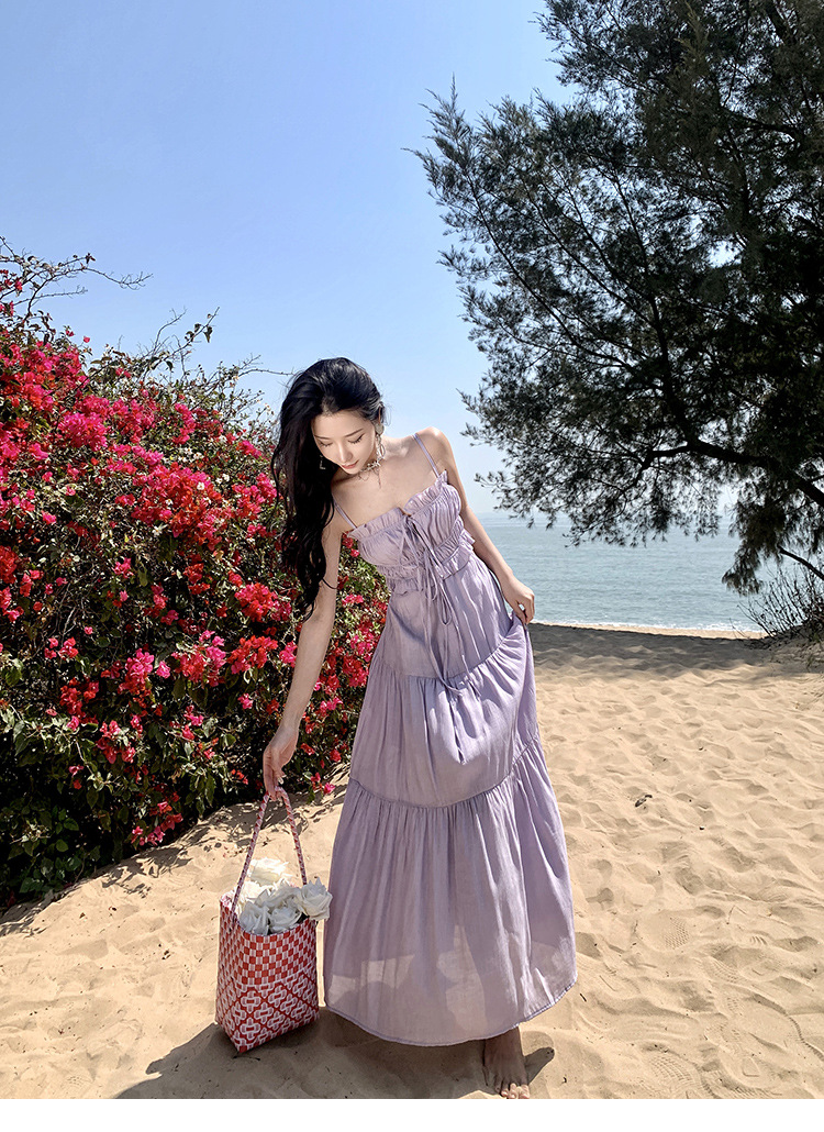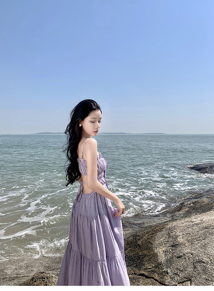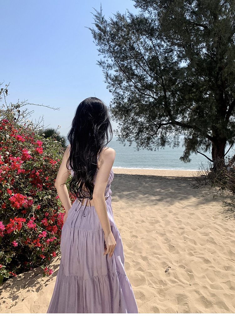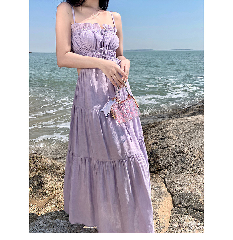 2023 여름 요정 휴가 스타일 긴 원피스 포옹 큰 치마 노출 허리 프랑스어 스트랩 등이없는 원피스