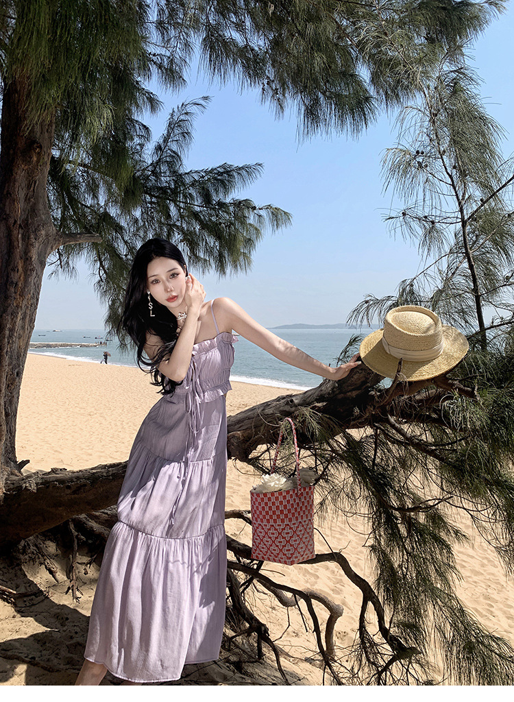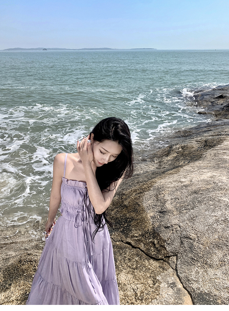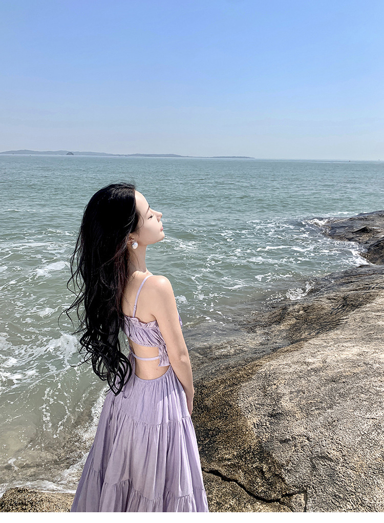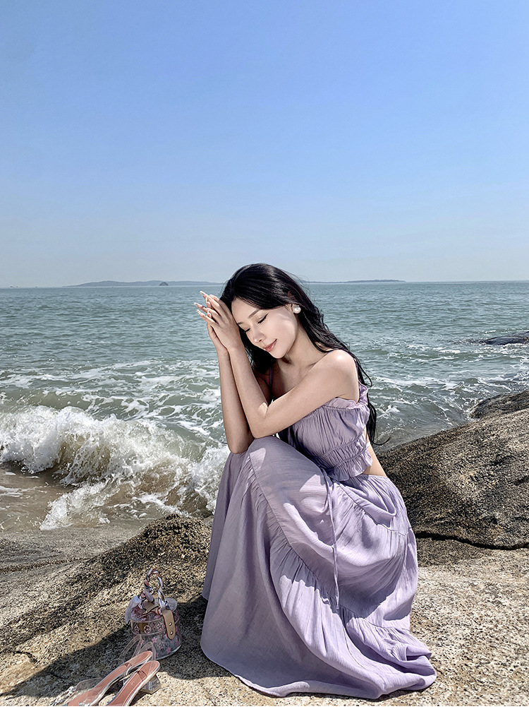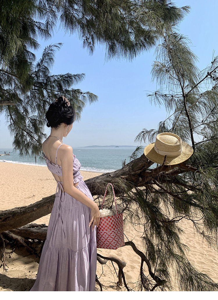 2023 여름 요정 휴가 스타일 긴 원피스 포옹 큰 치마 노출 허리 프랑스어 스트랩 등이없는 원피스
