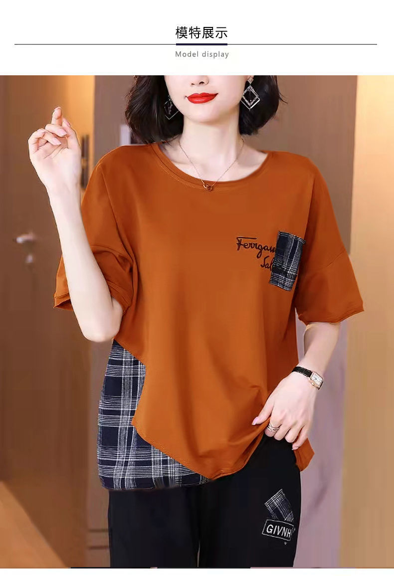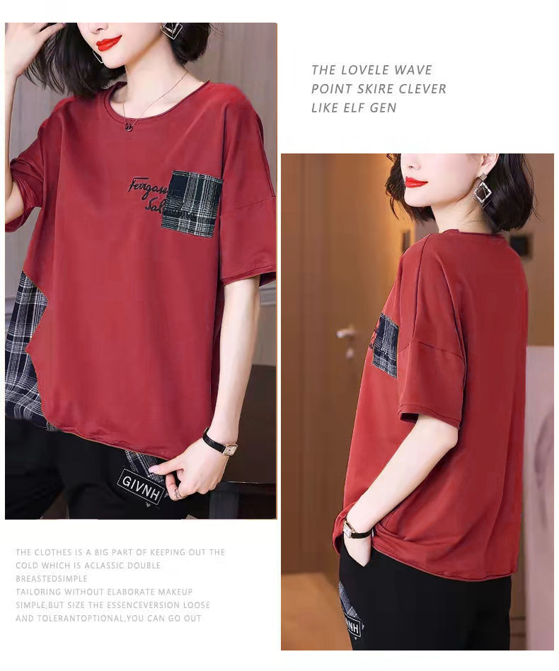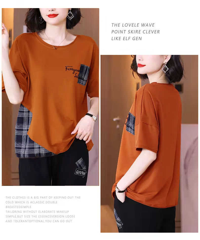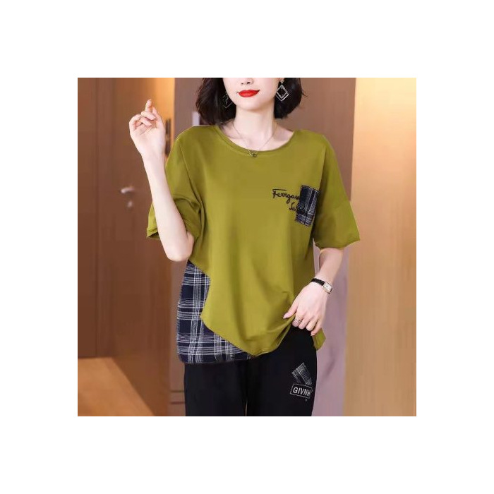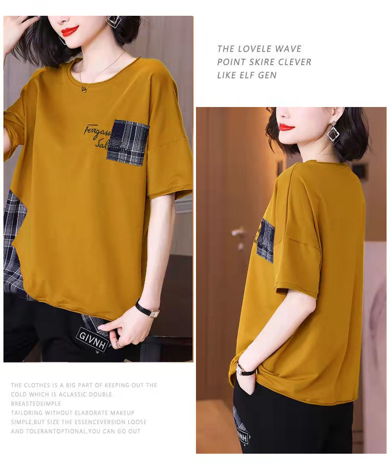 플러스 사이즈 반팔 가짜 투피스 탑 여성용 배꼽 덮기 슬리밍 모든 매치 라운드 넥 티셔츠 여름 얇은 지방 MMT 셔츠 8206