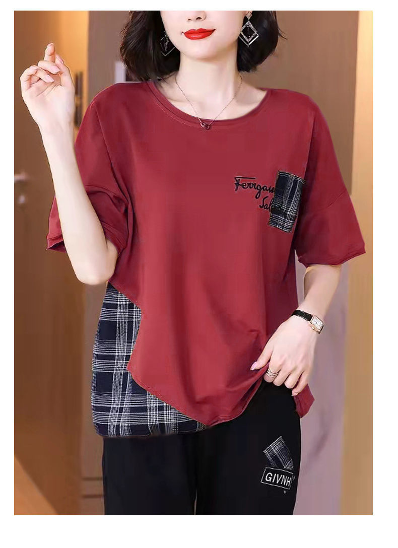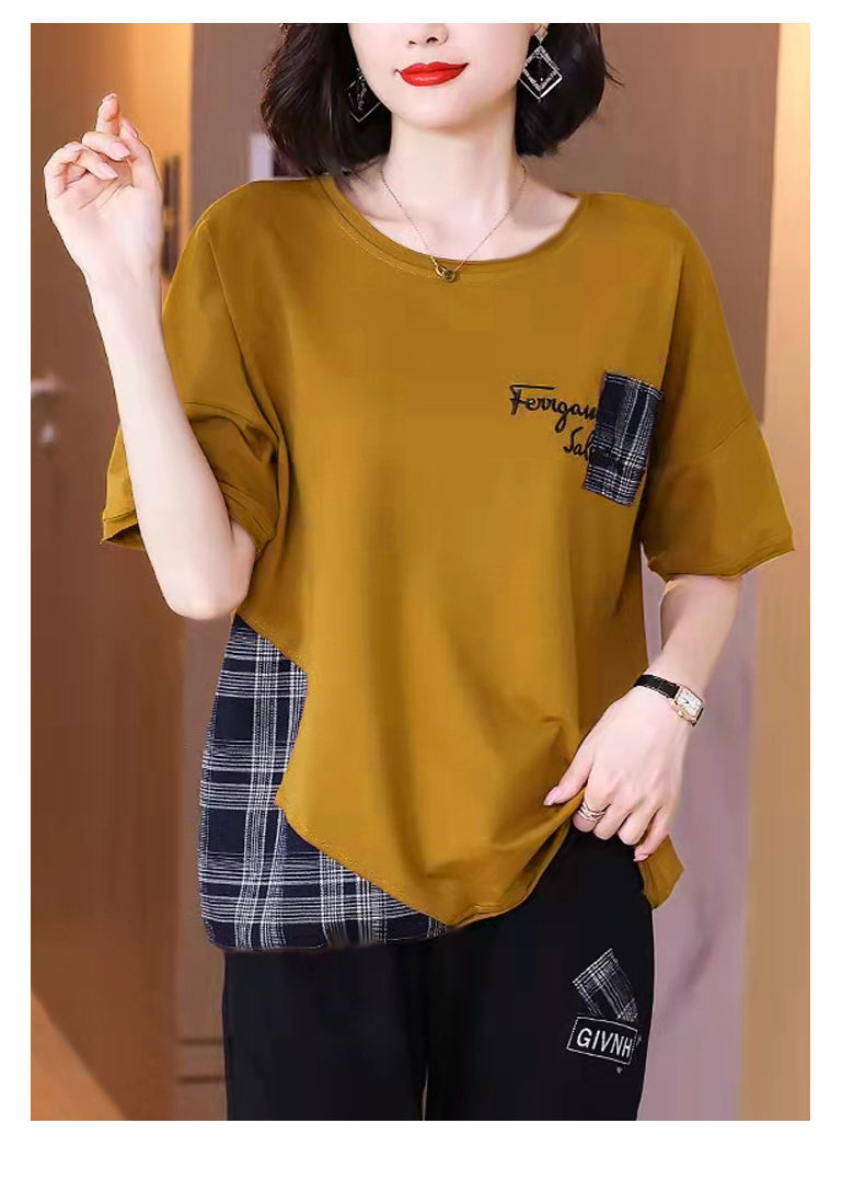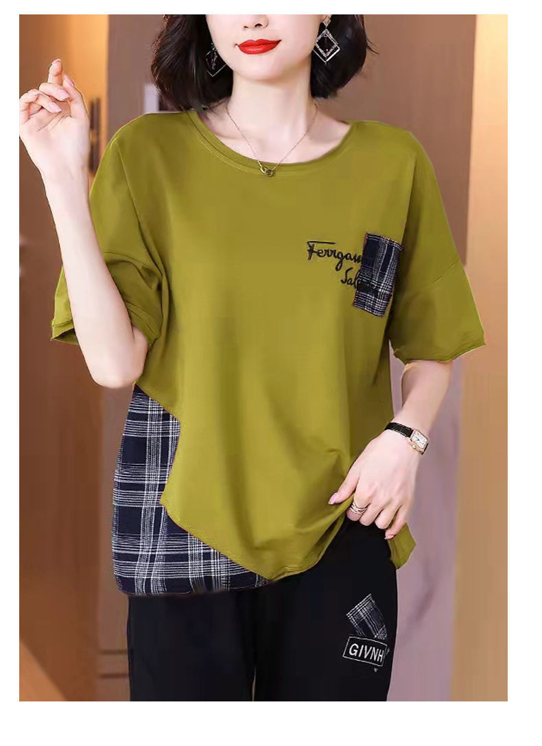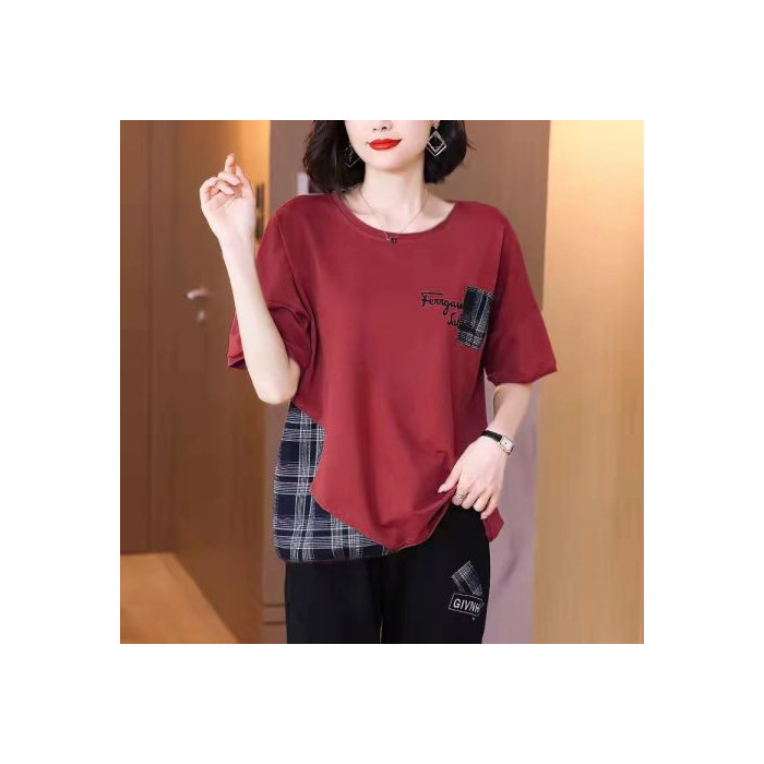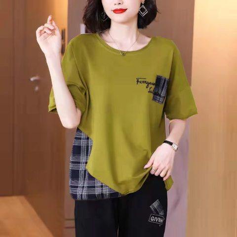 플러스 사이즈 반팔 가짜 투피스 탑 여성용 배꼽 덮기 슬리밍 모든 매치 라운드 넥 티셔츠 여름 얇은 지방 MMT 셔츠 8206