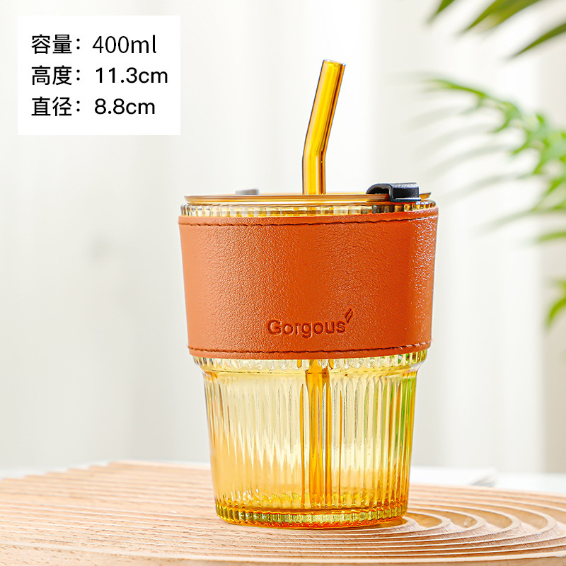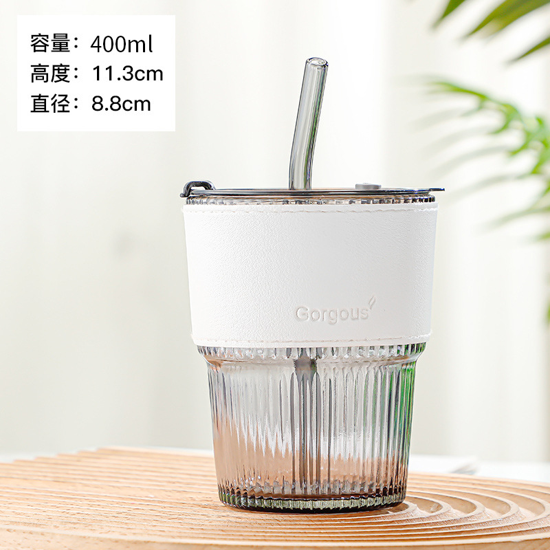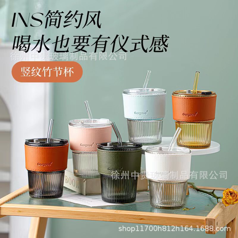뚜껑이있는 새로운 스타일 수직 곡물 슬러브 컵 높은 색상 가치 밀짚 유리 컵 인터넷 연예인 선물 컵 사무실 커피 컵