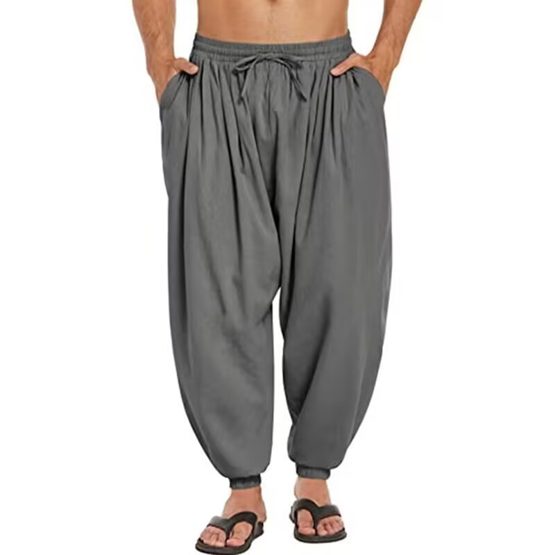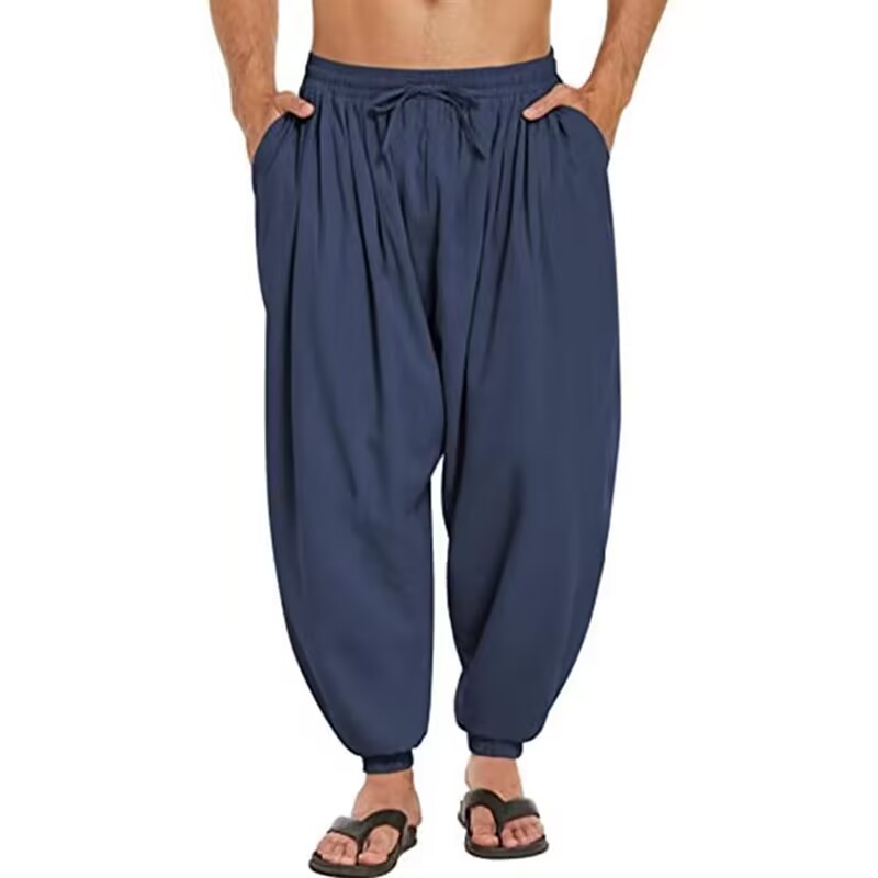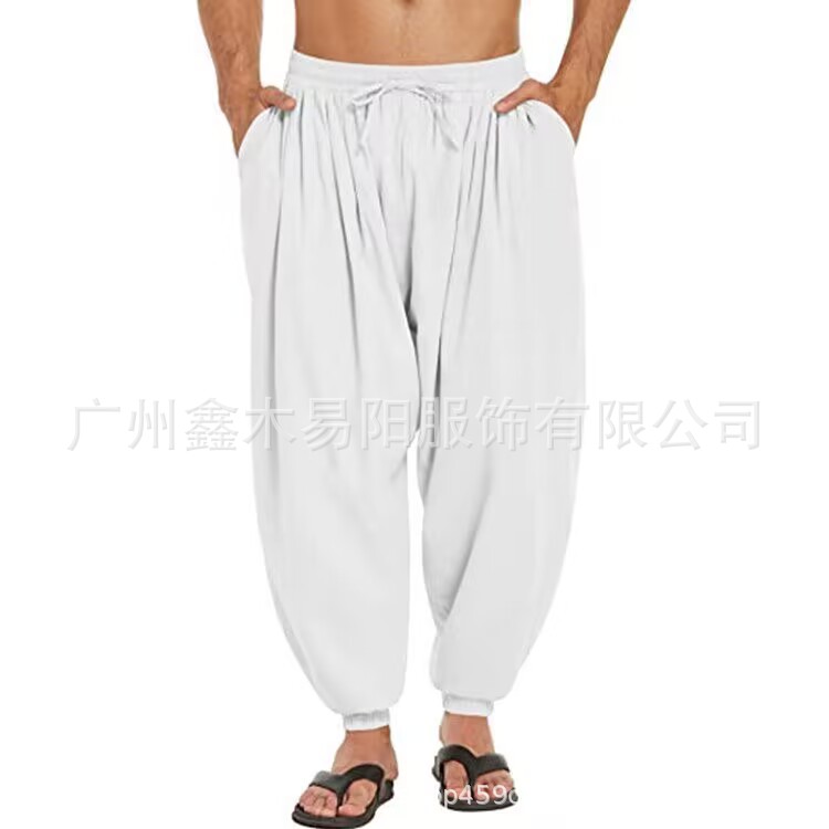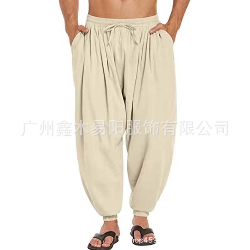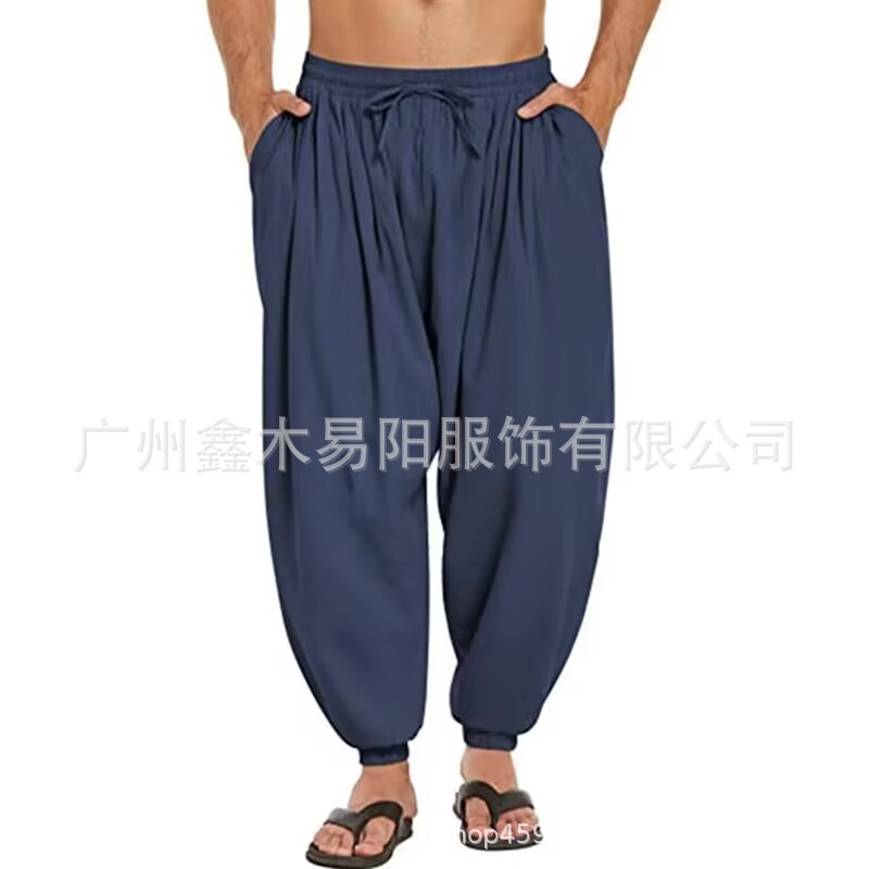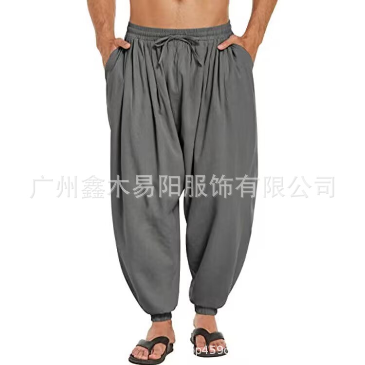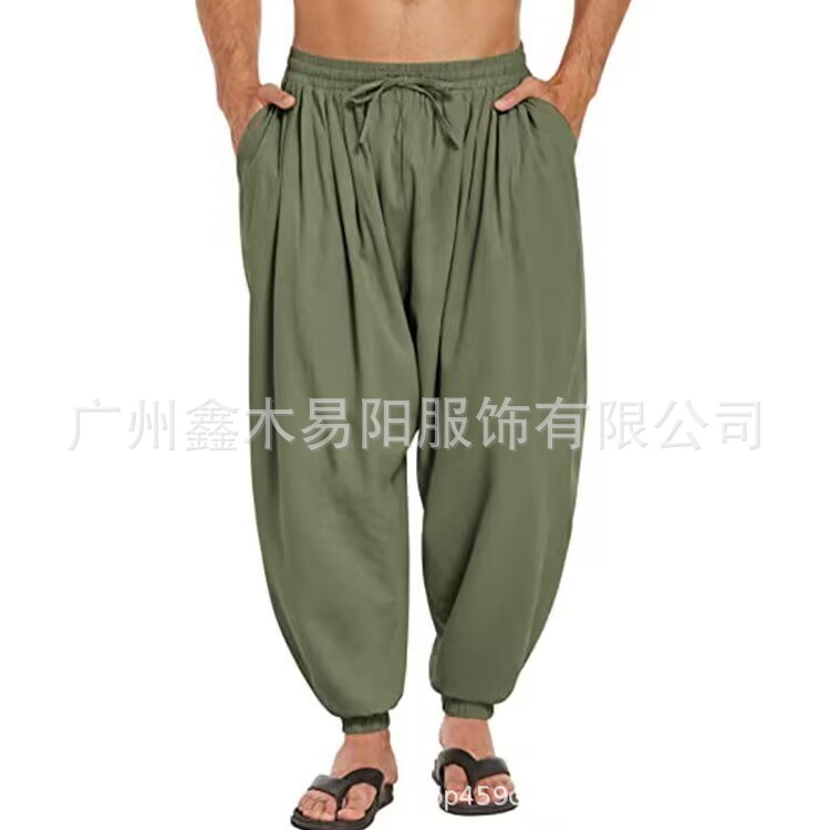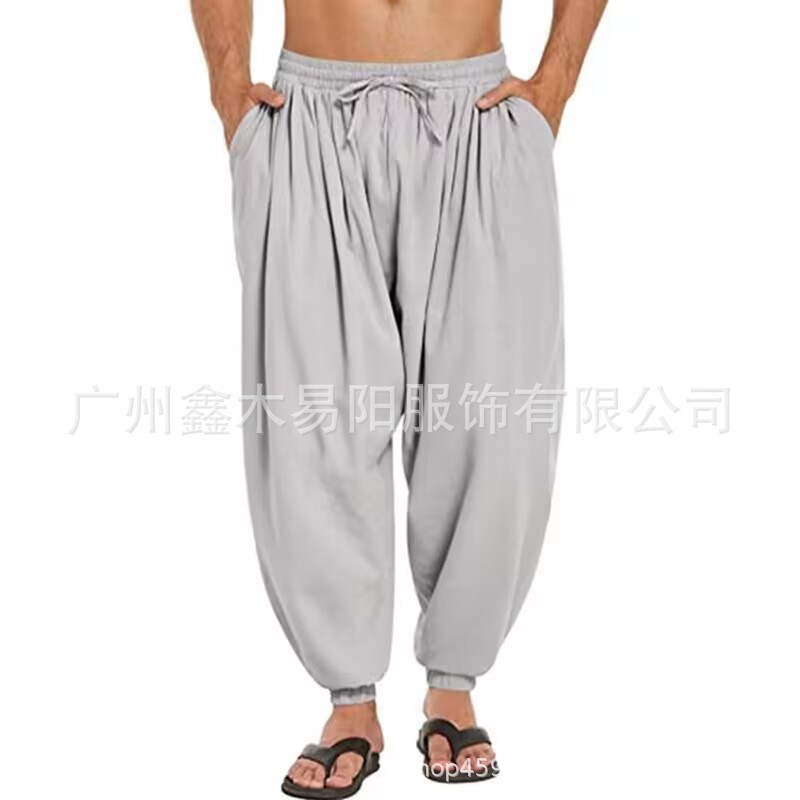 국경 간 유럽 및 미국 아마존 AliExpress 독립 스테이션 단색 면 및 린넨 드로우 스트링 포켓 탄성 남성 캐주얼 바지스토어 가기