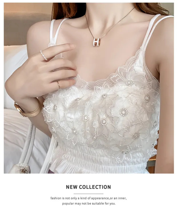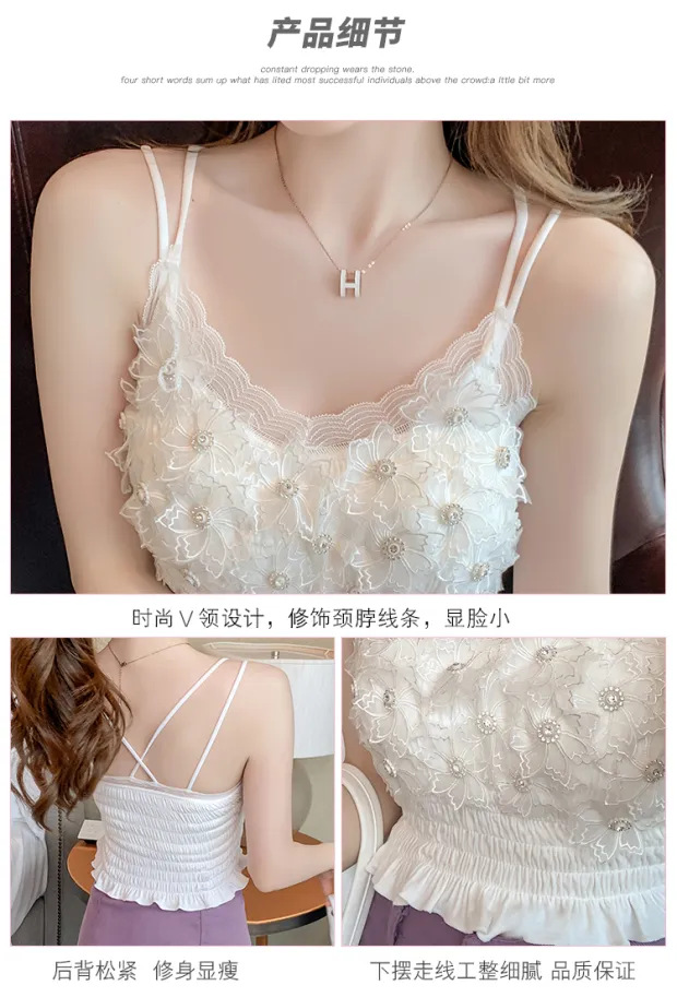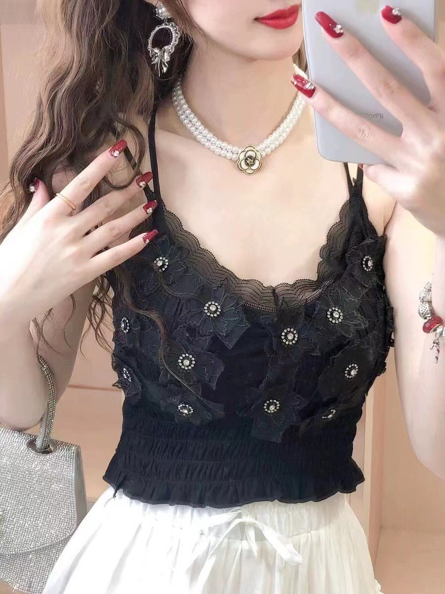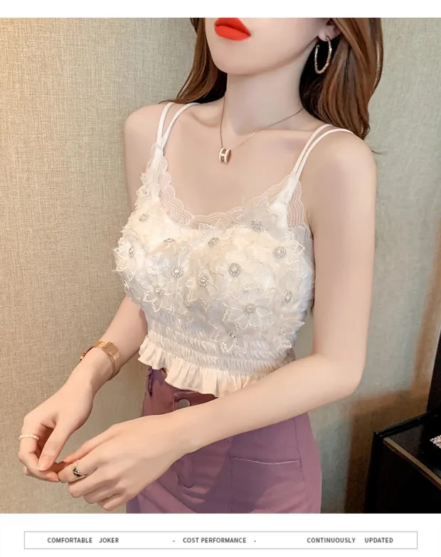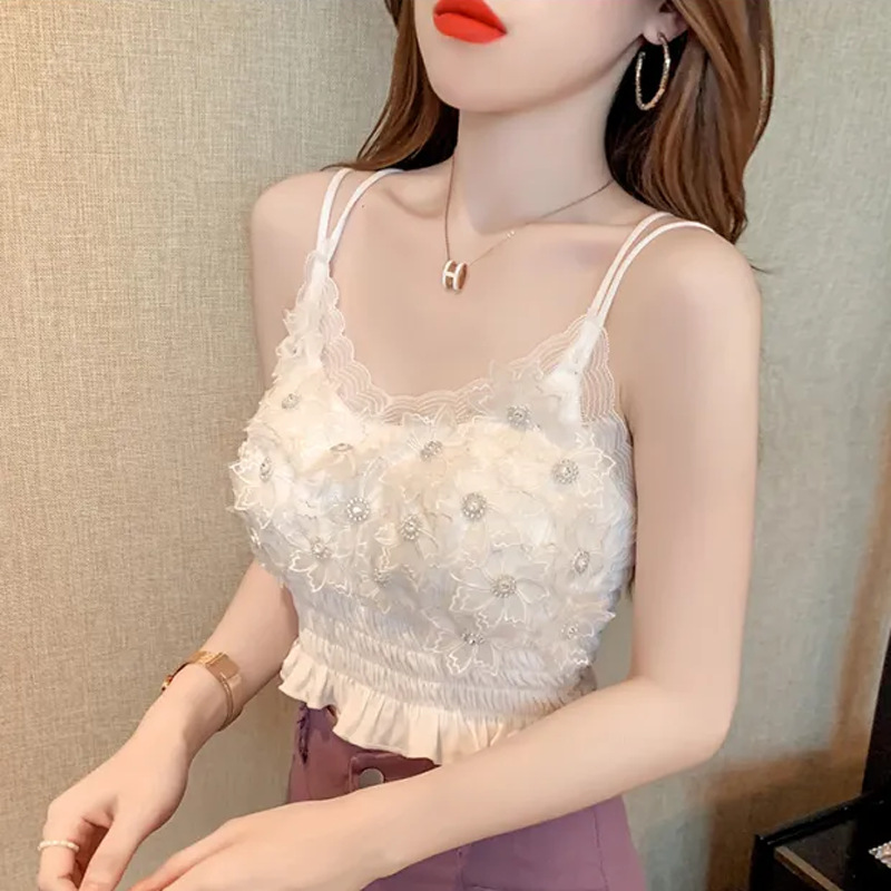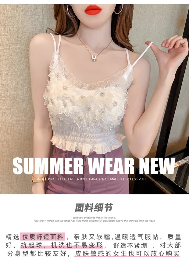 2024 다이아몬드 장식 꽃무늬 얇은 끈나시 여성 프렌치 스타일 독특한 외출복 가슴 패드 포함 섹시한 랩탑탑스토어 가기