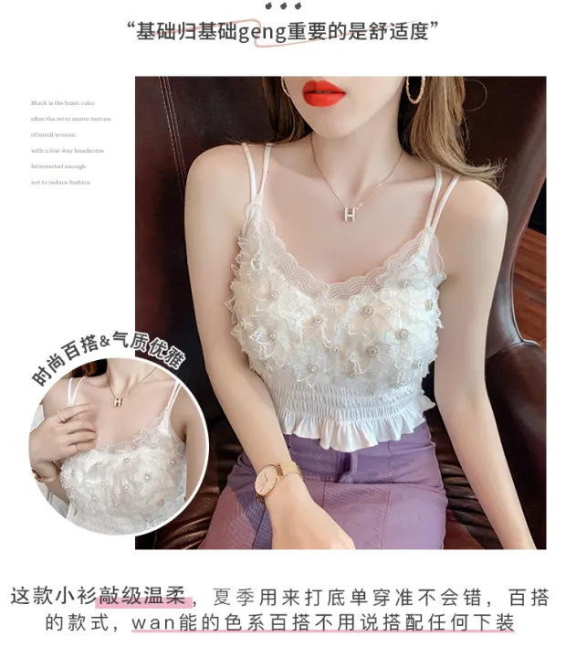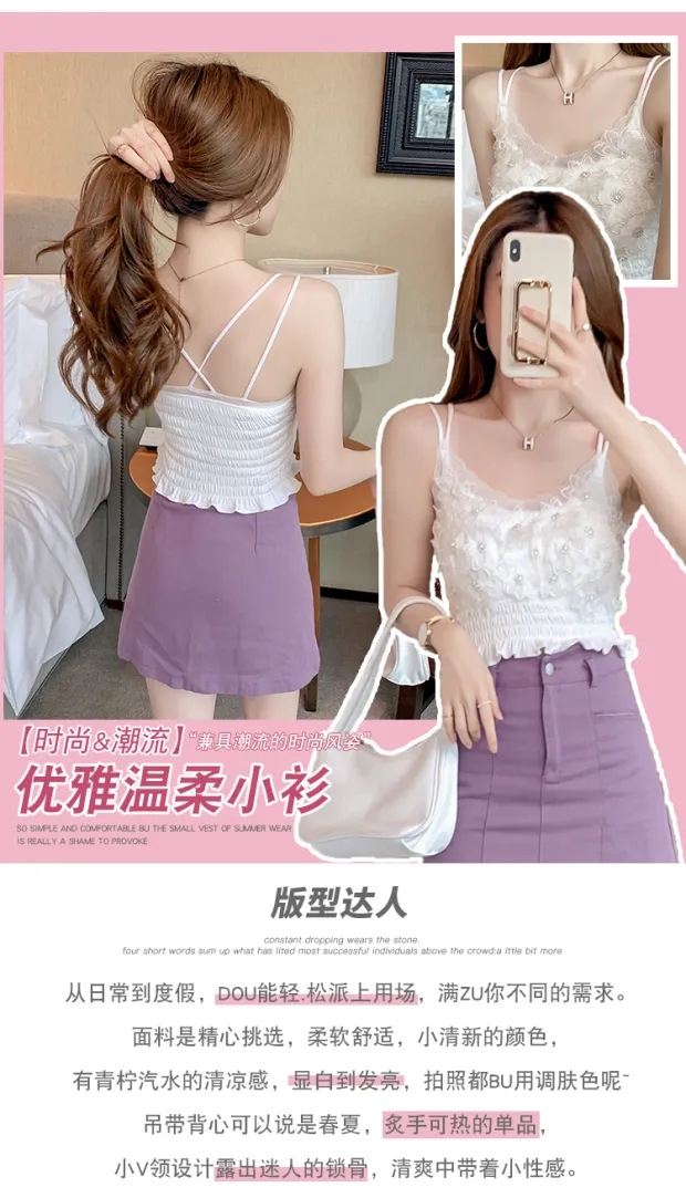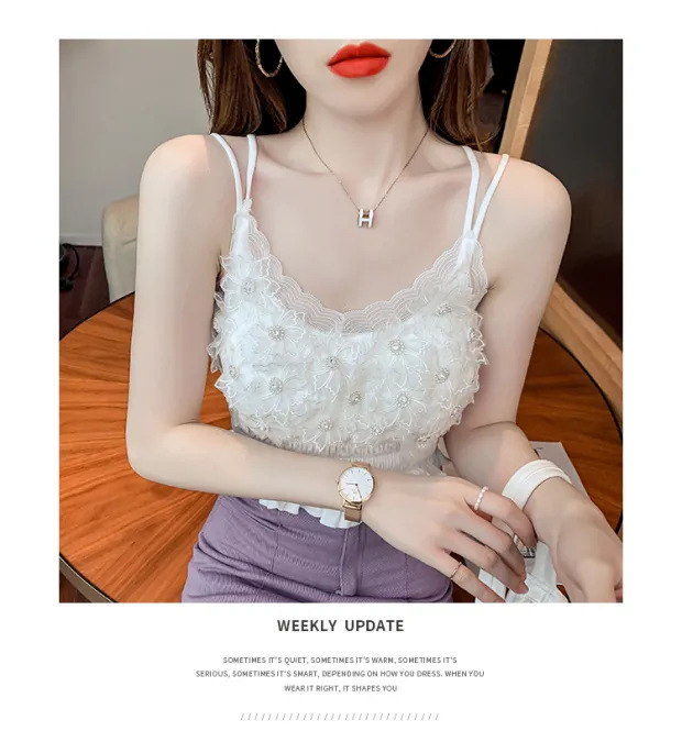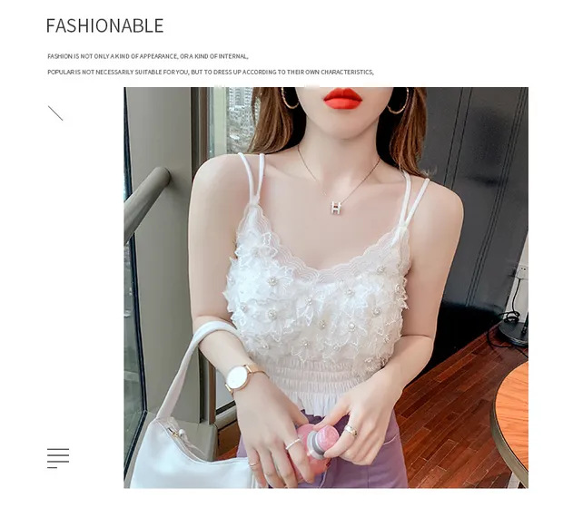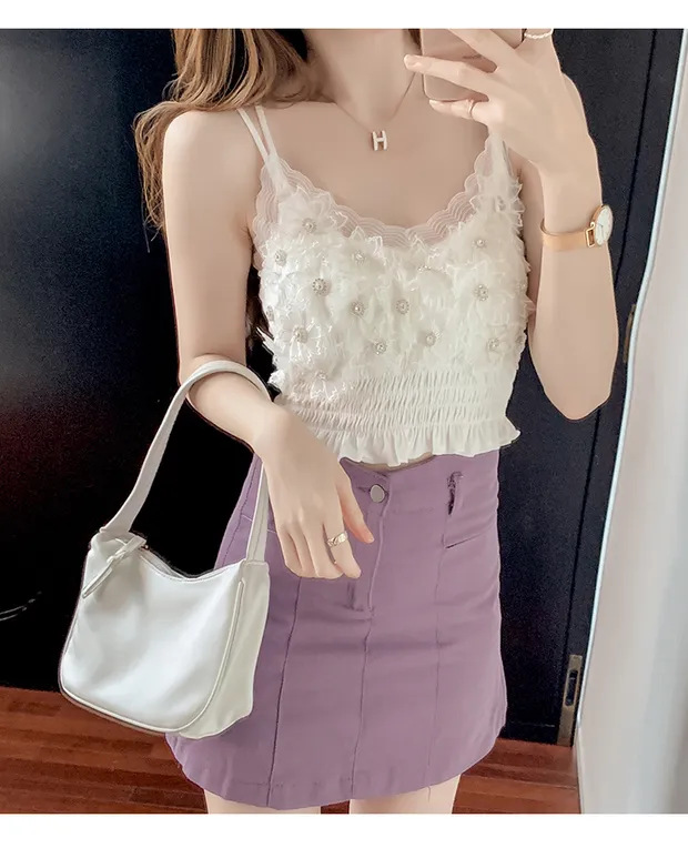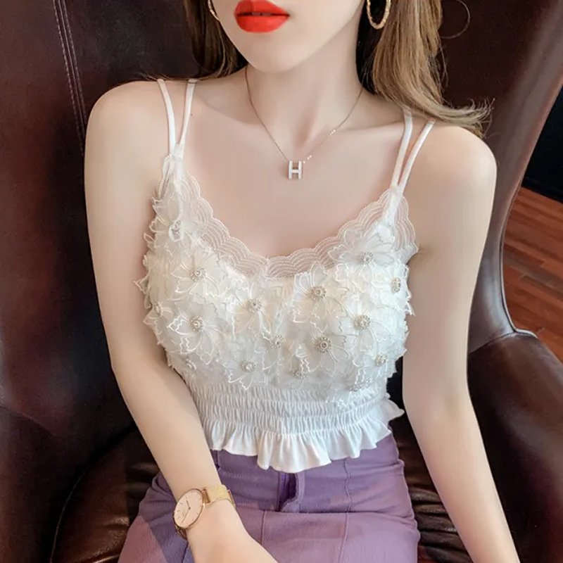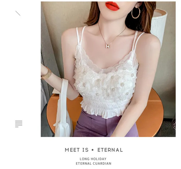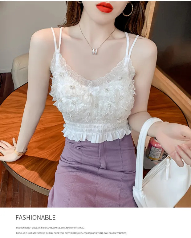 2024 다이아몬드 장식 꽃무늬 얇은 끈나시 여성 프렌치 스타일 독특한 외출복 가슴 패드 포함 섹시한 랩탑탑스토어 가기