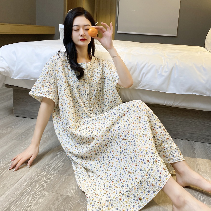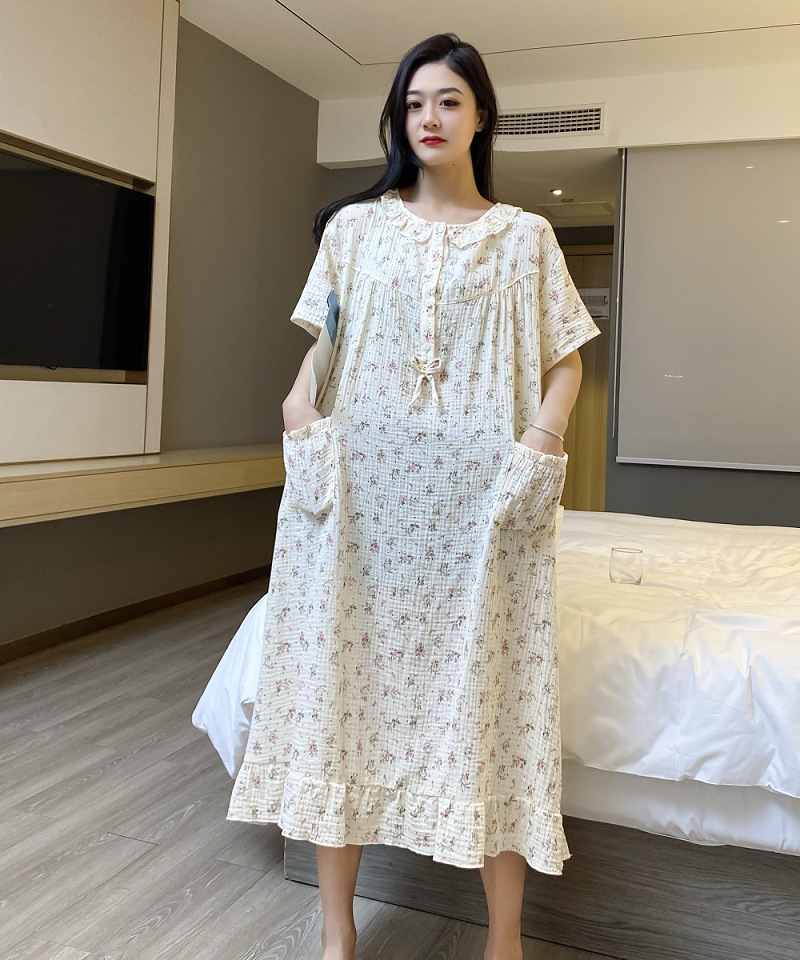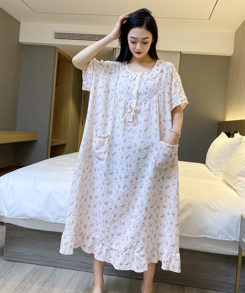 여름 새로운 반팔 잠옷 플러스 사이즈 홈 원피스 중간 길이 더블 레이어 원사 캐주얼 원피스 라운드 넥 인쇄 가정 옷스토어 가기