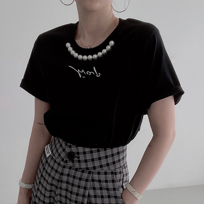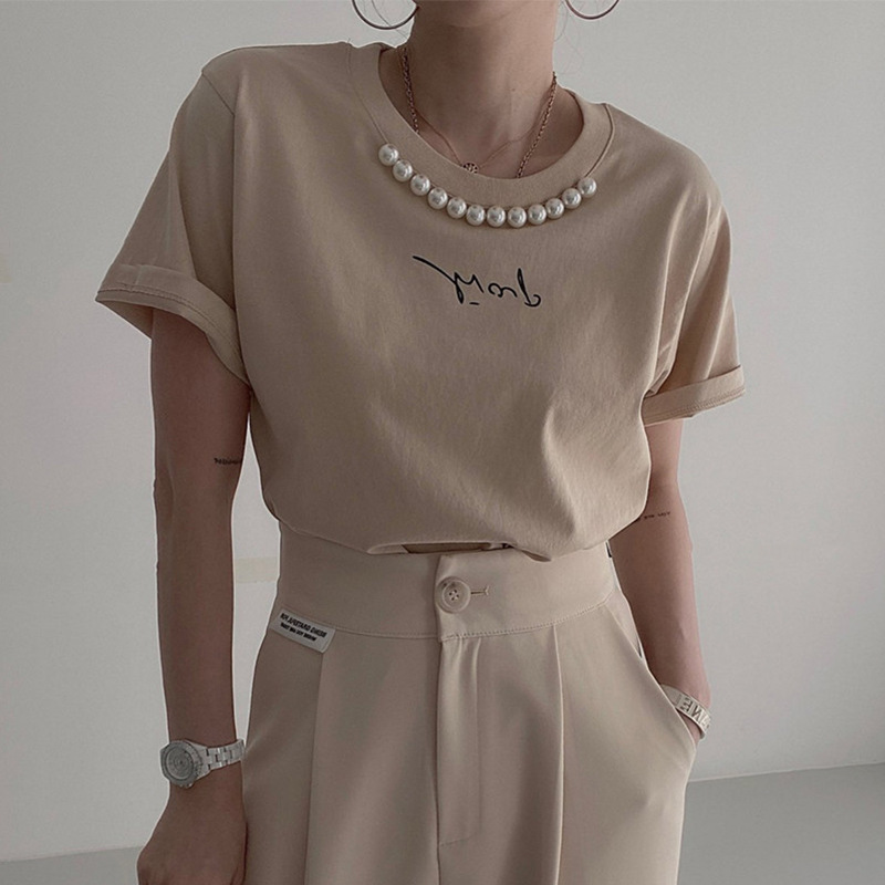 한국 세련된 우아한 심플한 라운드 넥 진주 장식 편지 인쇄 느슨한 모든 매치 짧은 소매 티셔츠 여성용 탑스토어 가기