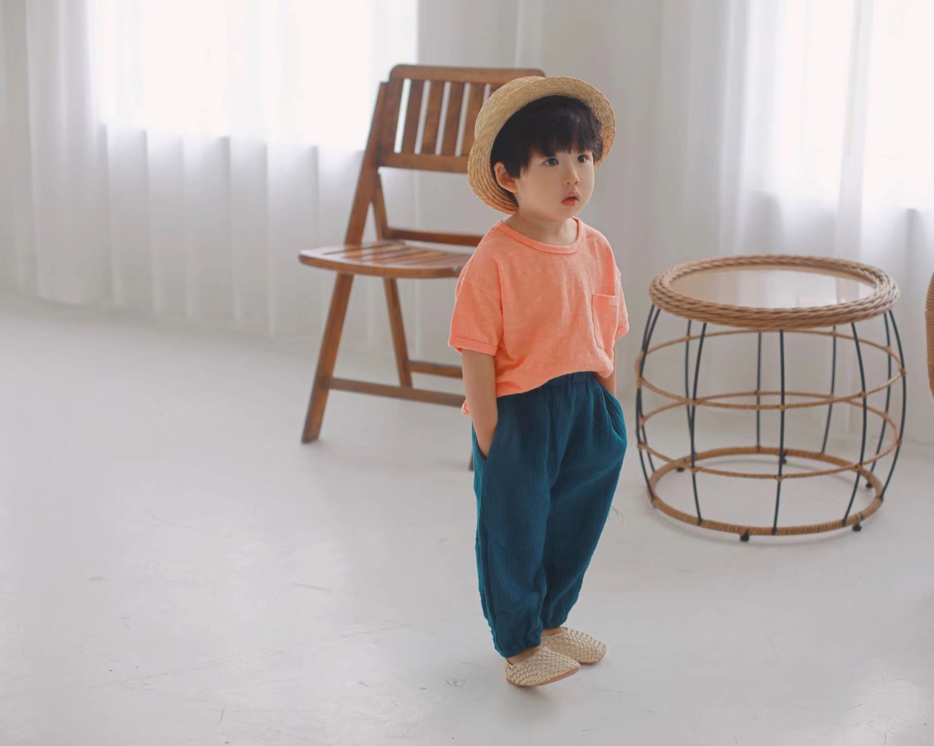 아동 의류 아동 한국식 모기 방지 바지 소년과 소녀를위한 여름 얇은 얇은 얇은 명주 그물 블루머 트렌디 웨스턴 스타일 순면 캐주얼 바지스토어 가기