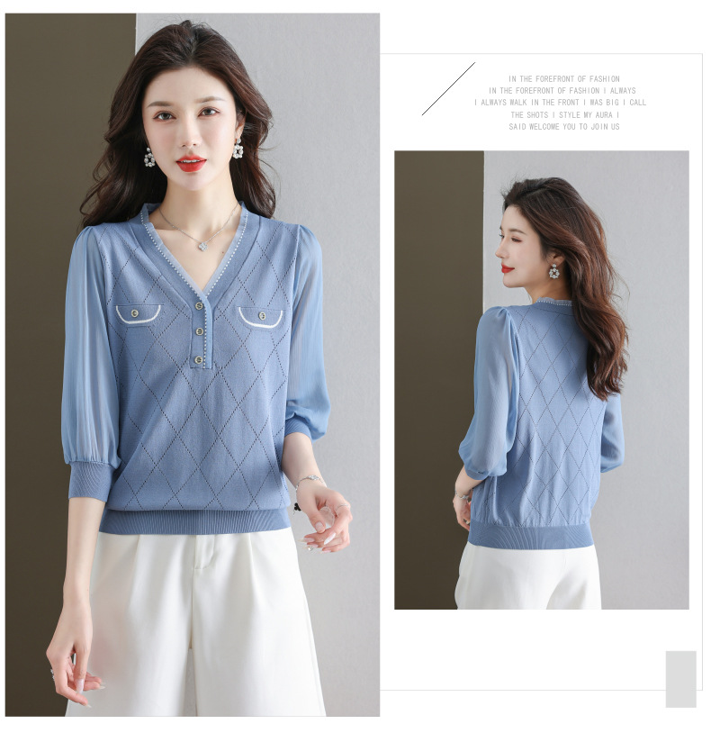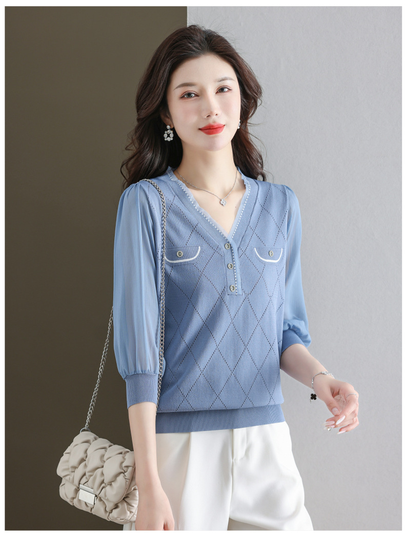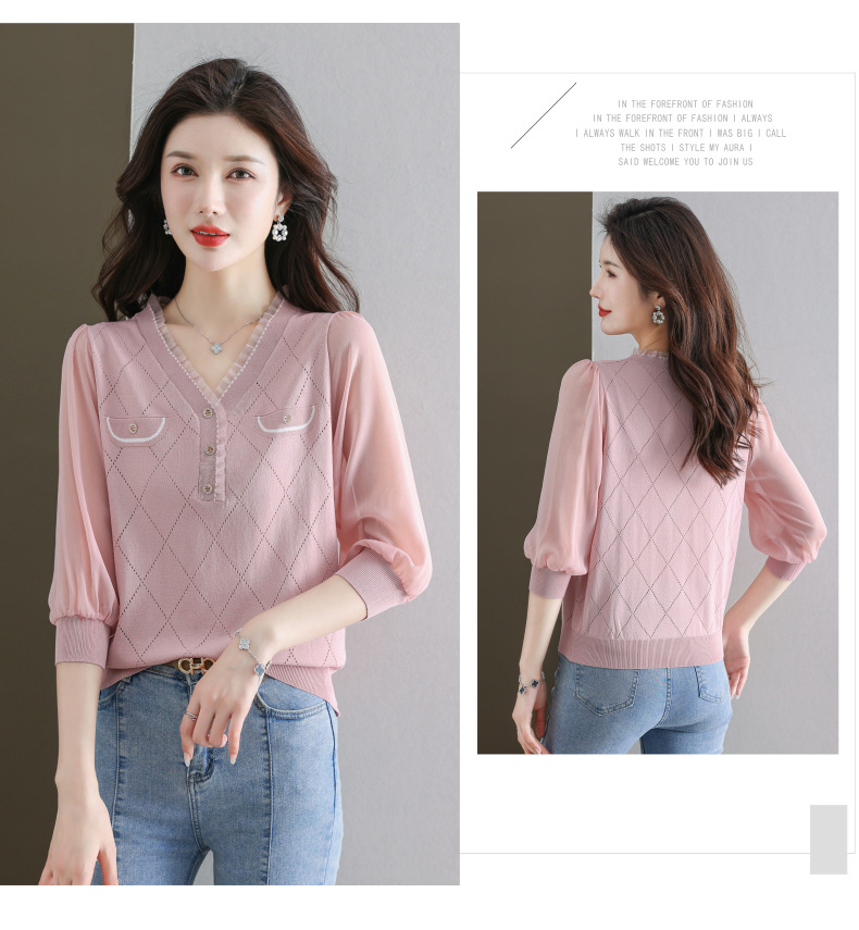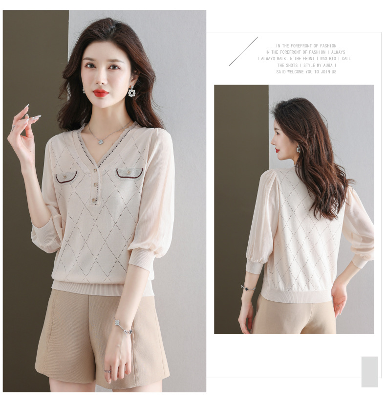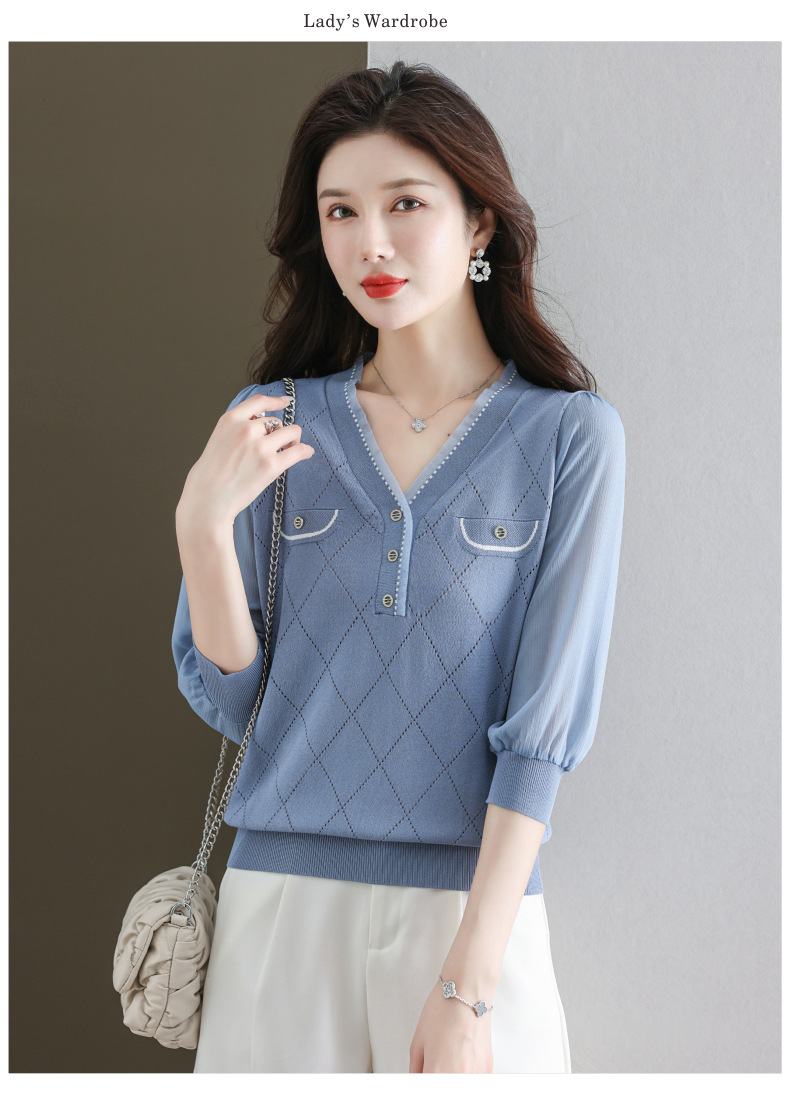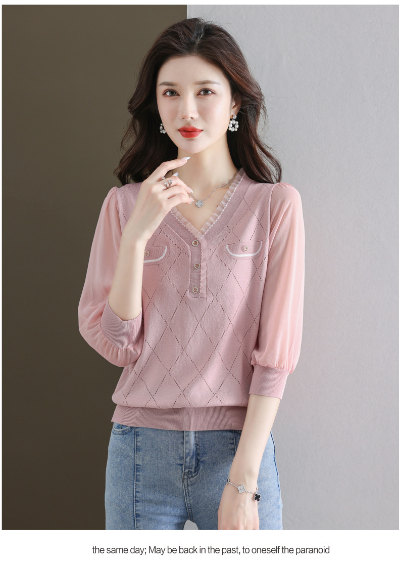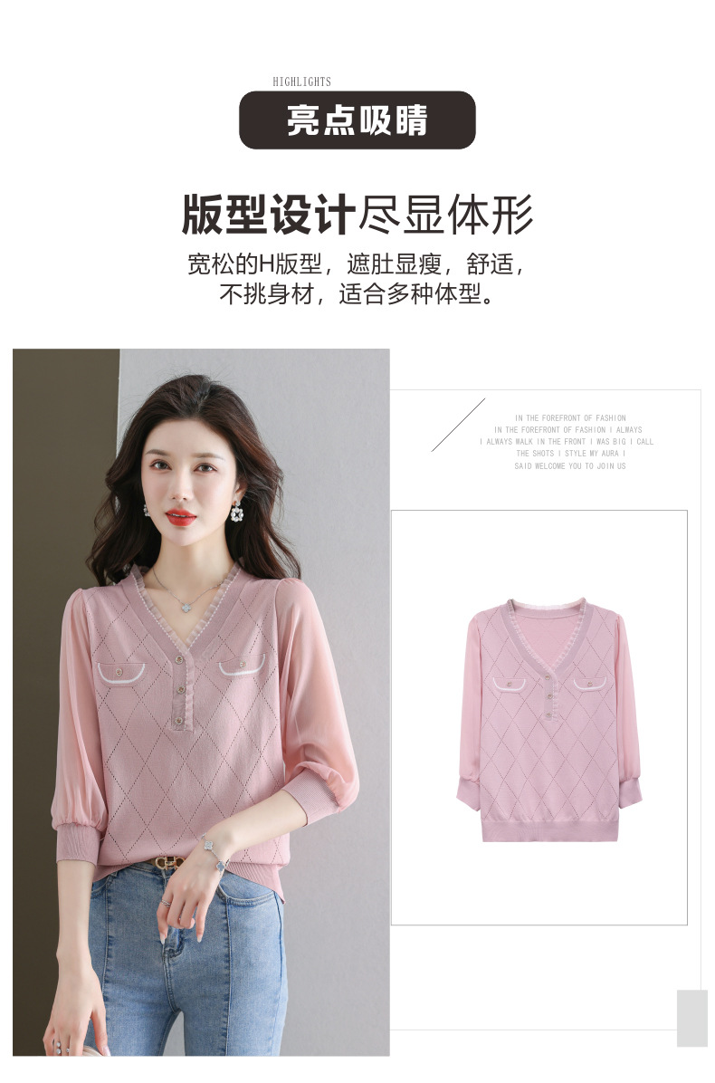 V-넥 쉬폰 메쉬 크롭 슬리브 티셔츠 여성용 중간 소매 탑 봄 얇은 얼음 실크 니트 셔츠 봄과 가을 어머니의 여름 옷스토어 가기
