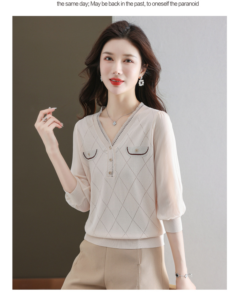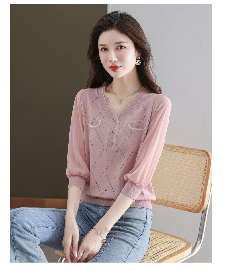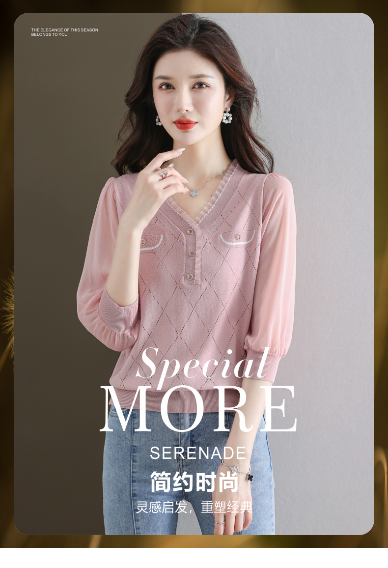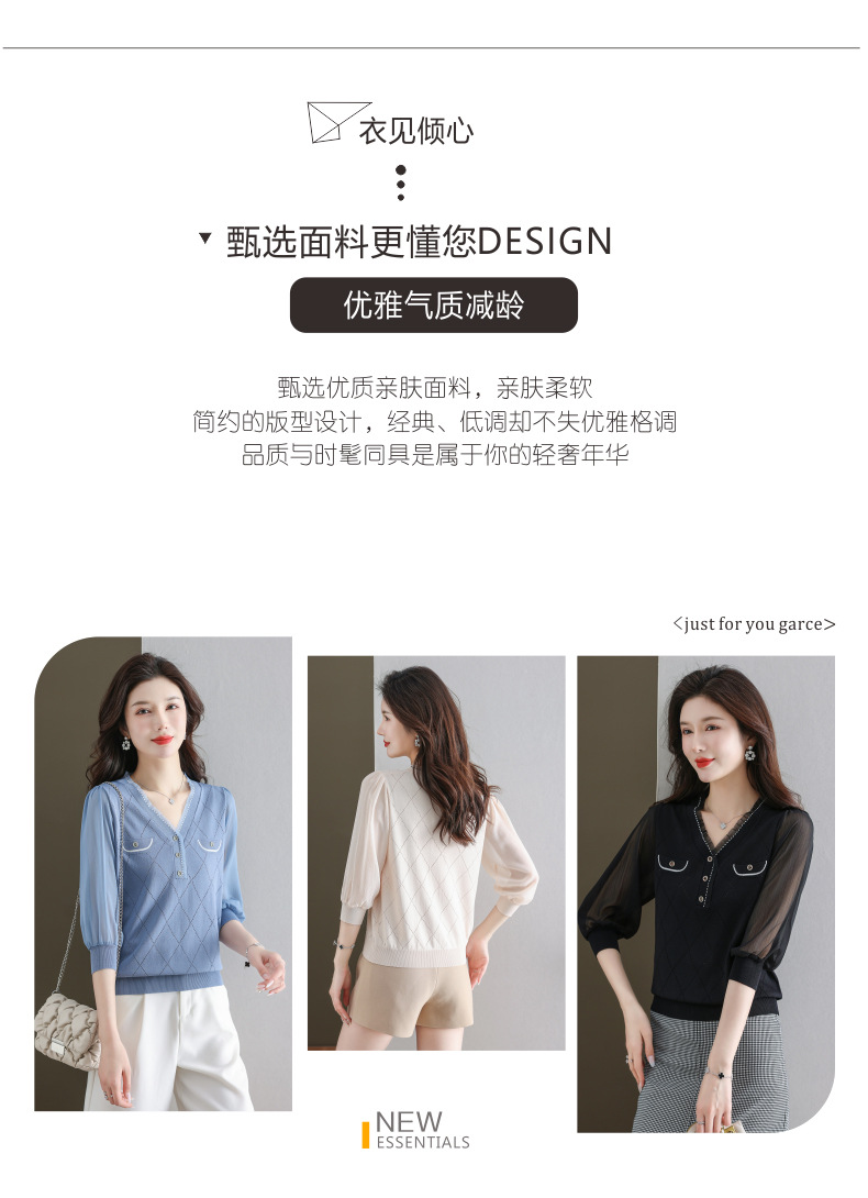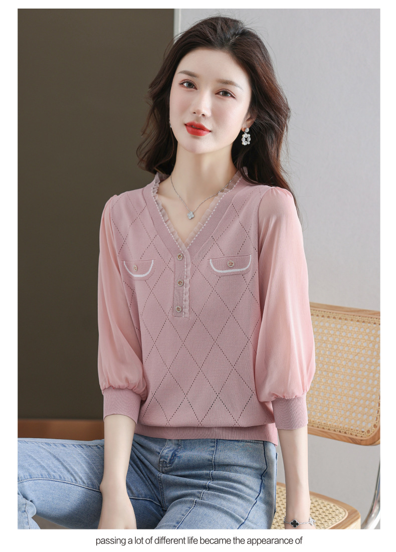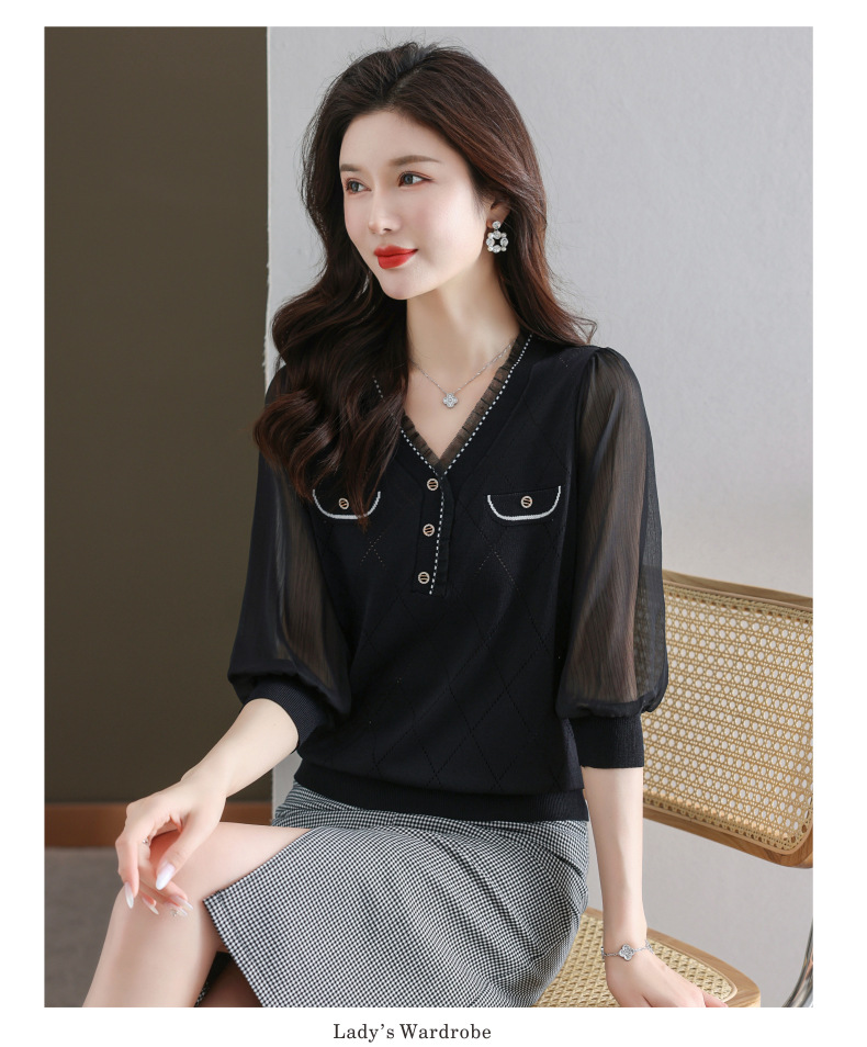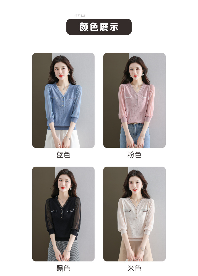 V-넥 쉬폰 메쉬 크롭 슬리브 티셔츠 여성용 중간 소매 탑 봄 얇은 얼음 실크 니트 셔츠 봄과 가을 어머니의 여름 옷스토어 가기