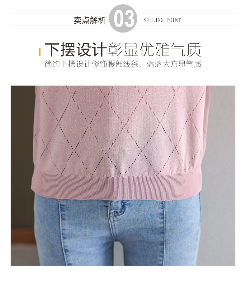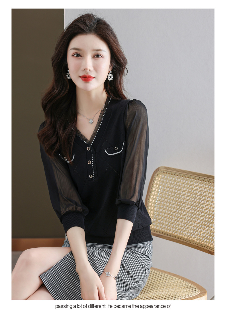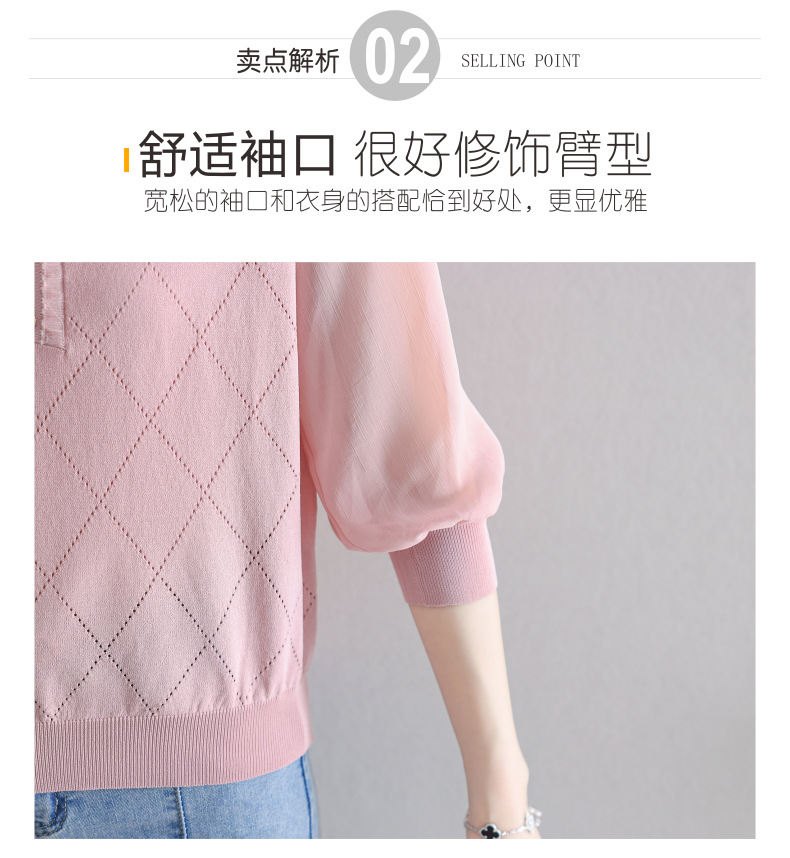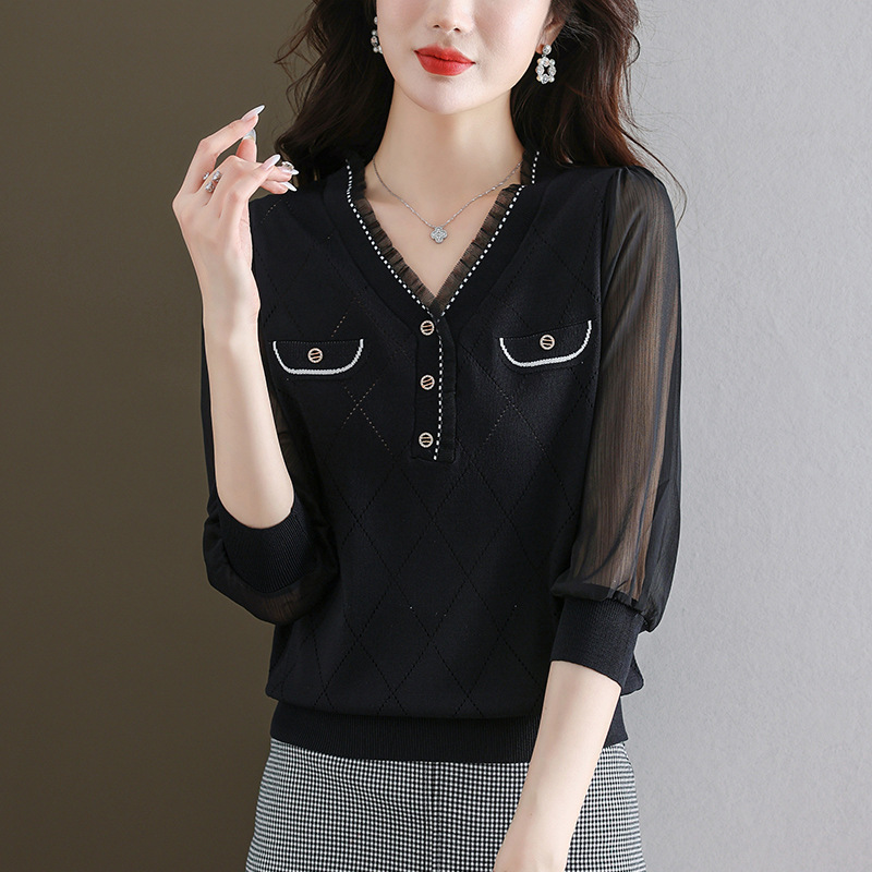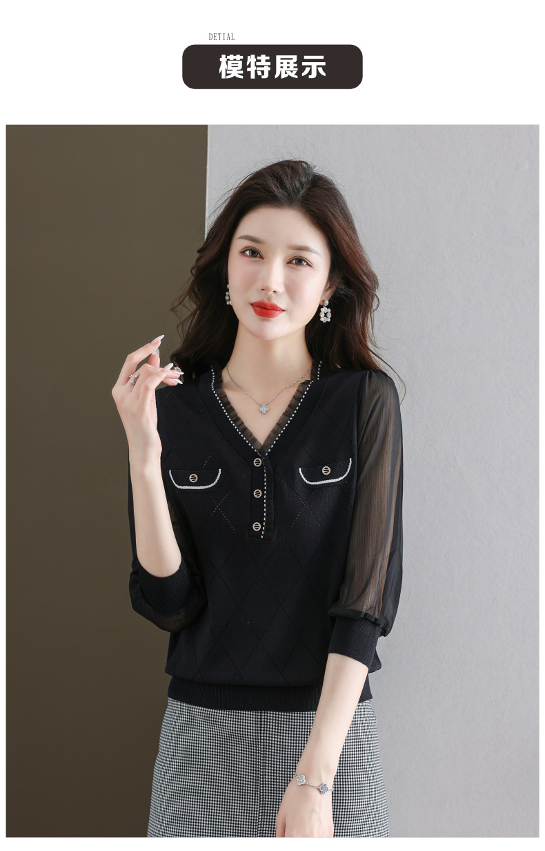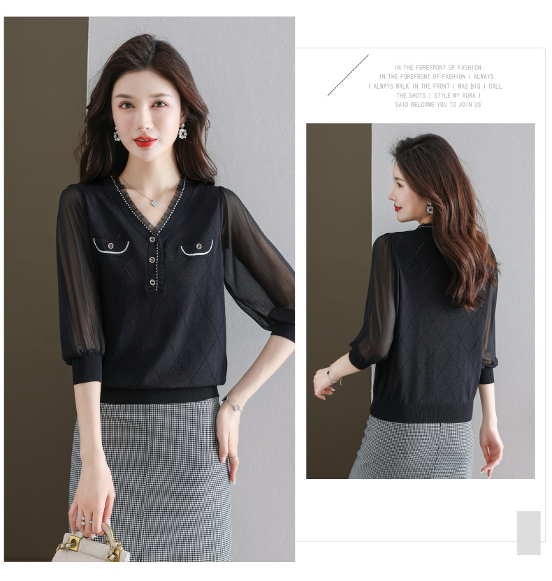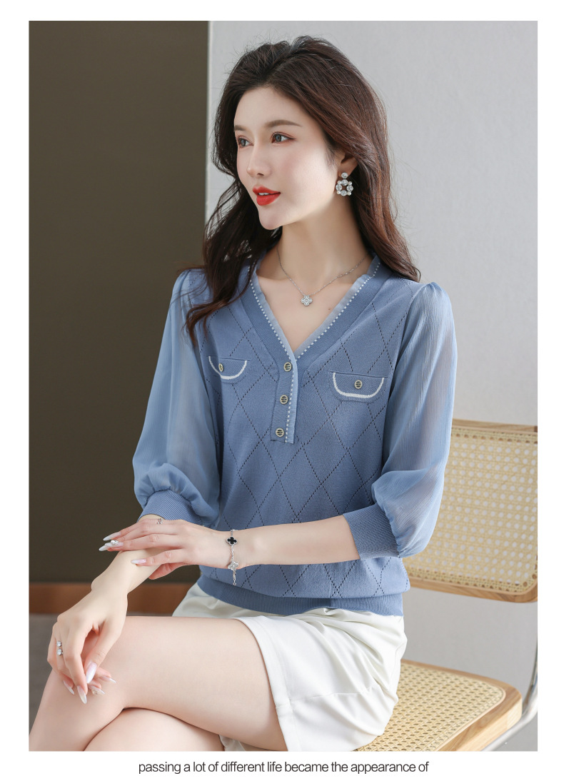 V-넥 쉬폰 메쉬 크롭 슬리브 티셔츠 여성용 중간 소매 탑 봄 얇은 얼음 실크 니트 셔츠 봄과 가을 어머니의 여름 옷스토어 가기