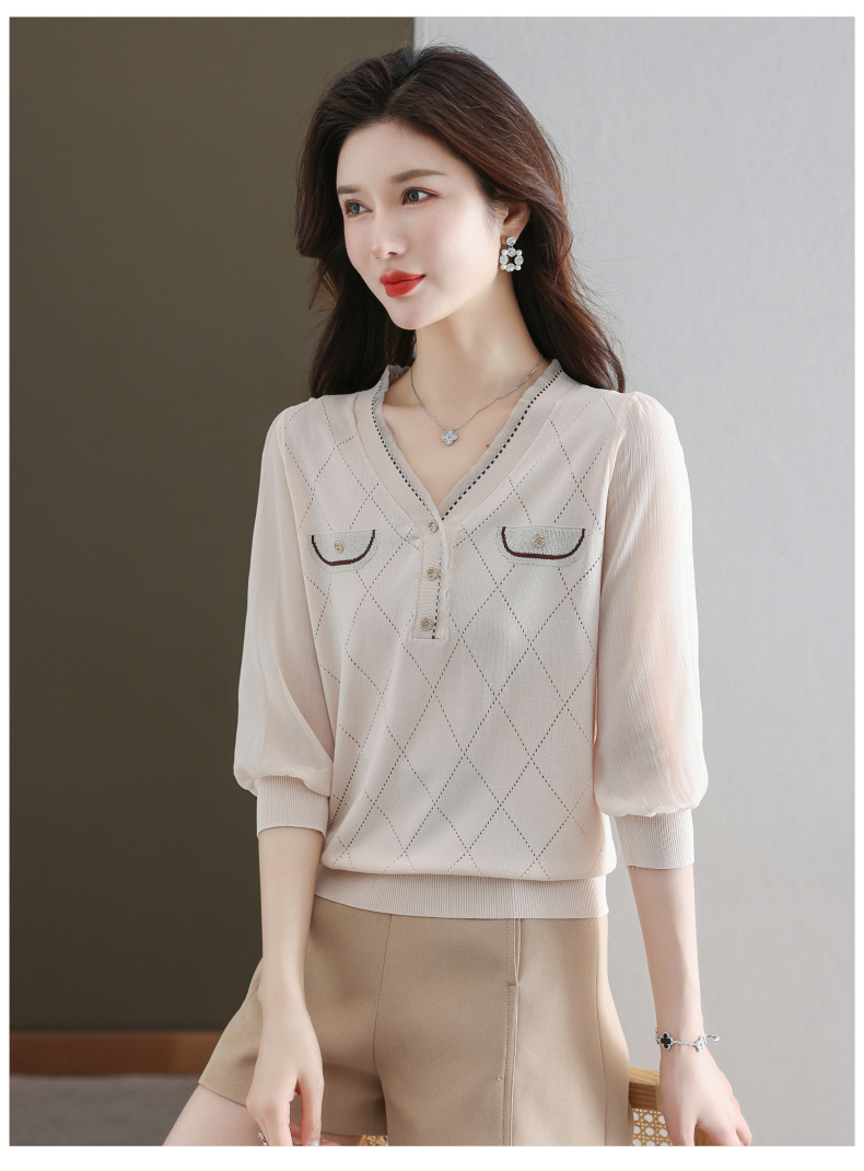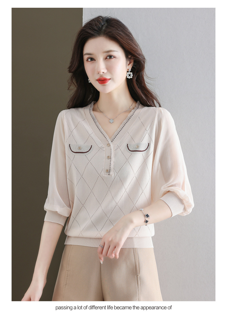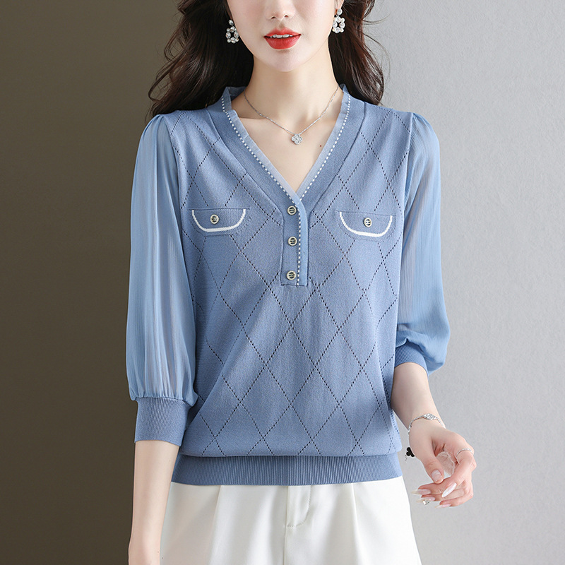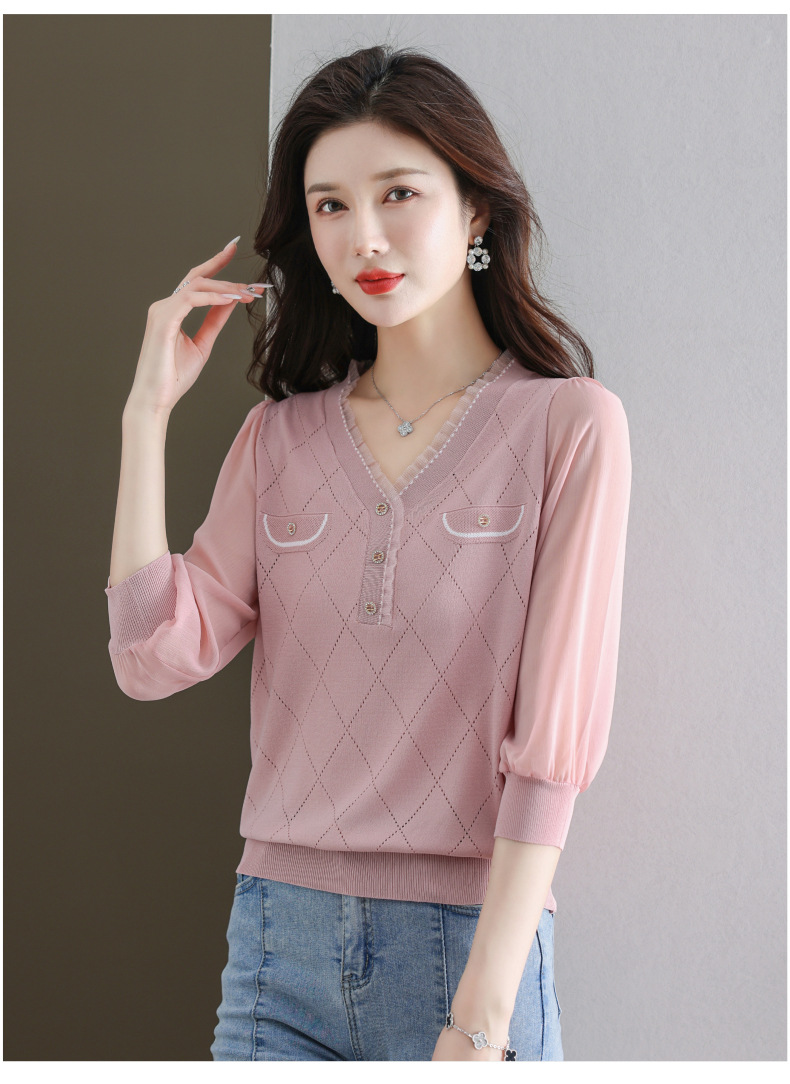 V-넥 쉬폰 메쉬 크롭 슬리브 티셔츠 여성용 중간 소매 탑 봄 얇은 얼음 실크 니트 셔츠 봄과 가을 어머니의 여름 옷
