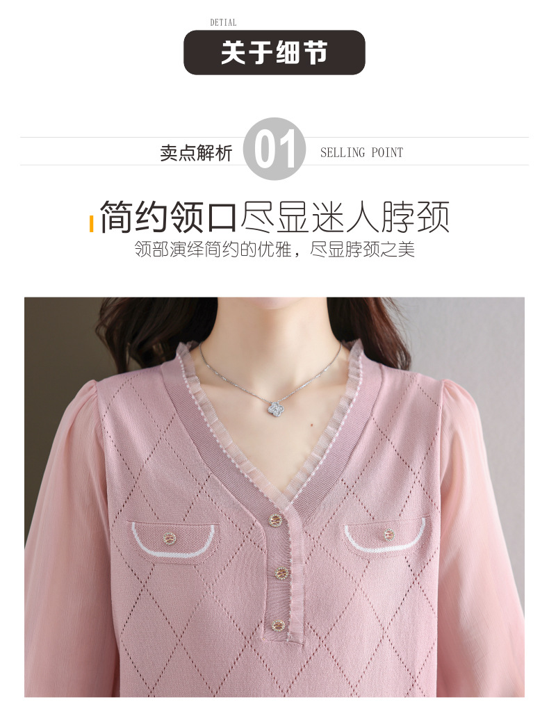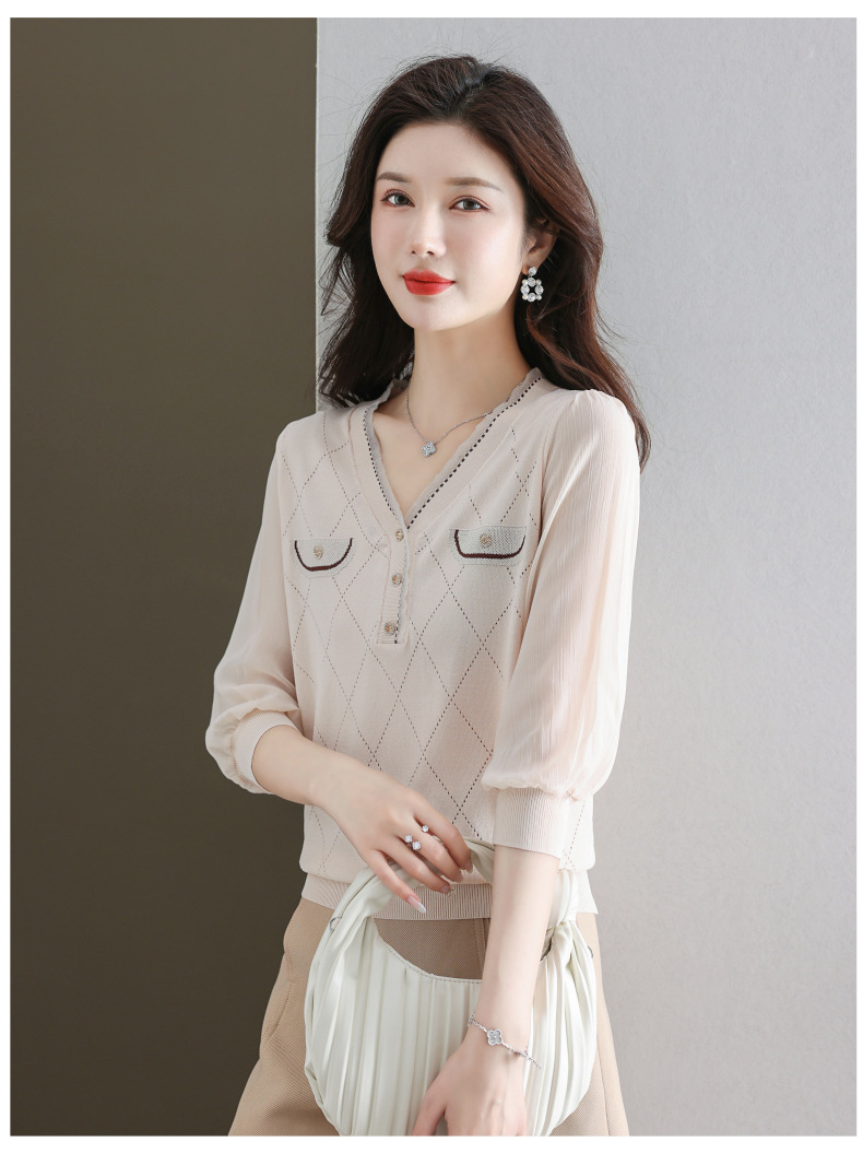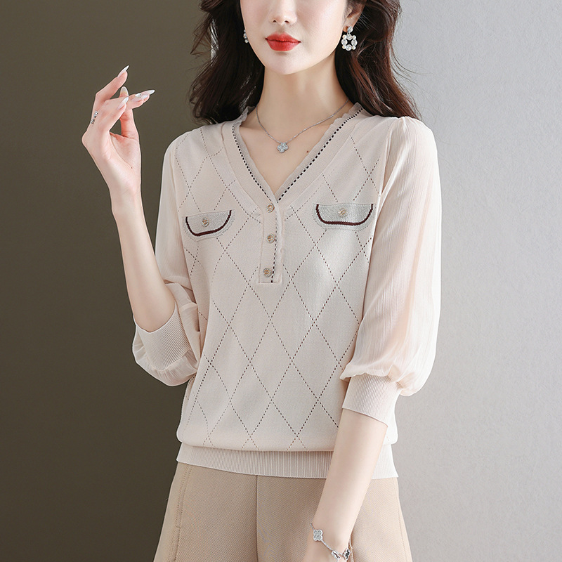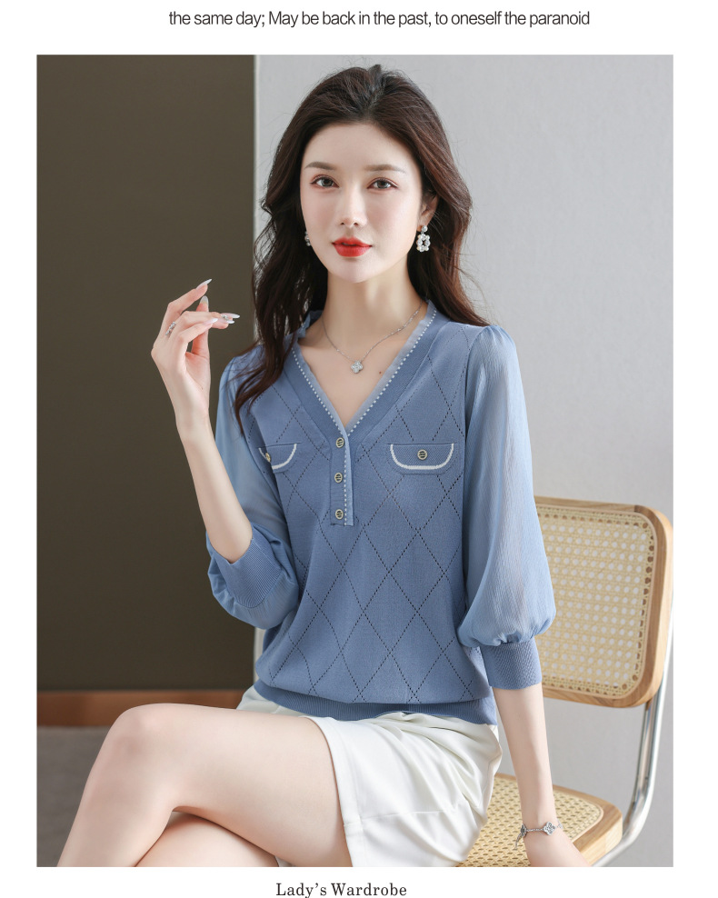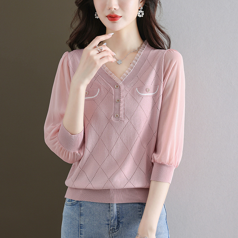 V-넥 쉬폰 메쉬 크롭 슬리브 티셔츠 여성용 중간 소매 탑 봄 얇은 얼음 실크 니트 셔츠 봄과 가을 어머니의 여름 옷