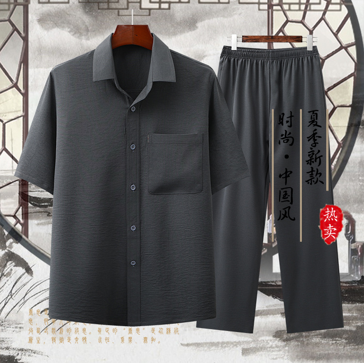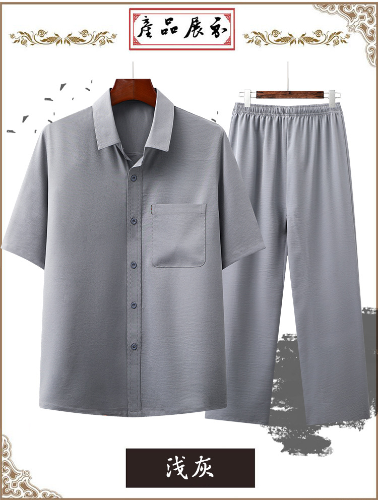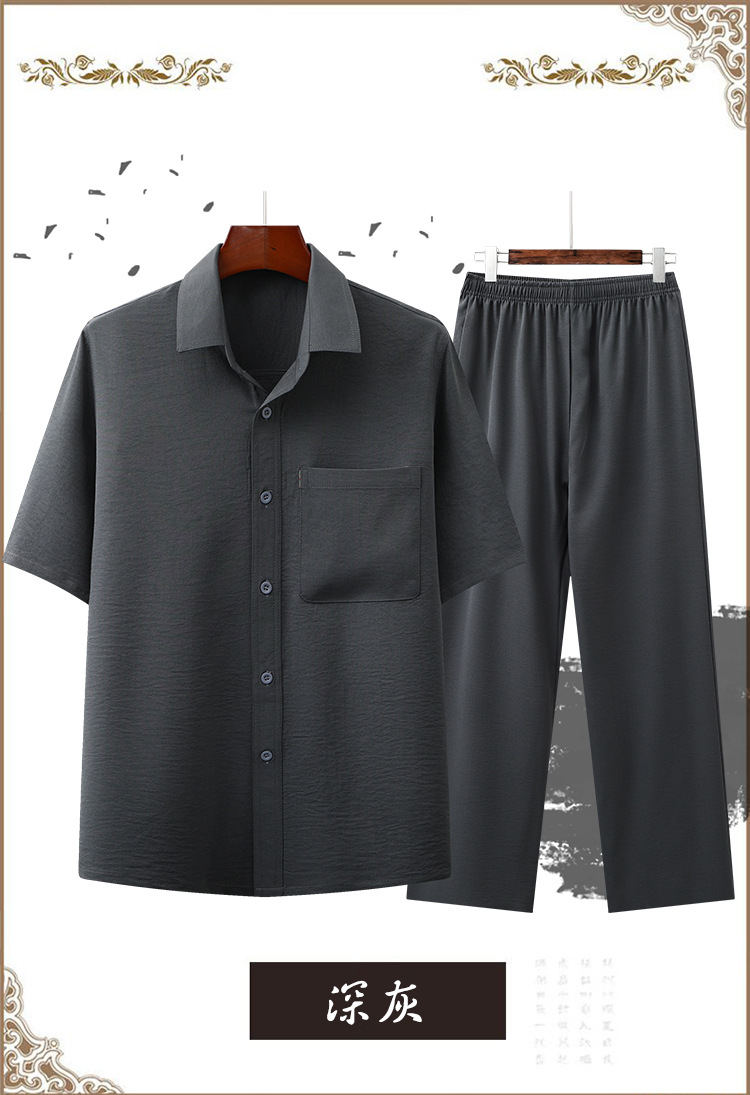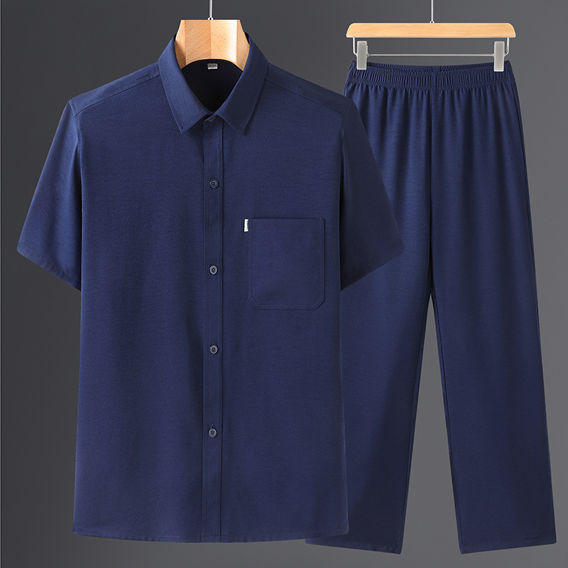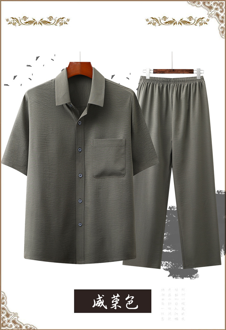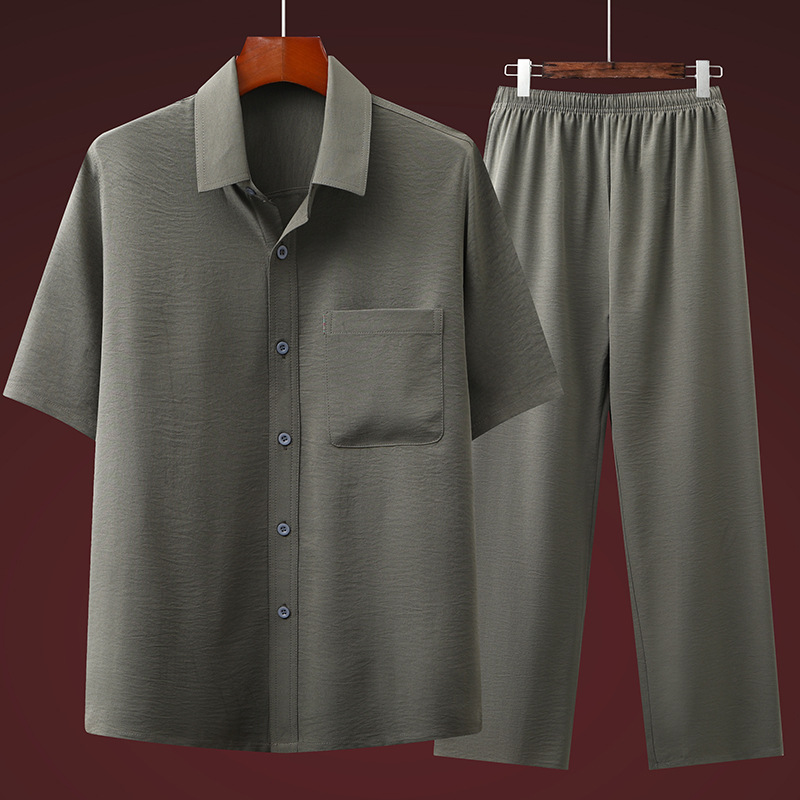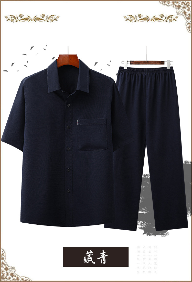 도매 재고 중년 남자의 반팔 셔츠 세트 단색 옷깃 2 종 긴 바지 노인 위 옷