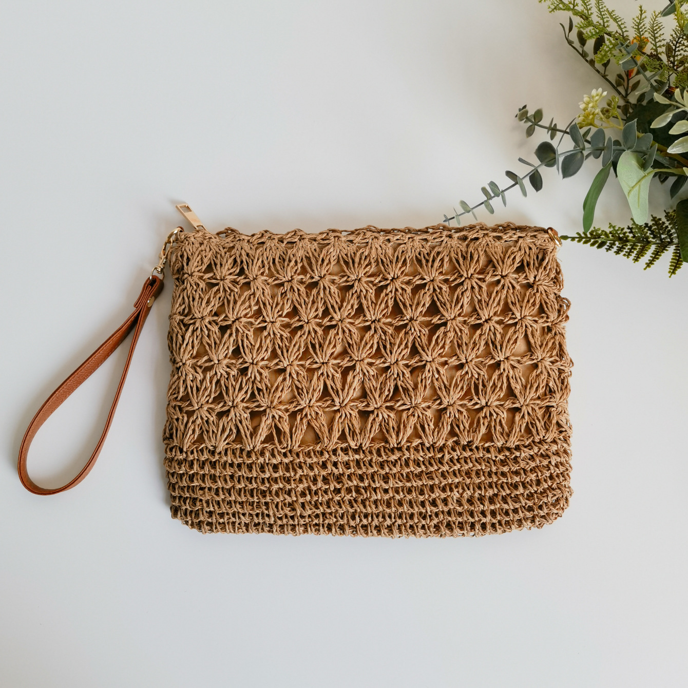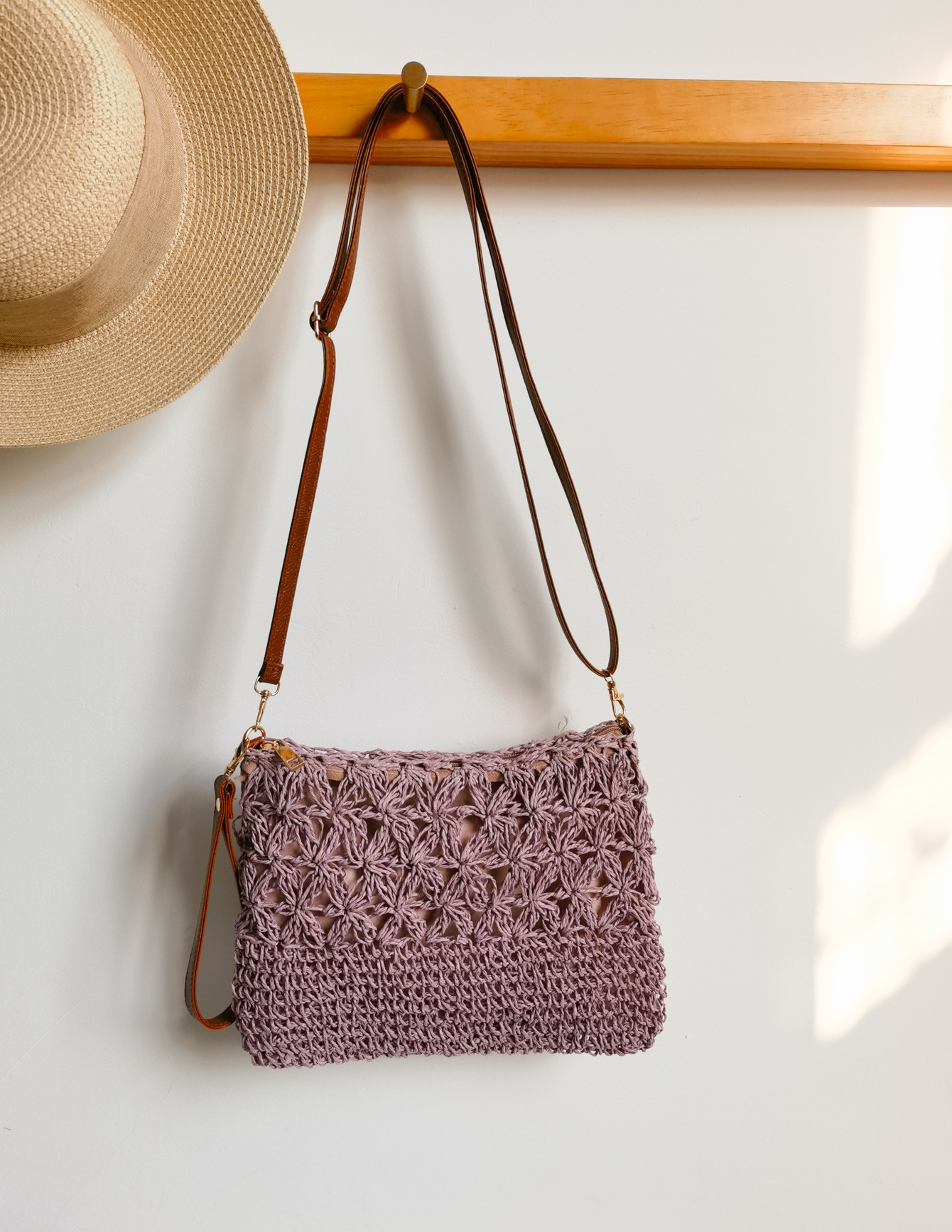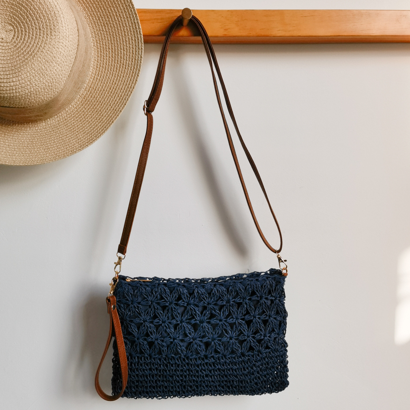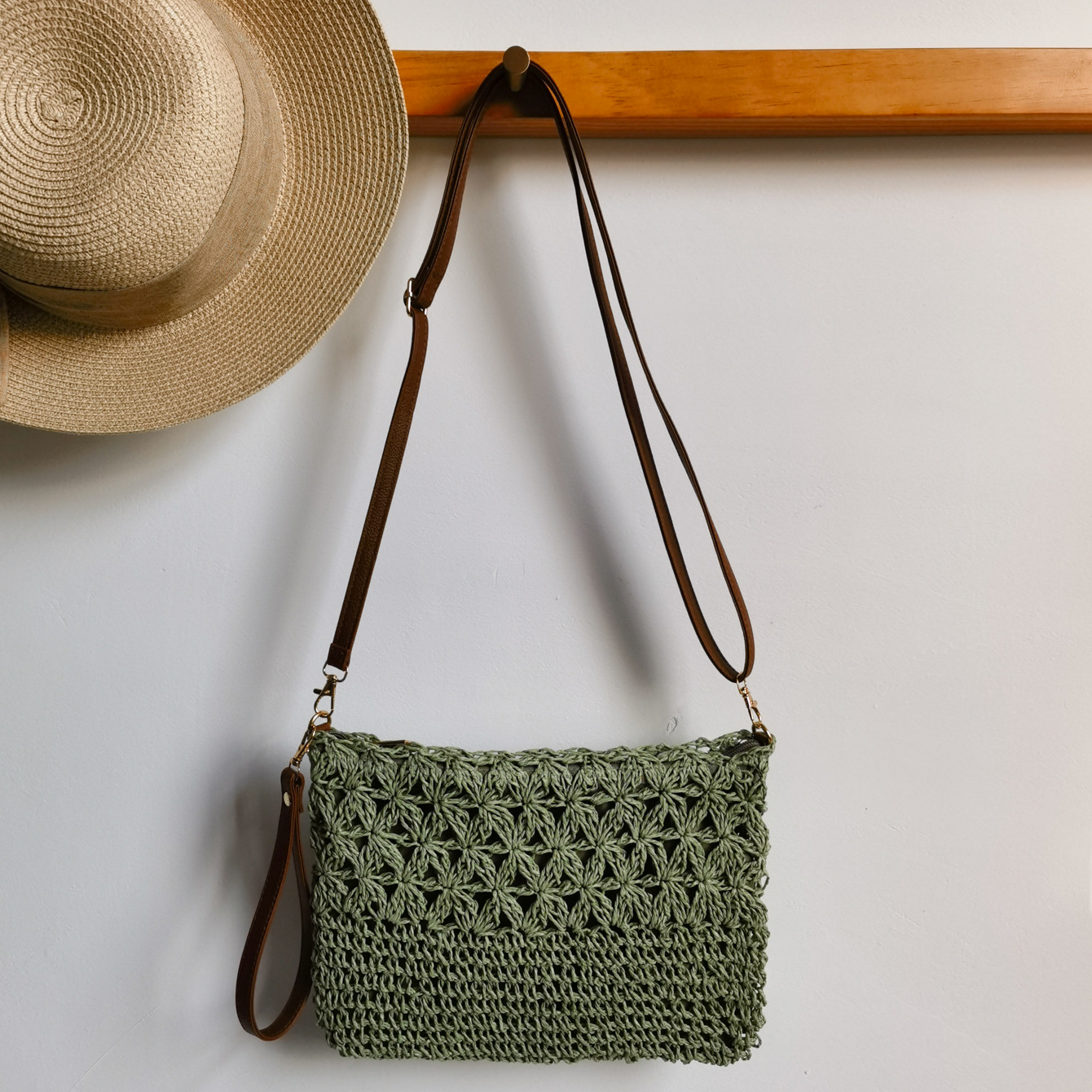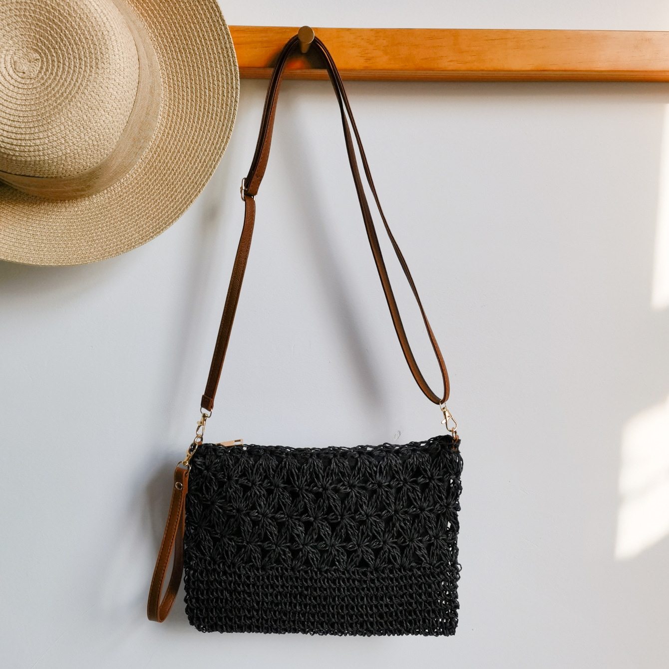 수제 밀짚 짠 중공 꽃 크로스 바디 백