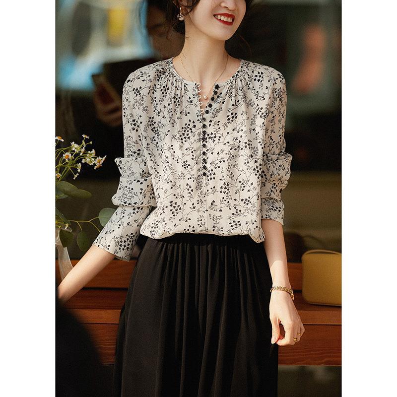 달콤한 "과일" 인쇄 세미 오픈 플래켓 작은 꽉 버튼 크레이프 드 중국 모조 뽕나무 실크 셔츠 재킷 봄 유럽 상품 대외 무역스토어 가기