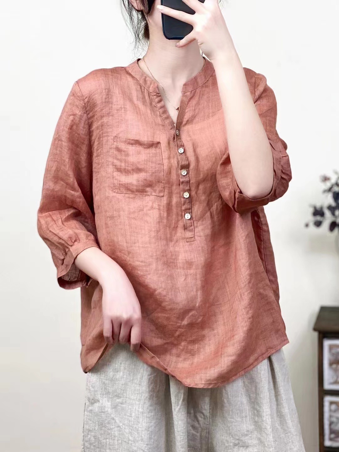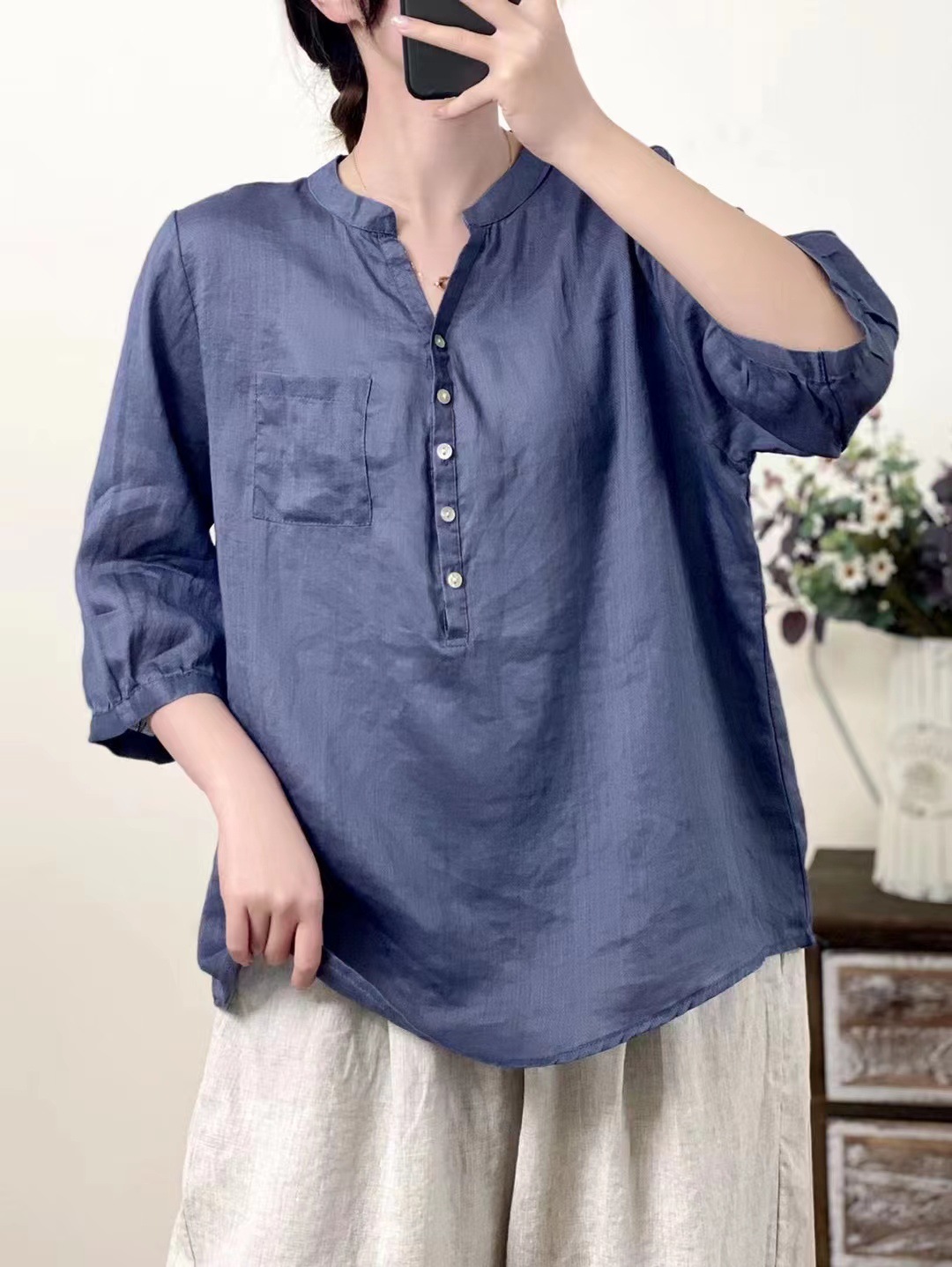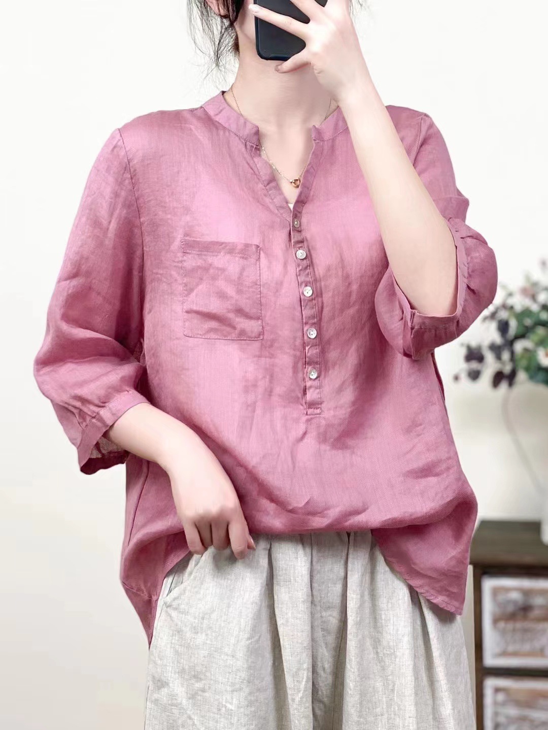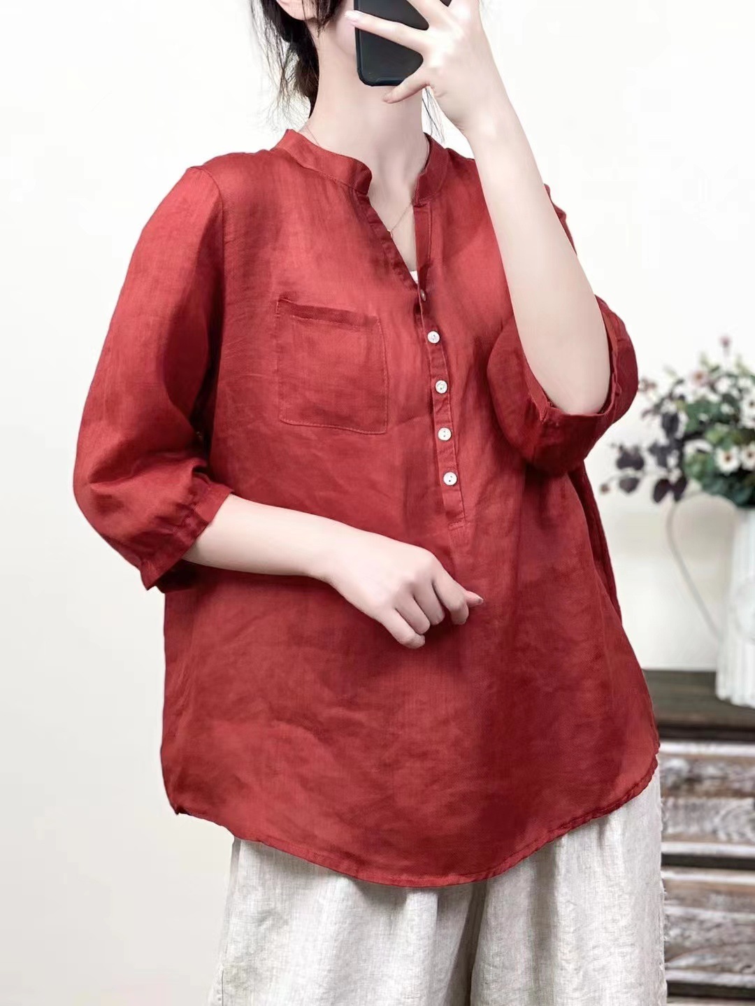 레트로 100수 라미 셔츠 여성용 스탠드 칼라 얇은 스타일의 예술적인 풀오버 셔츠 우아한 탑 2026 여름 신상품스토어 가기
