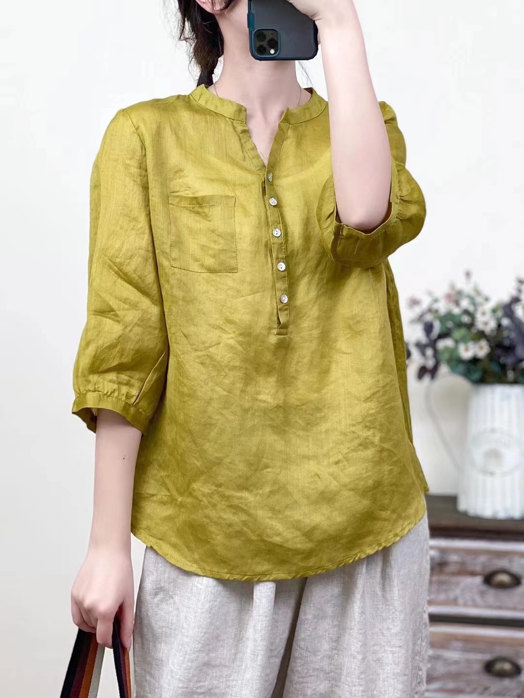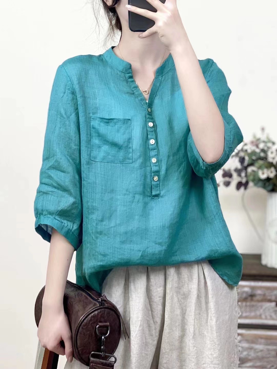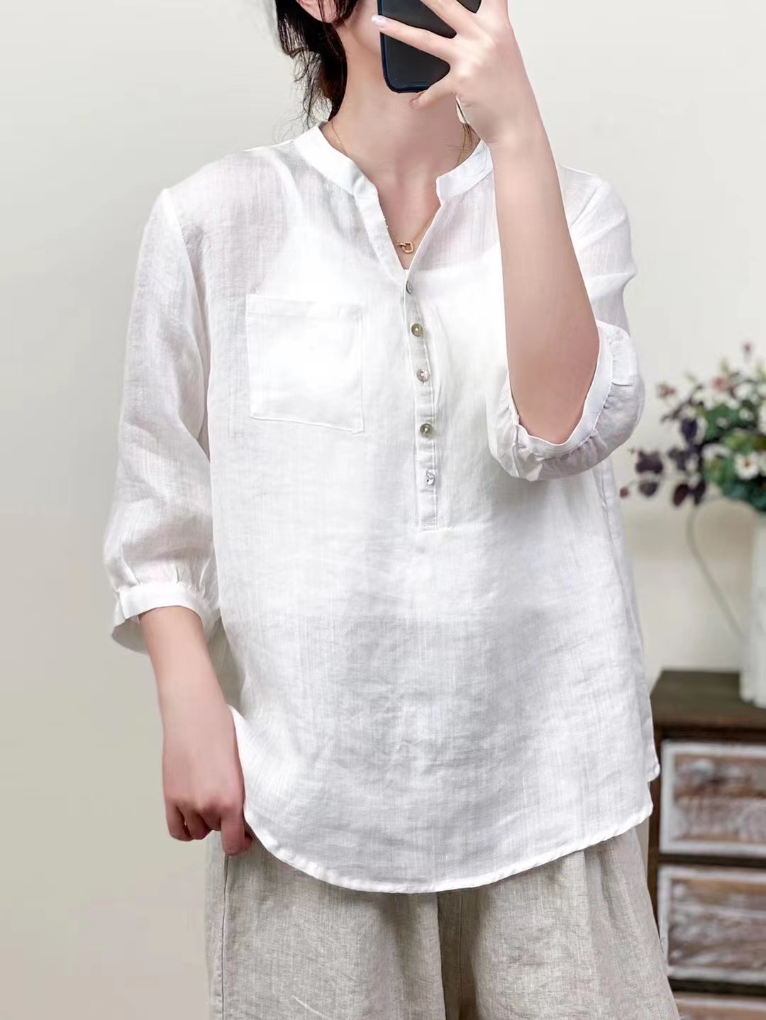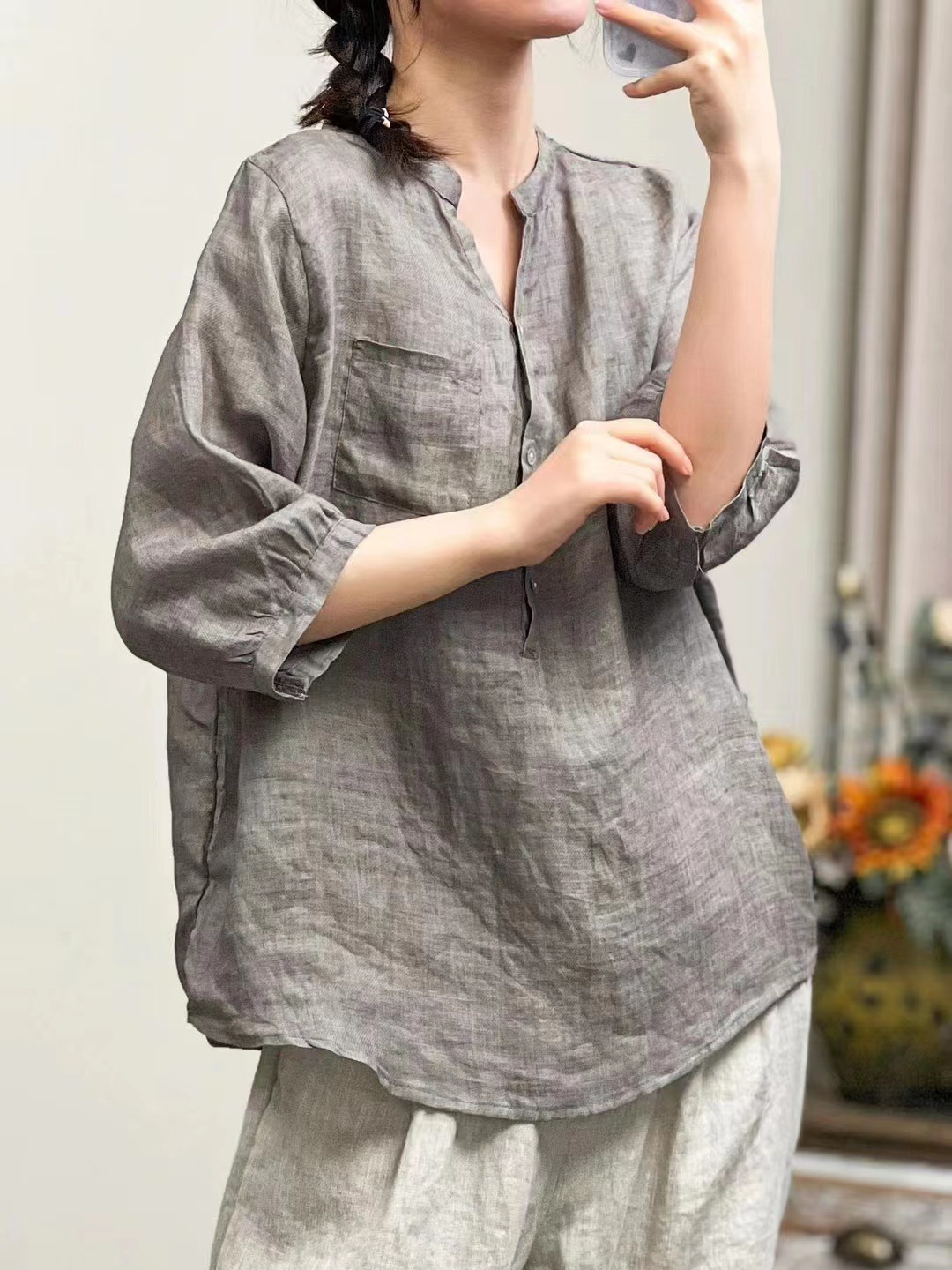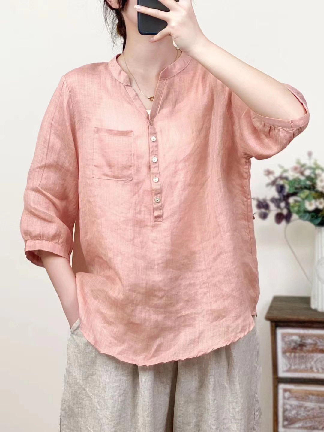 레트로 100수 라미 셔츠 여성용 스탠드 칼라 얇은 스타일의 예술적인 풀오버 셔츠 우아한 탑 2026 여름 신상품스토어 가기