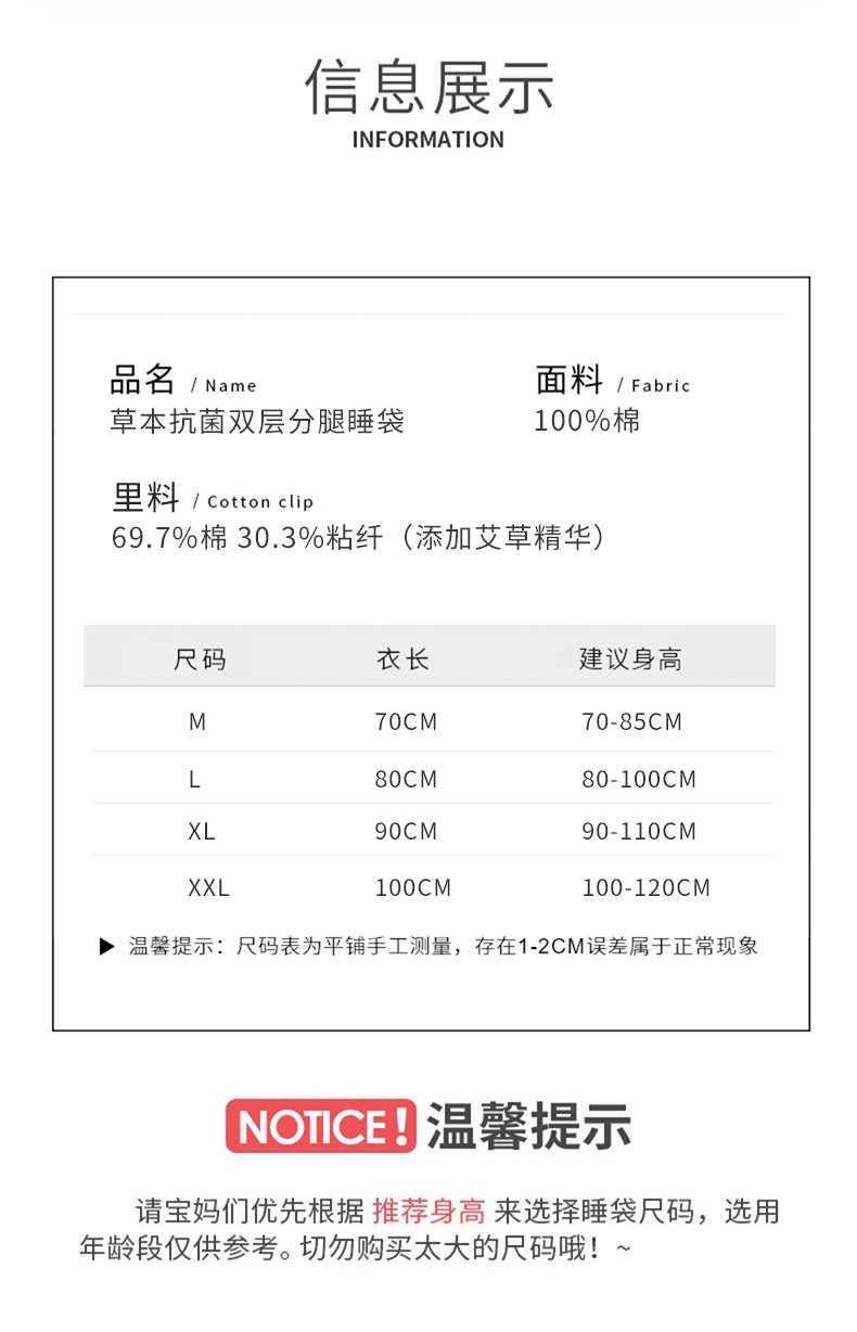 어린이 유아용 다리가 펼쳐지는 수면조끼, 봄과 가을용, 쑥 항균 이중 순면, 어린이 발차기 방지 이불, 아기 사계절용