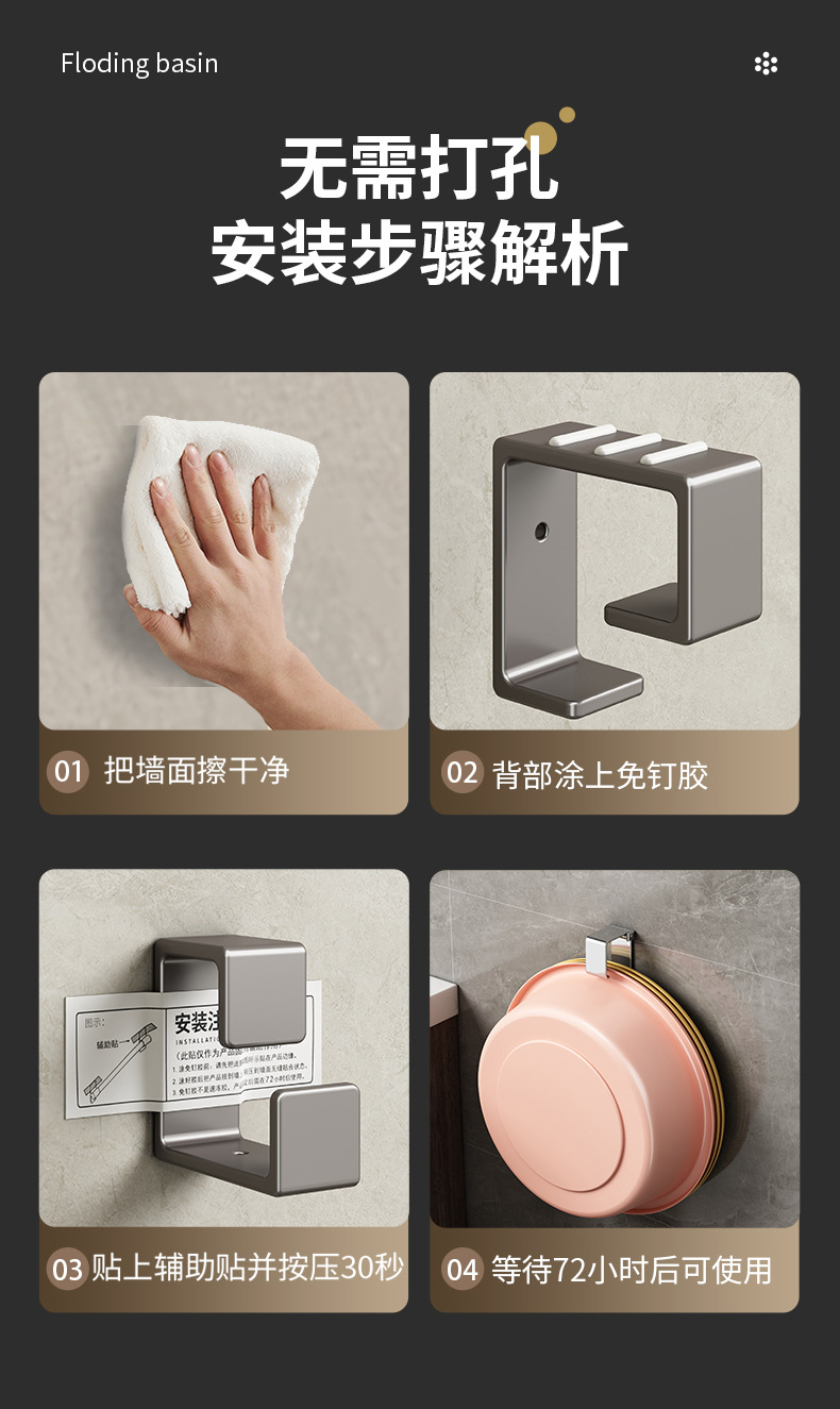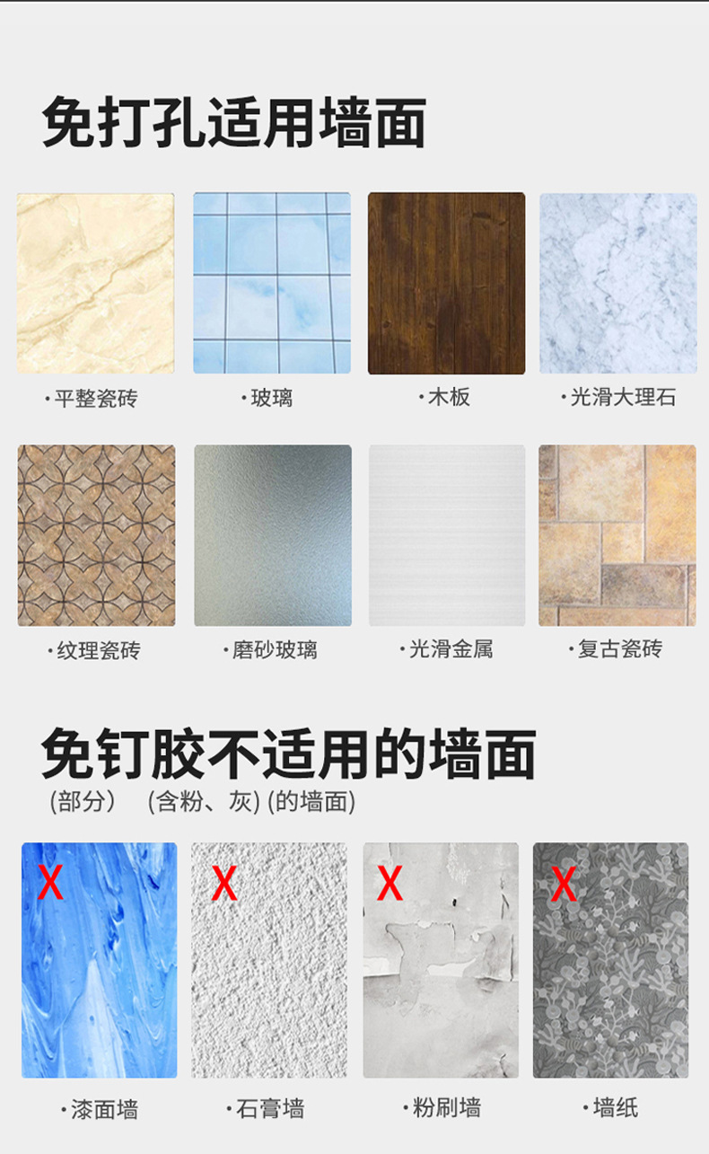 (2)免打孔安装请注意,墙面需平整坚固的玻璃瓷砖等。不可用在粉刷墙,墙纸,石灰墙等不平整不坚固的墙面上。涂胶上墙后需等待3-5天,免钉胶完全干透再使用!
