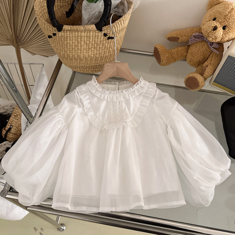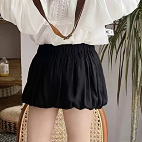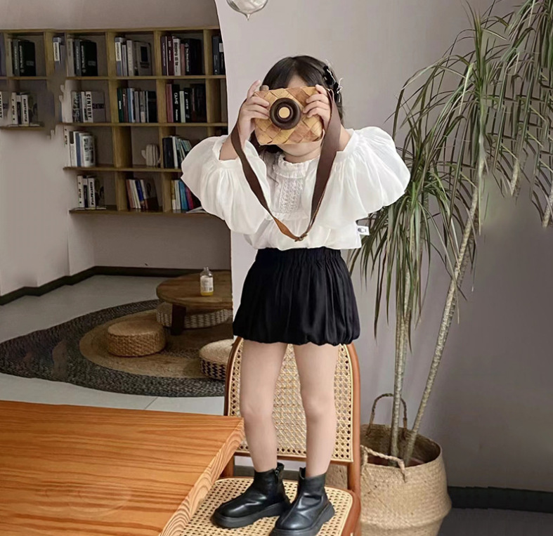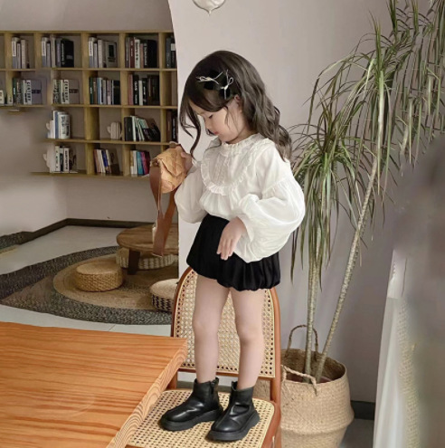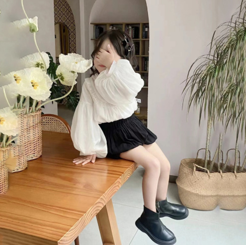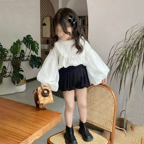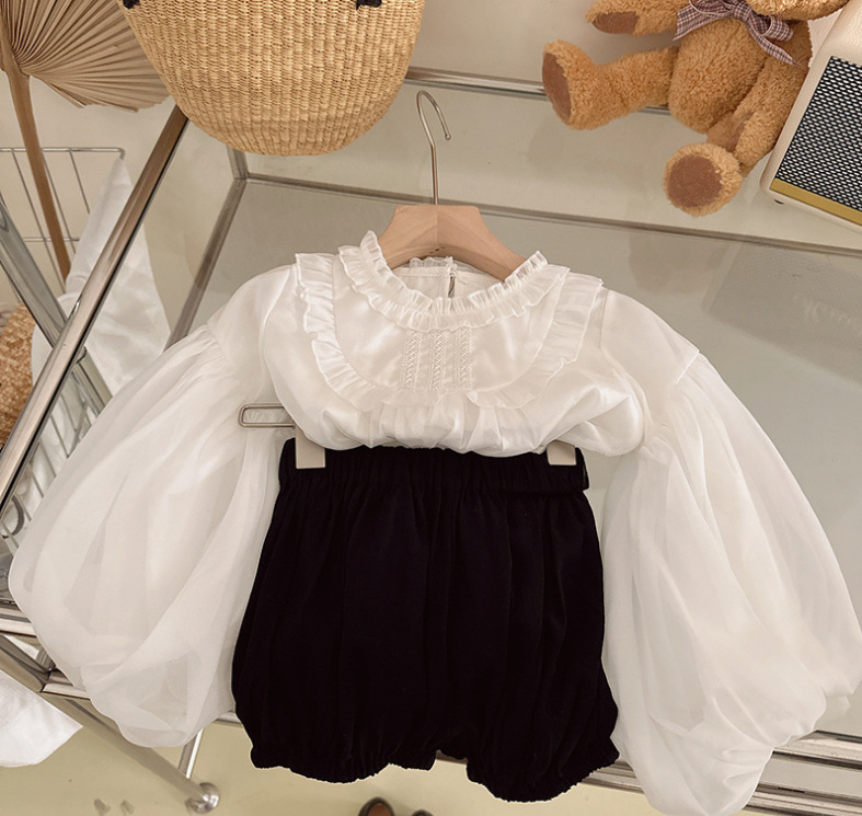 봄과 가을 새로운 한국식 쉬폰 긴팔 인형 셔츠 퍼프 슬리브 탑 모든 매치 호박 반바지 투피스 세트