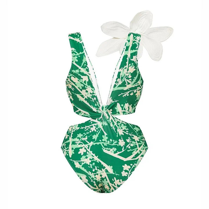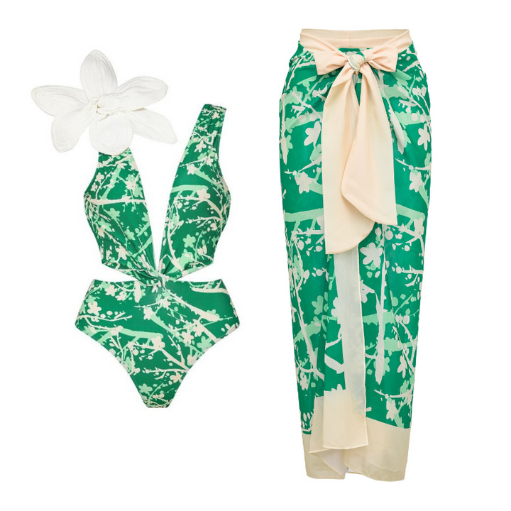2024 유럽 및 미국 신상 원피스 수영복 딥 V3D 입체 꽃 장식 프린트 원피스 스커트 세트 2376