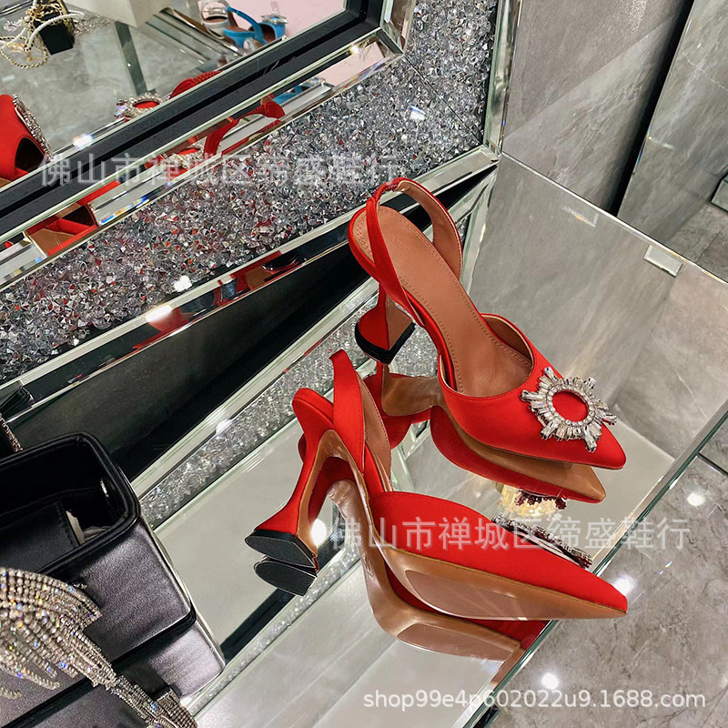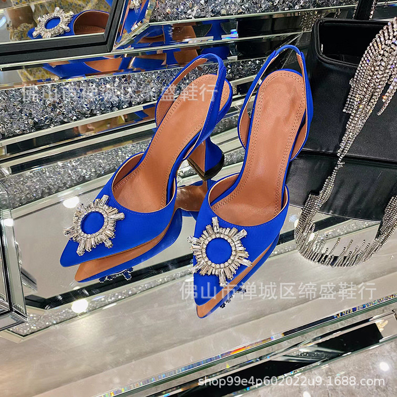 봄과 여름 중공 샌들 새로운 태양 버클 새틴 하이힐 여성용 와인 글라스 힐이있는 얕은 입 뾰족한 발가락 단층 신발스토어 가기