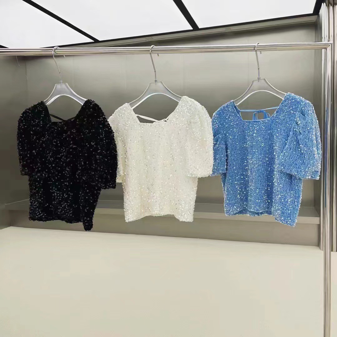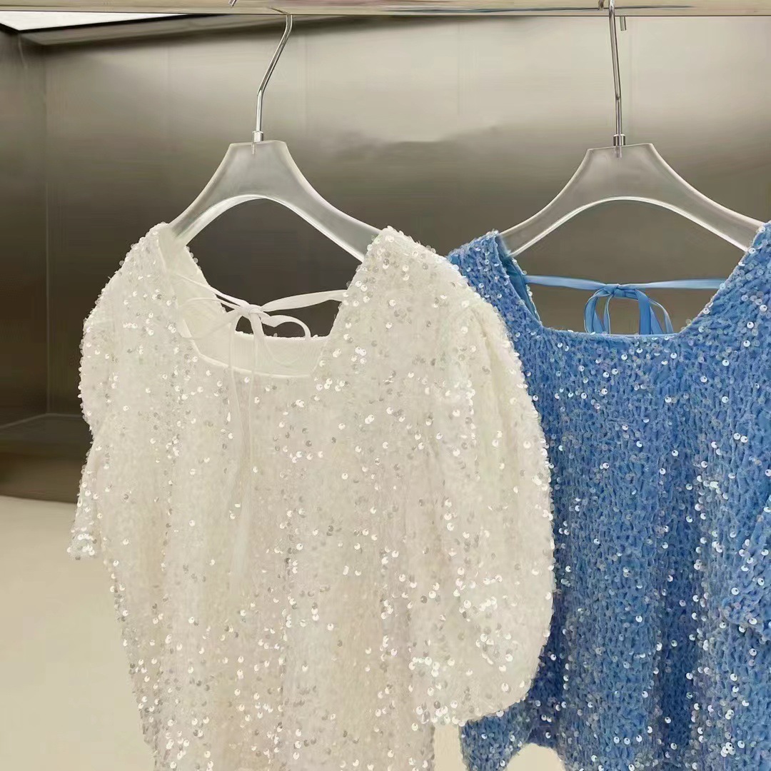 여아 여름 새로운 페르시 퍼프 슬리브 스퀘어 칼라 탑 한국 스타일 유행 반짝이 스팽글 단색 티셔츠스토어 가기