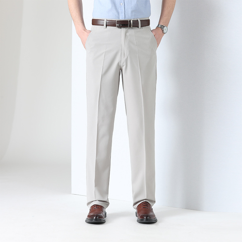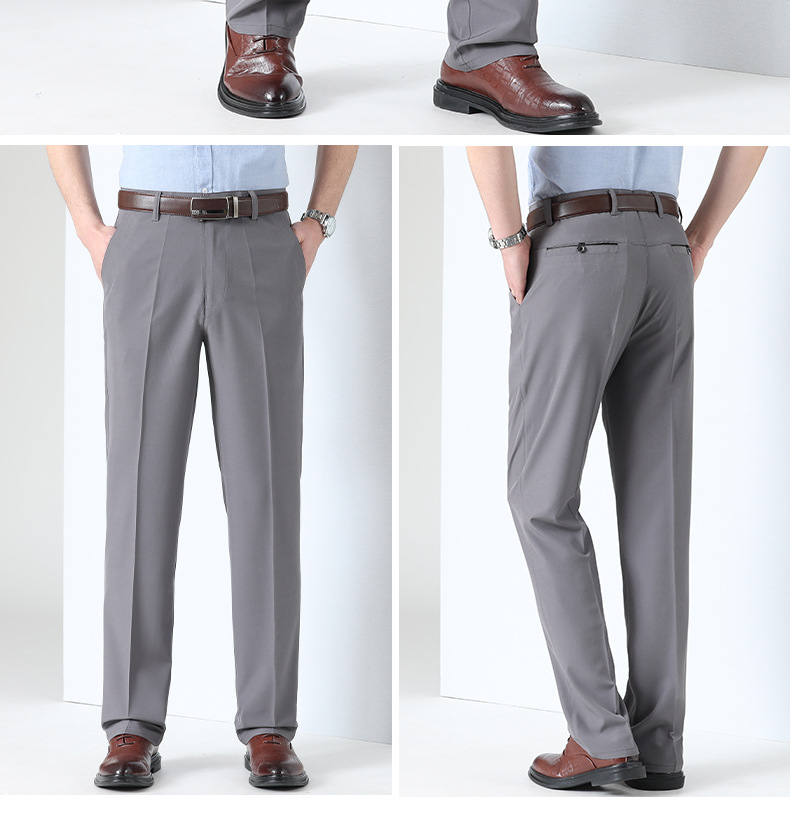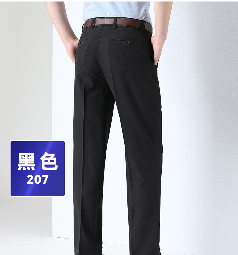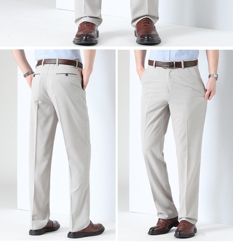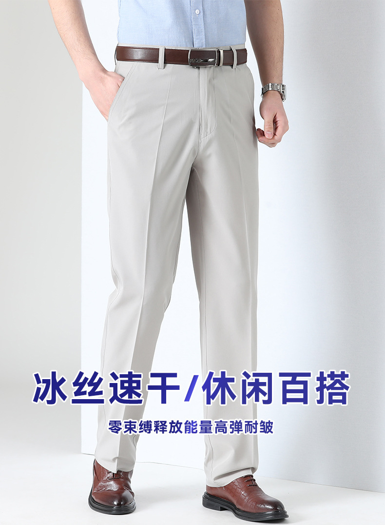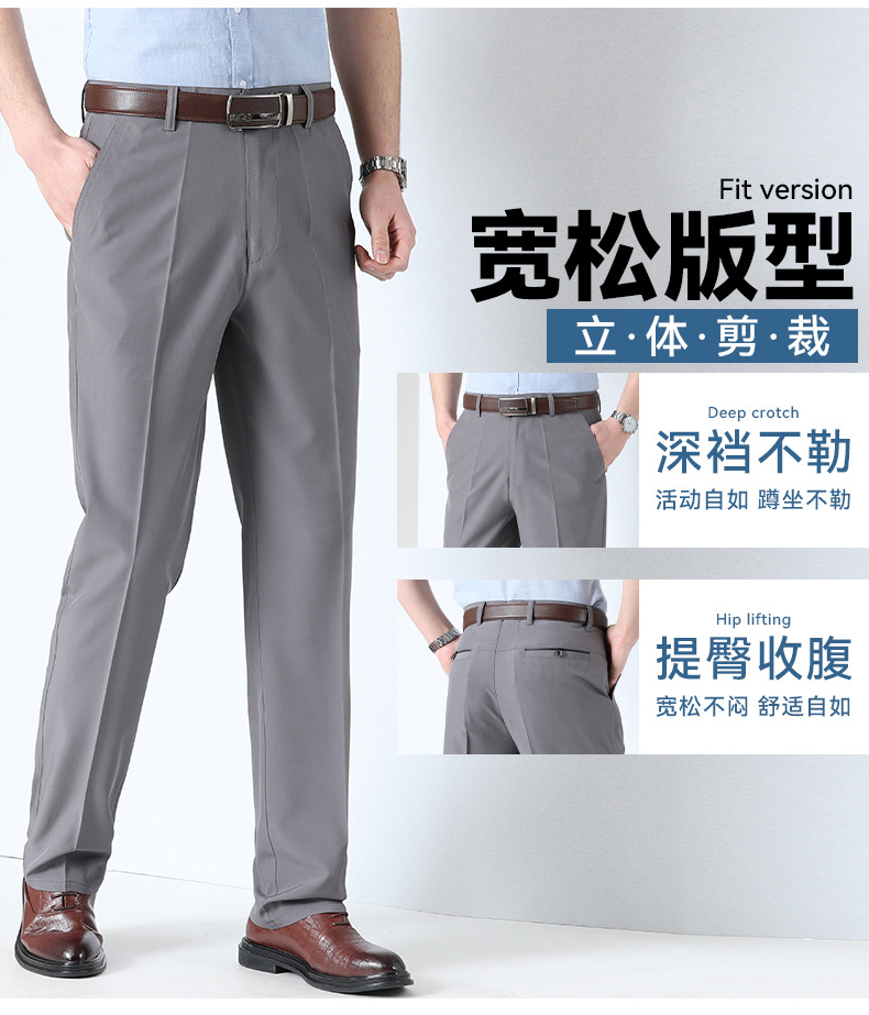 남성 비즈니스 캐주얼 아이스 실크 세트 바지 비 다림질 여름 얇은 중년 및 노인 캐주얼 바지 느슨한 스트레이트 하이 허리 깊은 가랑이