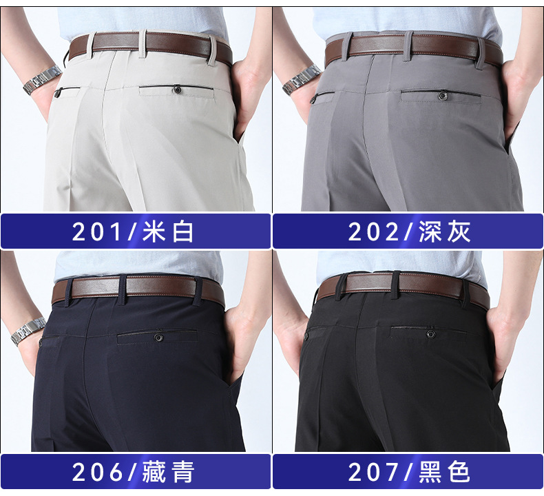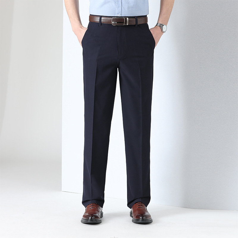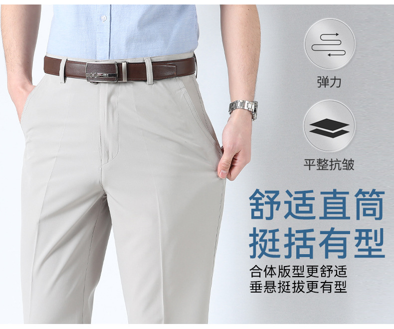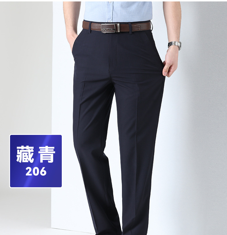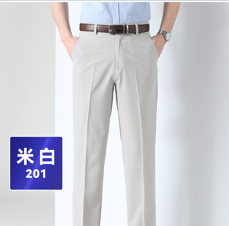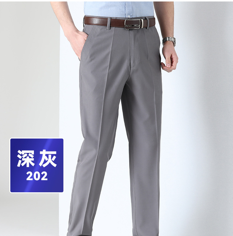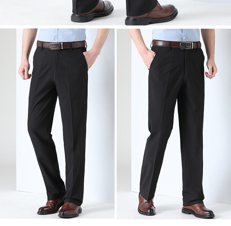 남성 비즈니스 캐주얼 아이스 실크 세트 바지 비 다림질 여름 얇은 중년 및 노인 캐주얼 바지 느슨한 스트레이트 하이 허리 깊은 가랑이