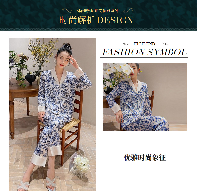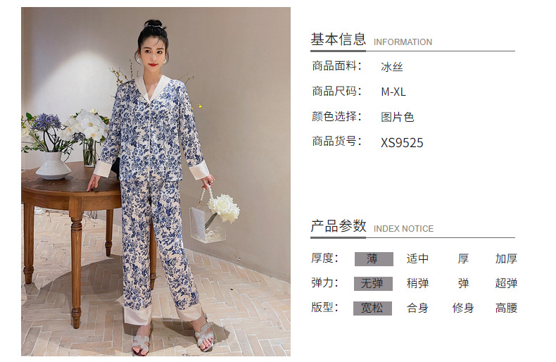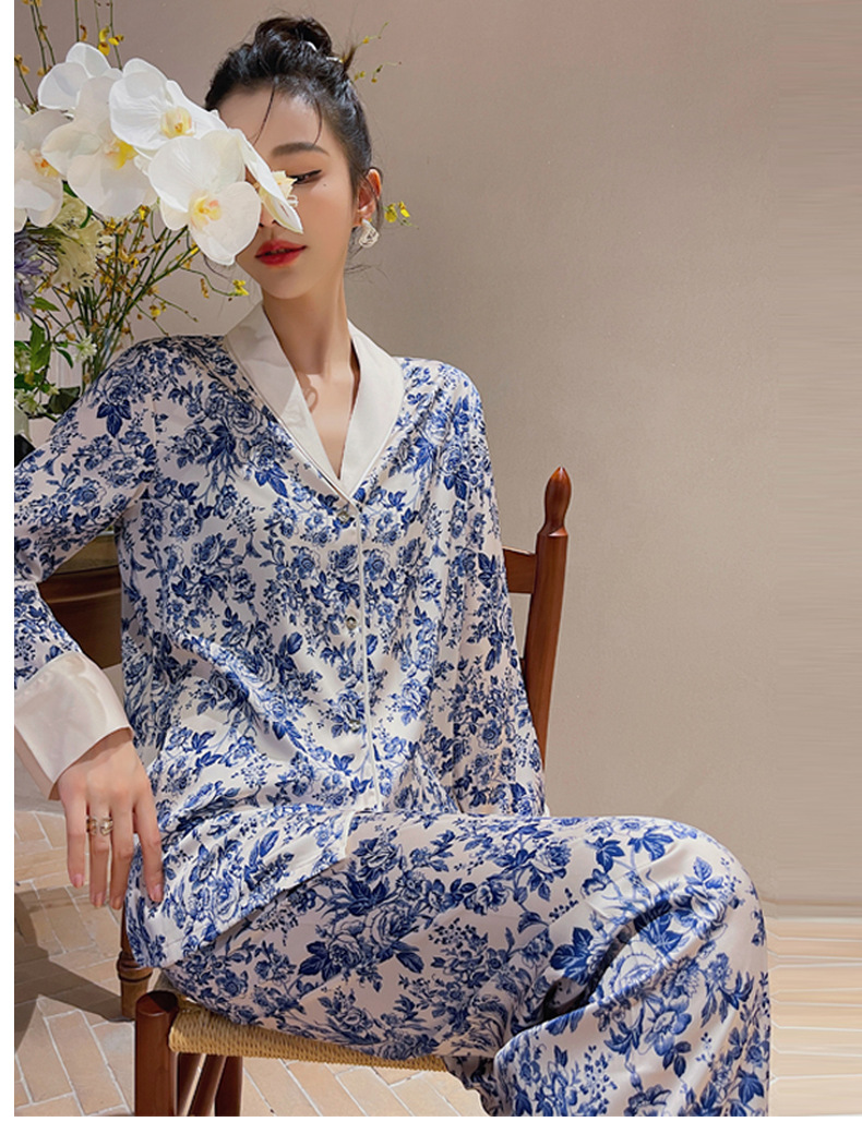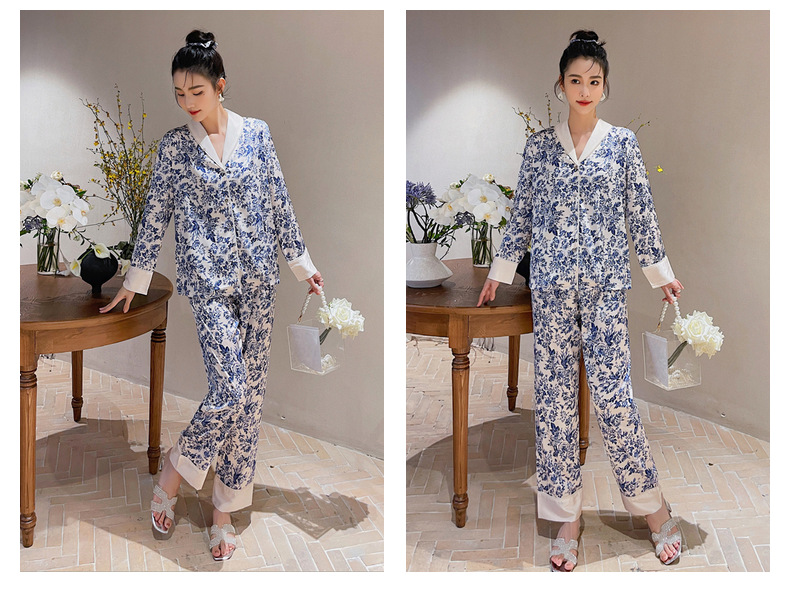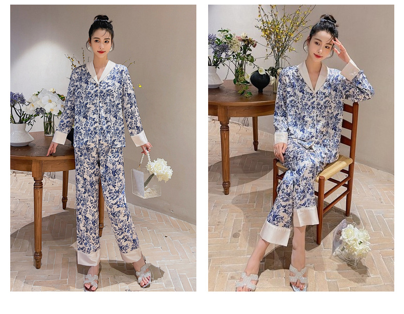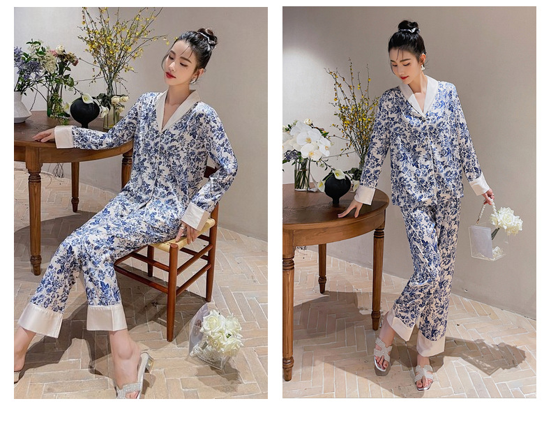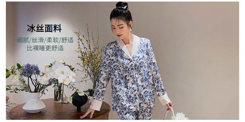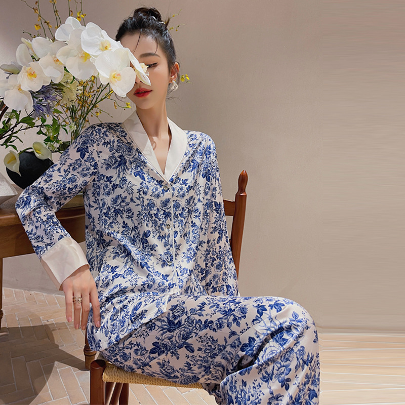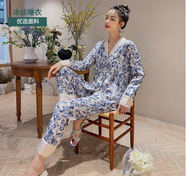 여성용 아이스 실크 잠옷 2025 봄/가을 긴팔 긴바지 세트 고풍 카디건 홈웨어 신상품 청화 도자기 디자인스토어 가기