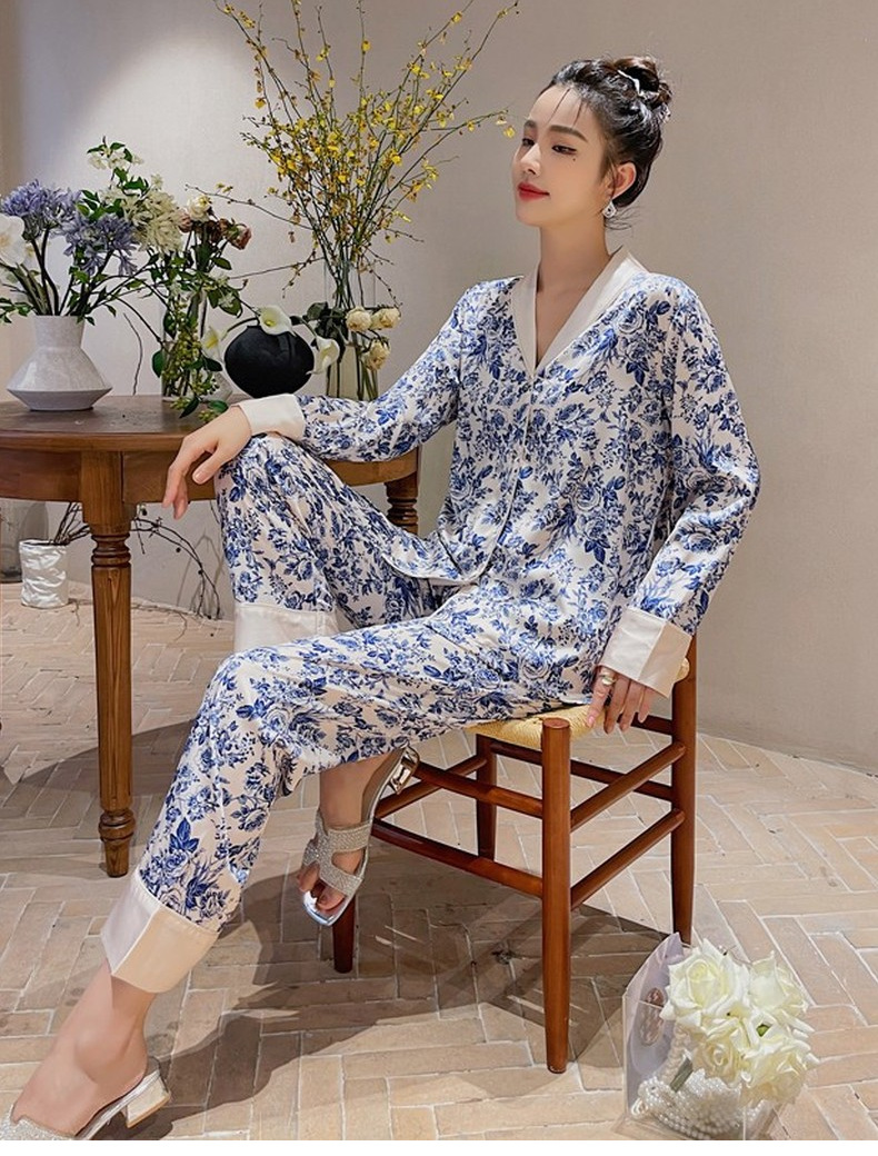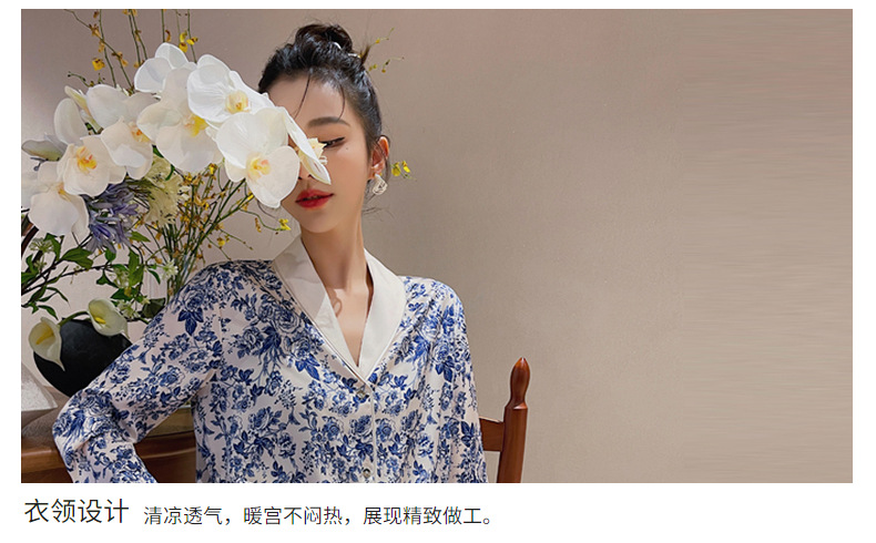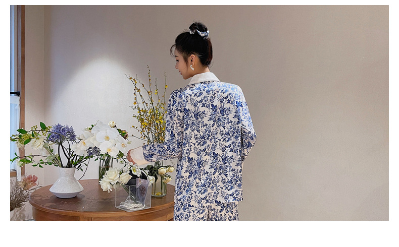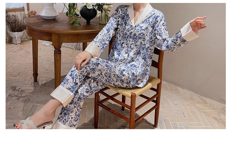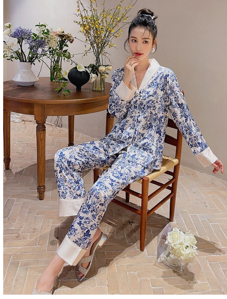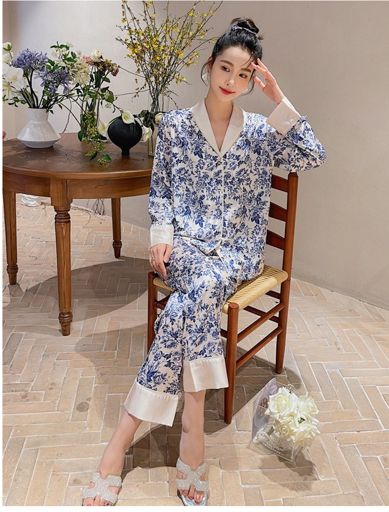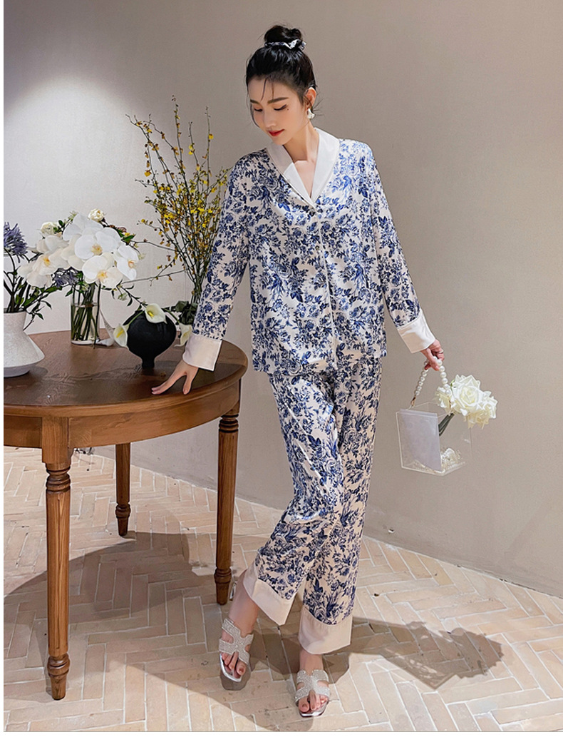 여성용 아이스 실크 잠옷 2025 봄/가을 긴팔 긴바지 세트 고풍 카디건 홈웨어 신상품 청화 도자기 디자인스토어 가기