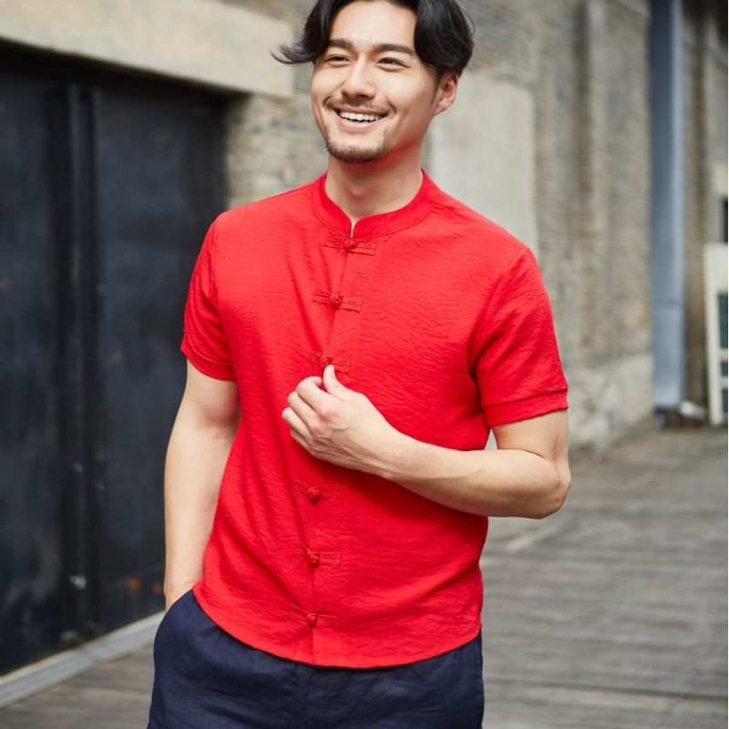 여름 야외 레저용 남성용 스탠드 칼라 솔리드 컬러 반팔 버튼업 셔츠, 트렌디하고 시원하며 통기성 좋은 린넨 캐주얼 만능 상의