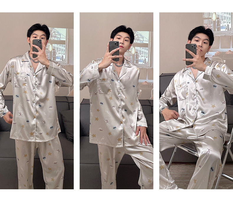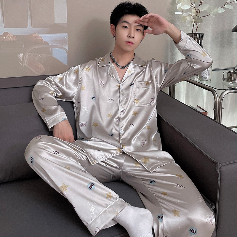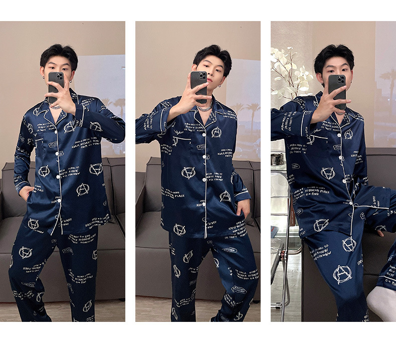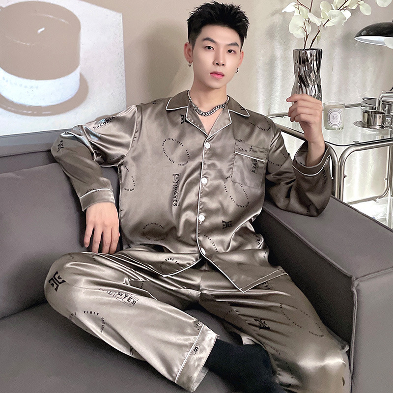 뚱뚱한 플러스 사이즈 추가 200kg 남자 잠옷 아이스 실크 긴 소매 바지 봄 옷깃 뚱뚱한 남자 뚱뚱한 남자 느슨한 가정 옷