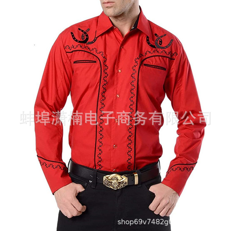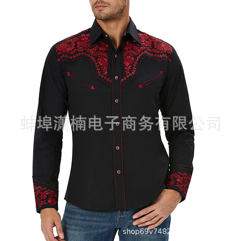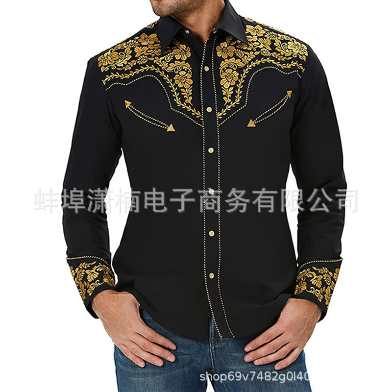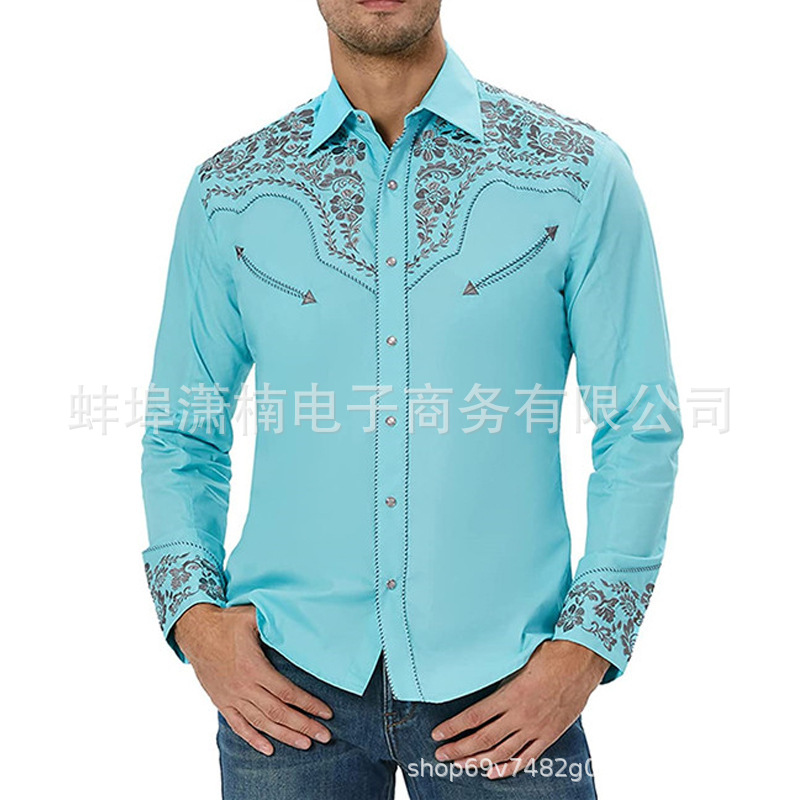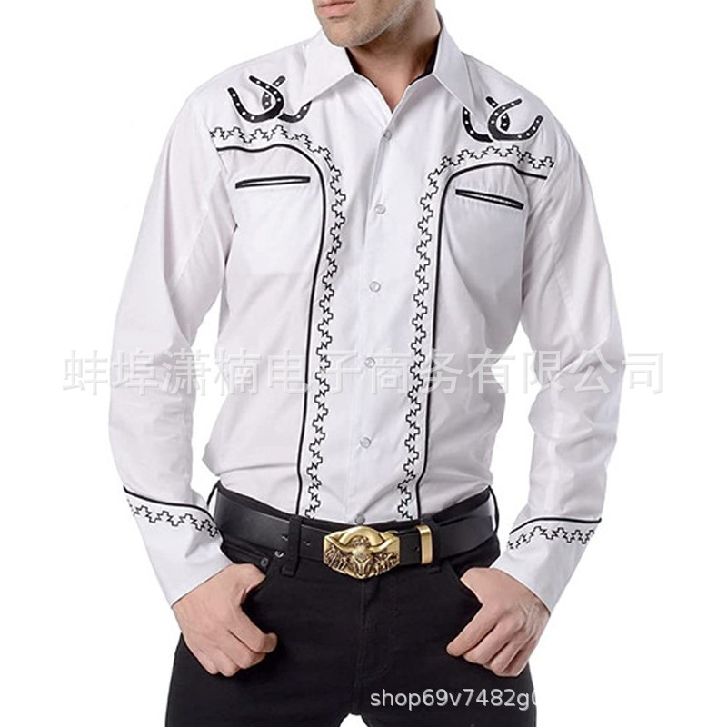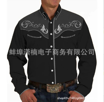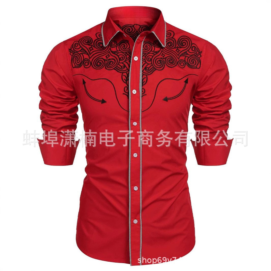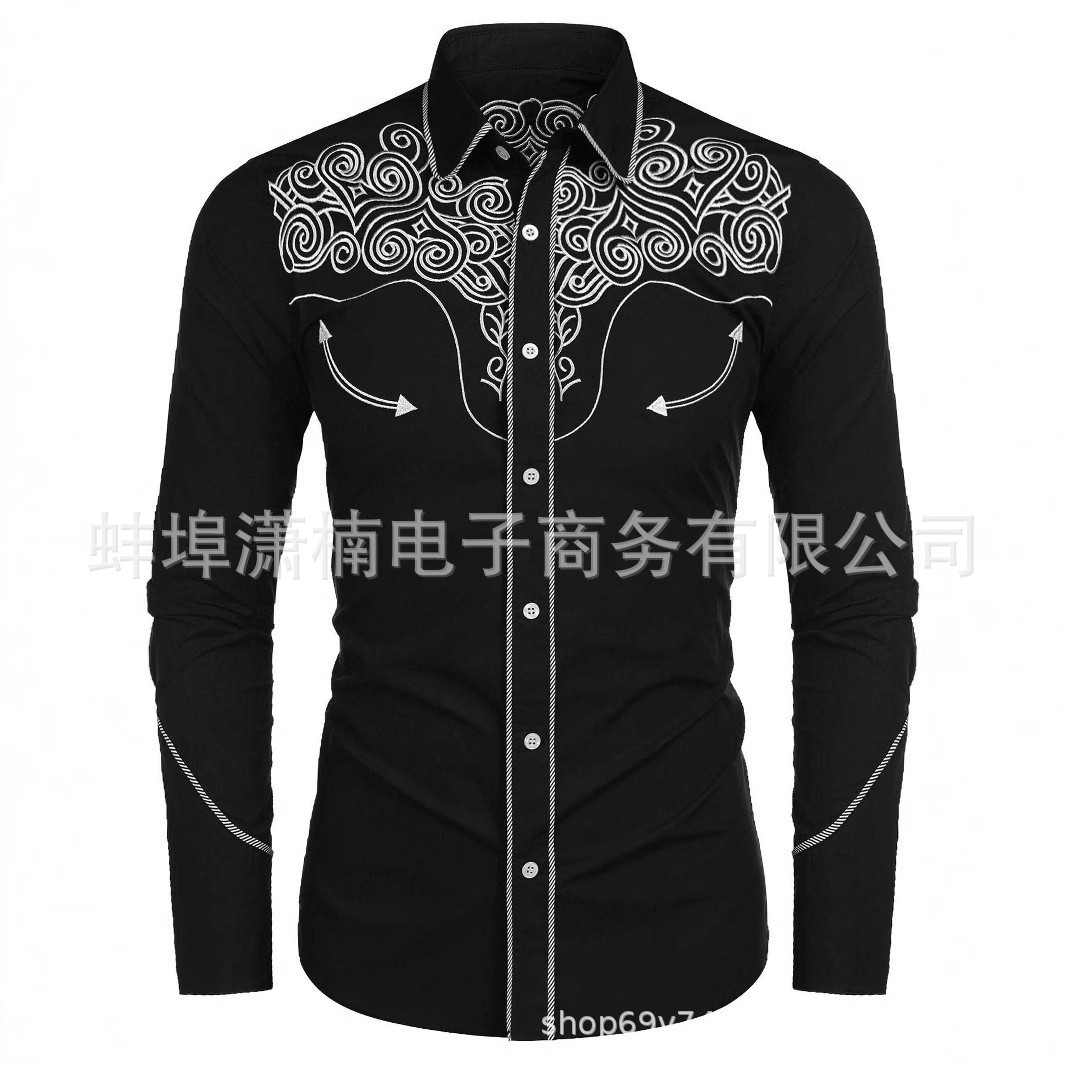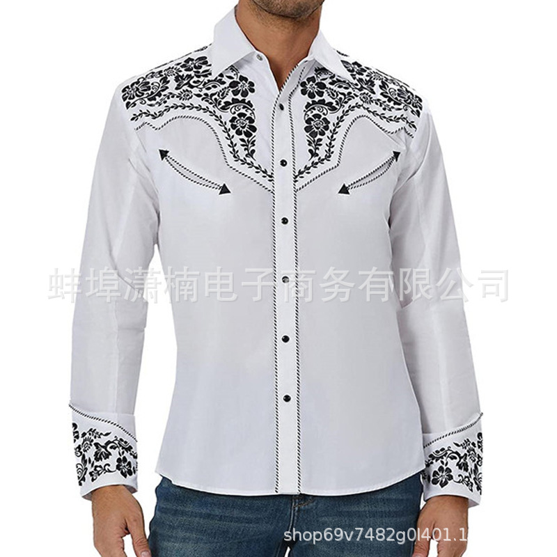 2023 크로스보더 신상 남성 패션 자수 셔츠 미국 서부 스타일 패턴 루즈한 긴팔 셔츠