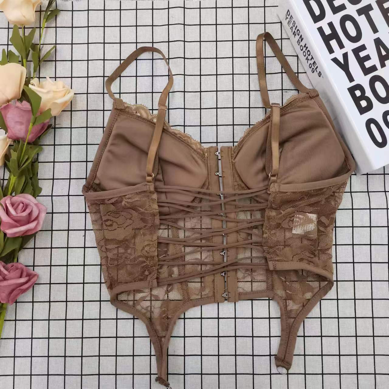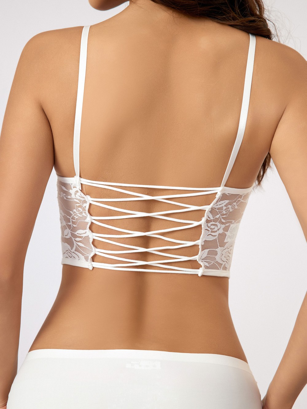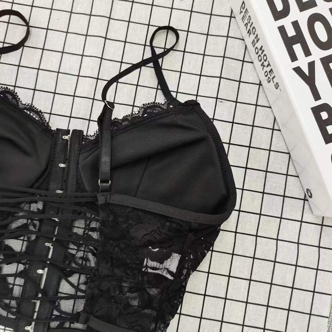 Ins 유럽과 미국의 등이없는 크로스 스트랩 레이스 슬링 여성 불규칙한 가슴 노출 섹시한 소녀 조끼 탑 (가슴 패드 포함)