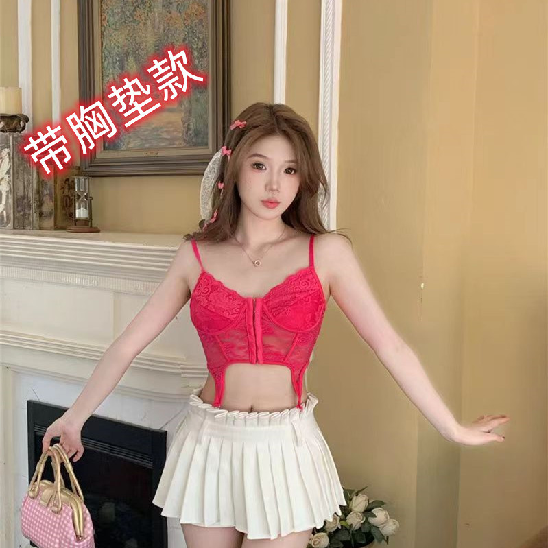 Ins 유럽과 미국의 등이없는 크로스 스트랩 레이스 슬링 여성 불규칙한 가슴 노출 섹시한 소녀 조끼 탑 (가슴 패드 포함)스토어 가기
