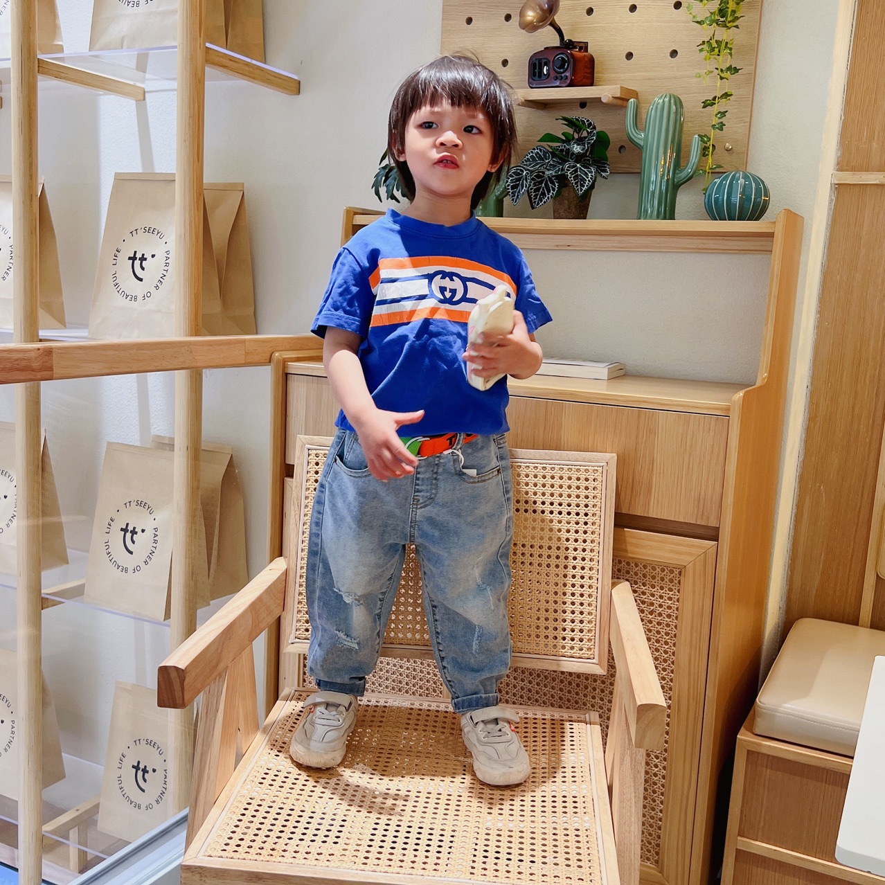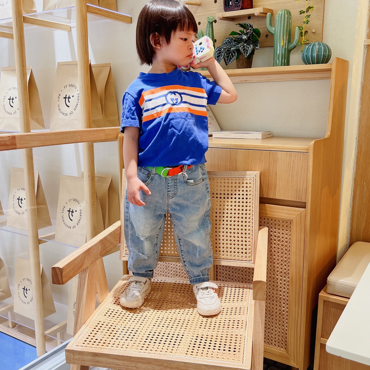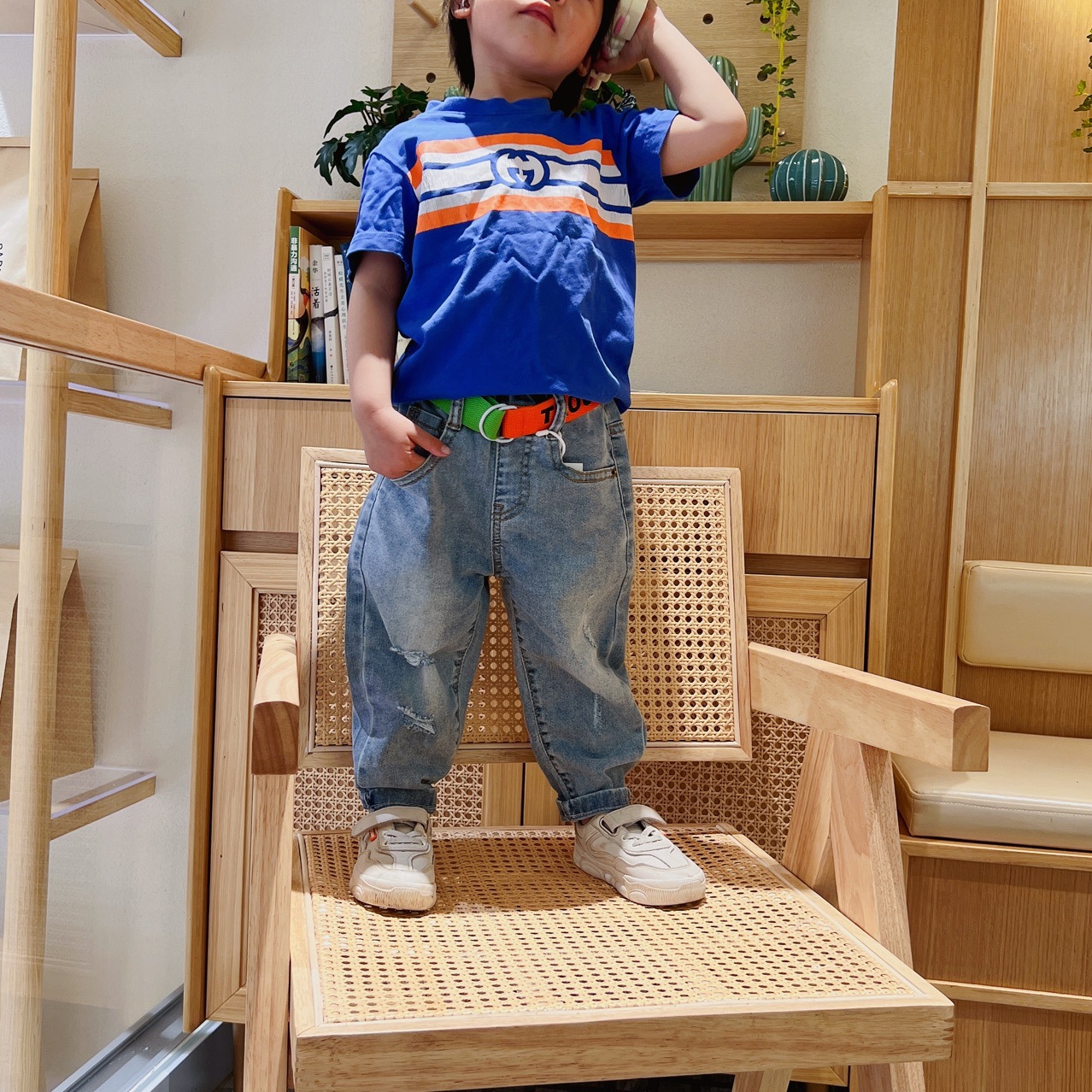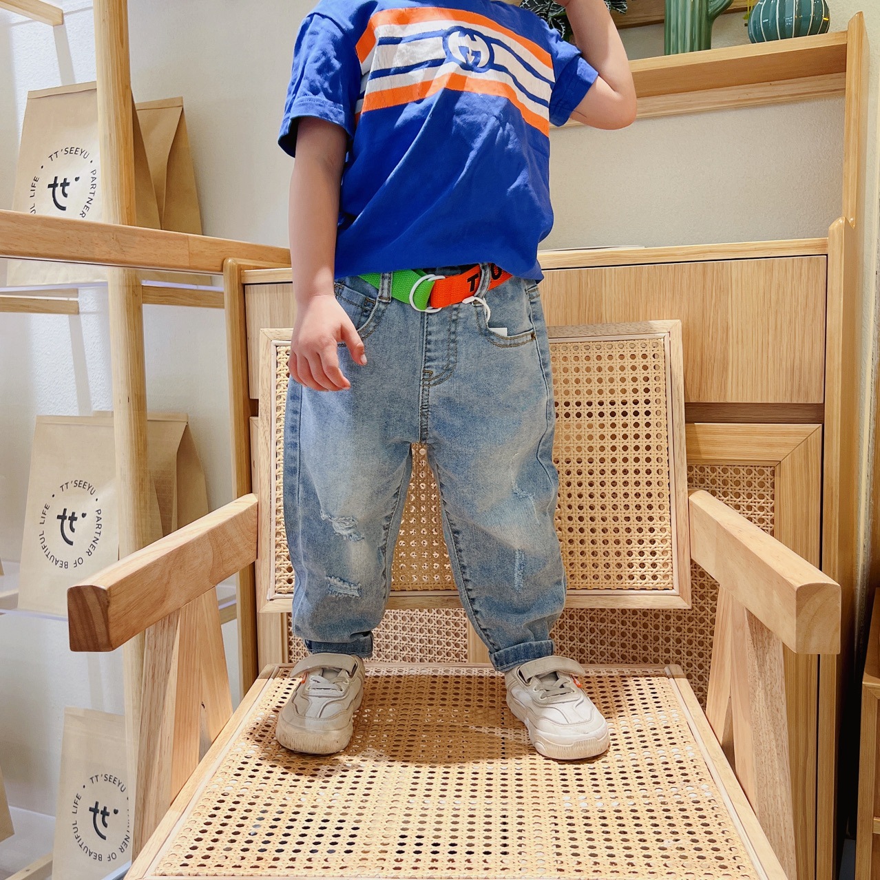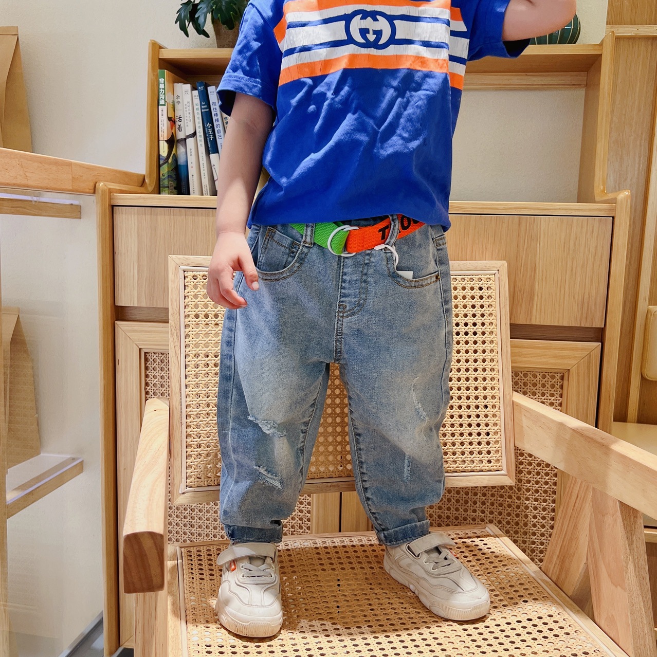 어린이 청바지 블루 찢어진 2023 봄 새로운 느슨한 한국 스타일 캐주얼 남아 바지스토어 가기