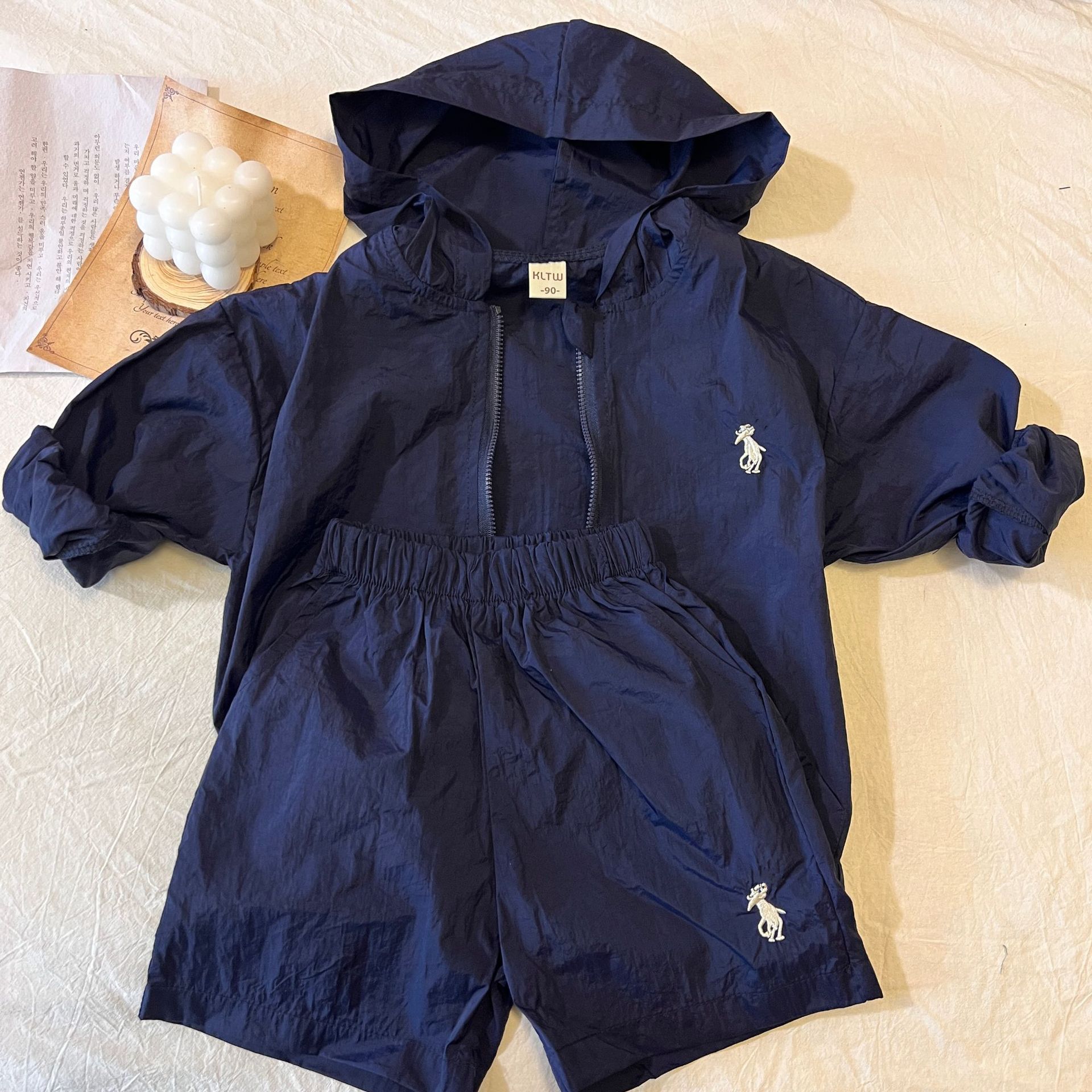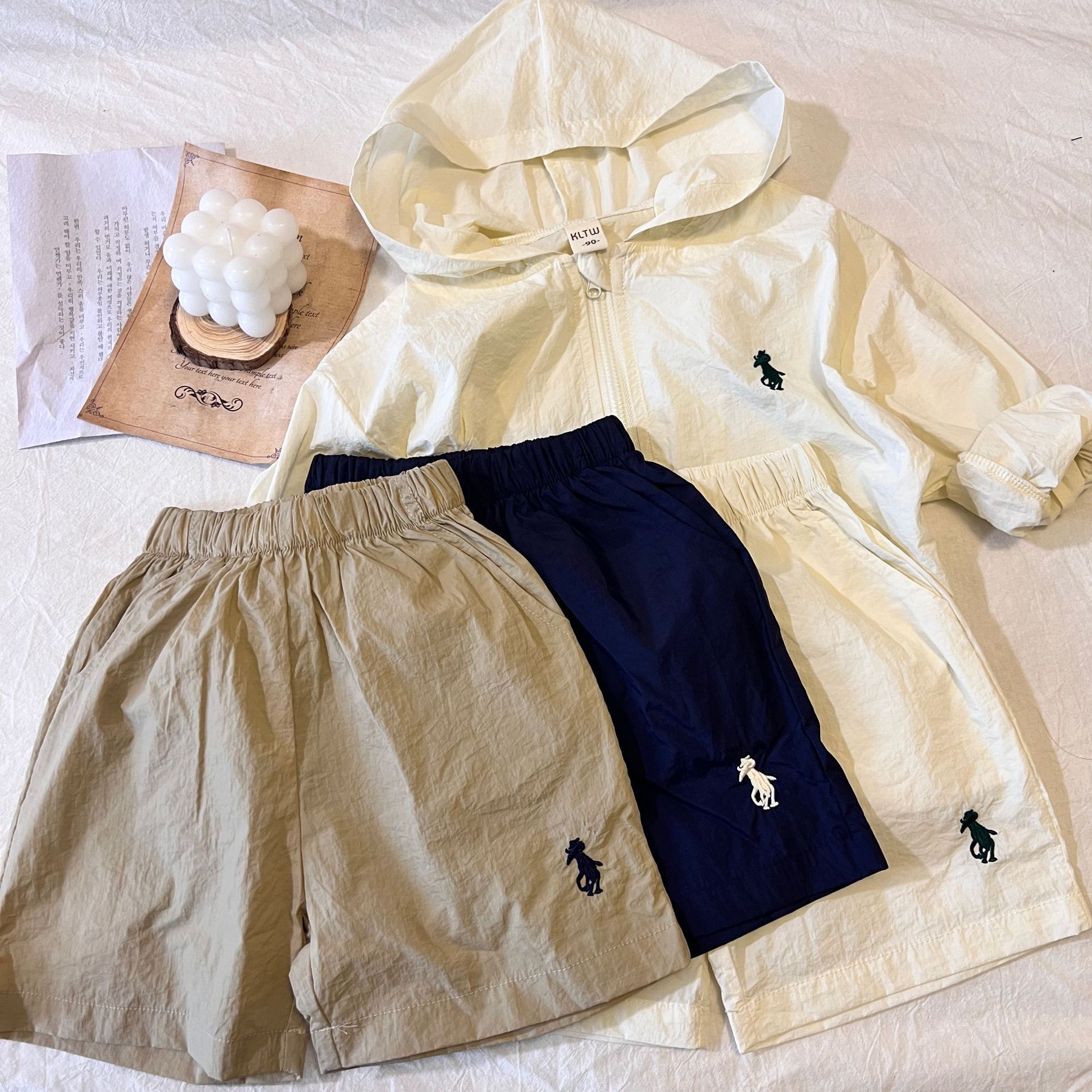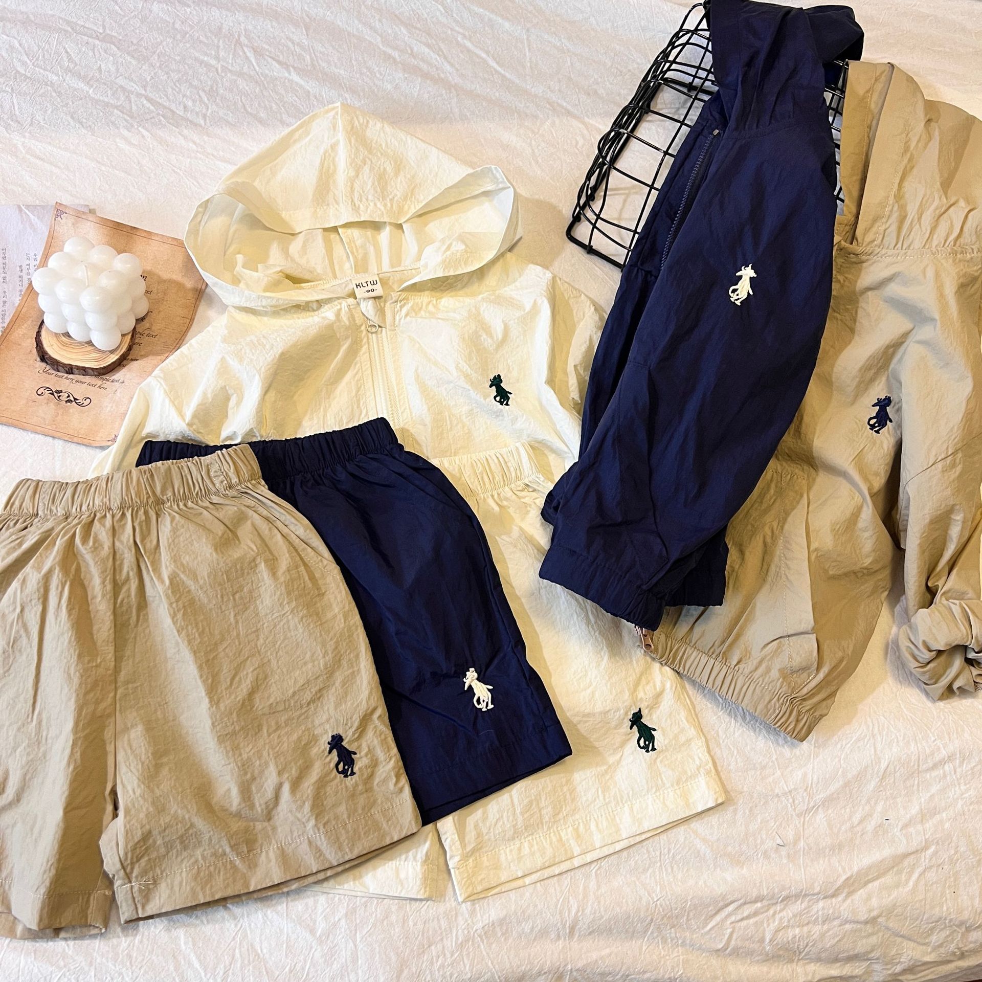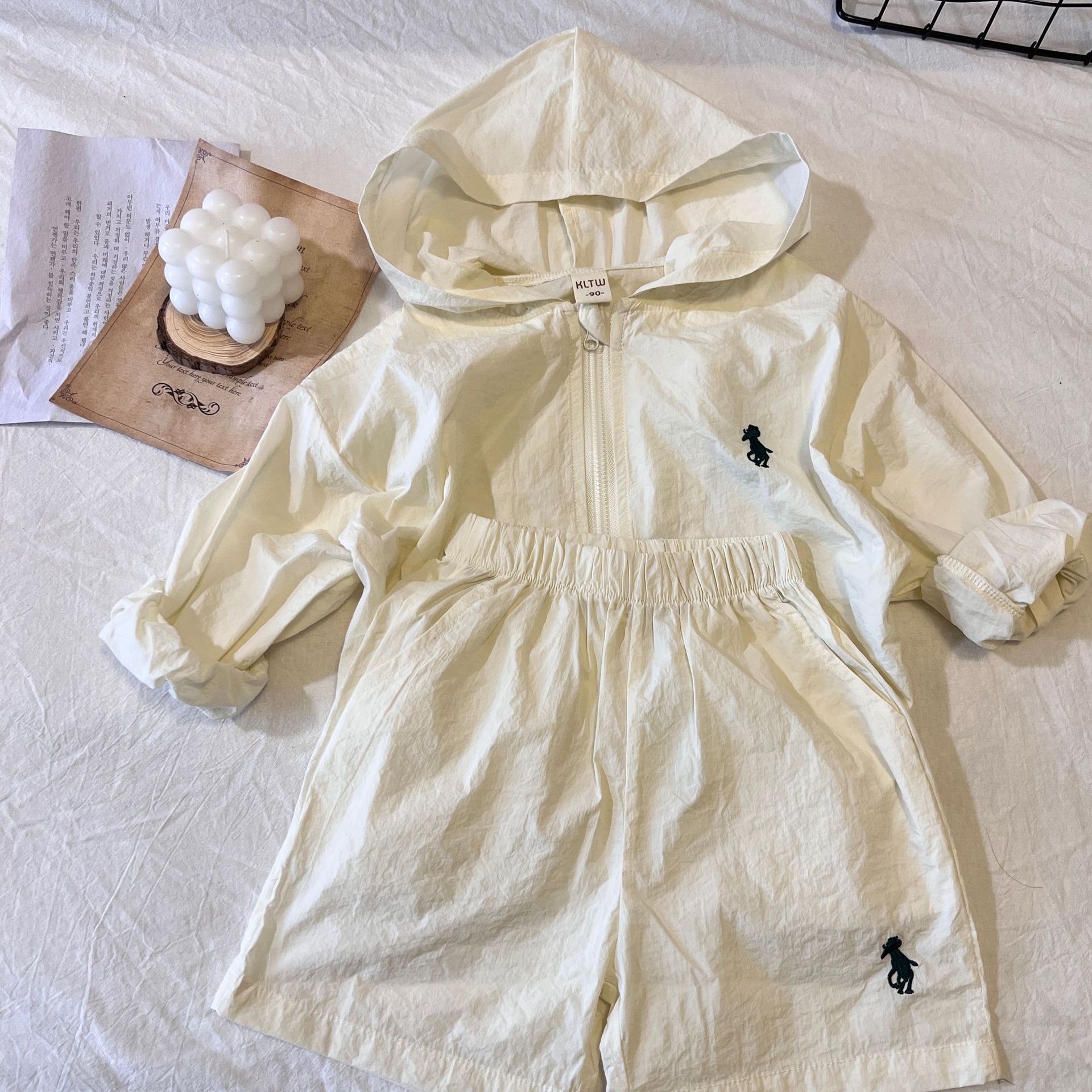 어린이 세트 2024 여름 새로운 아기 선 스크린 옷 소년과 소녀 자수 썬 스크린 긴 소매 세트 후드 스킨