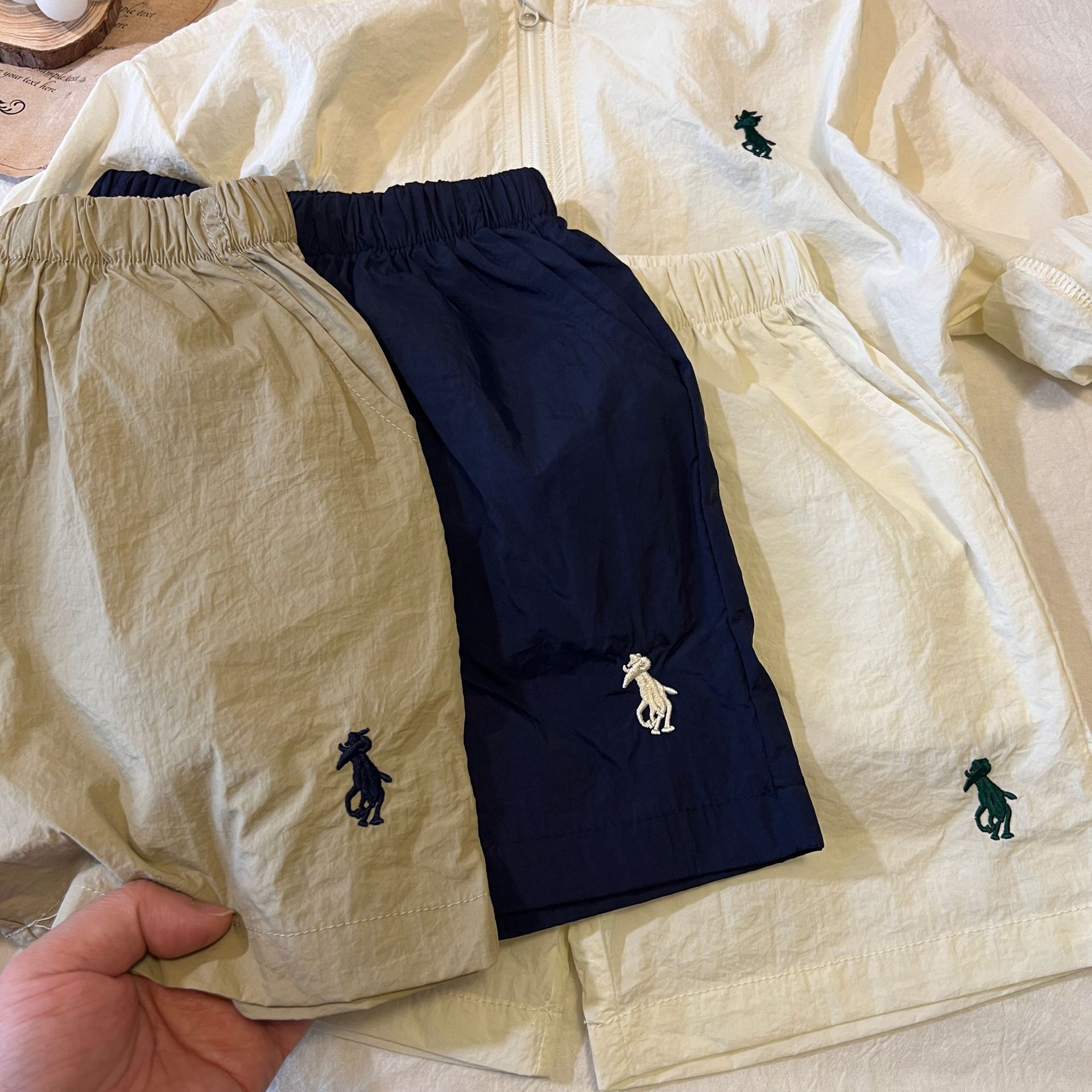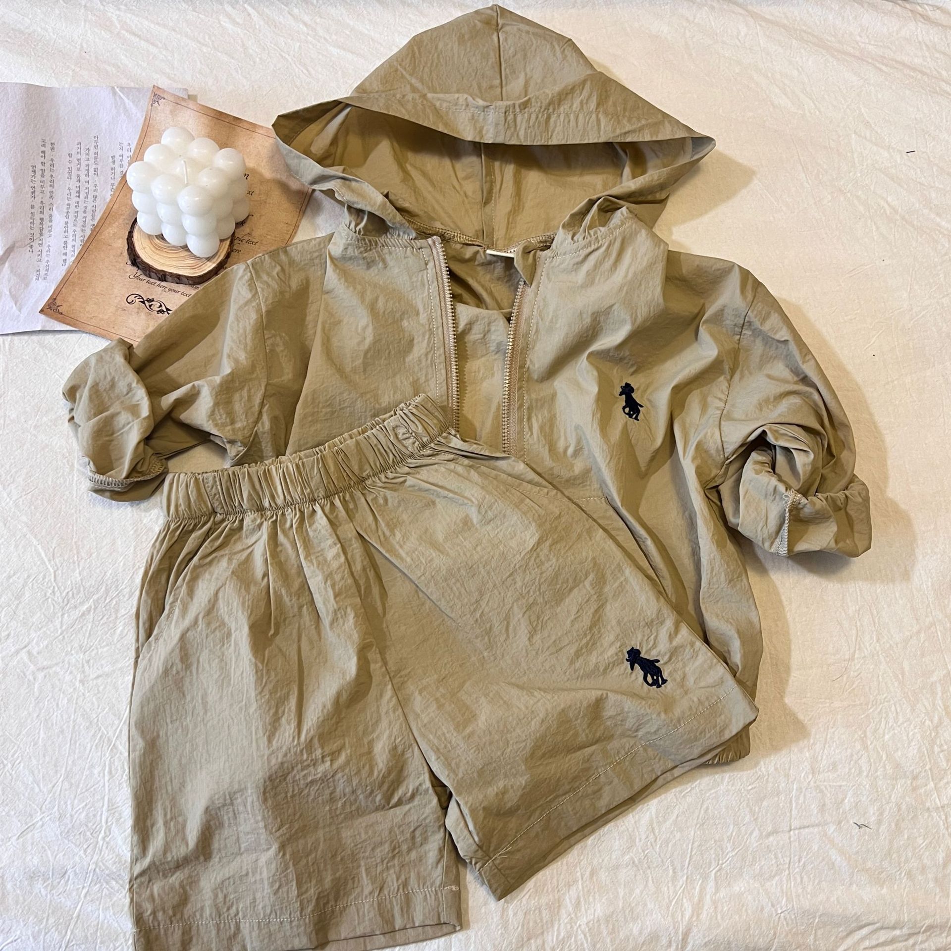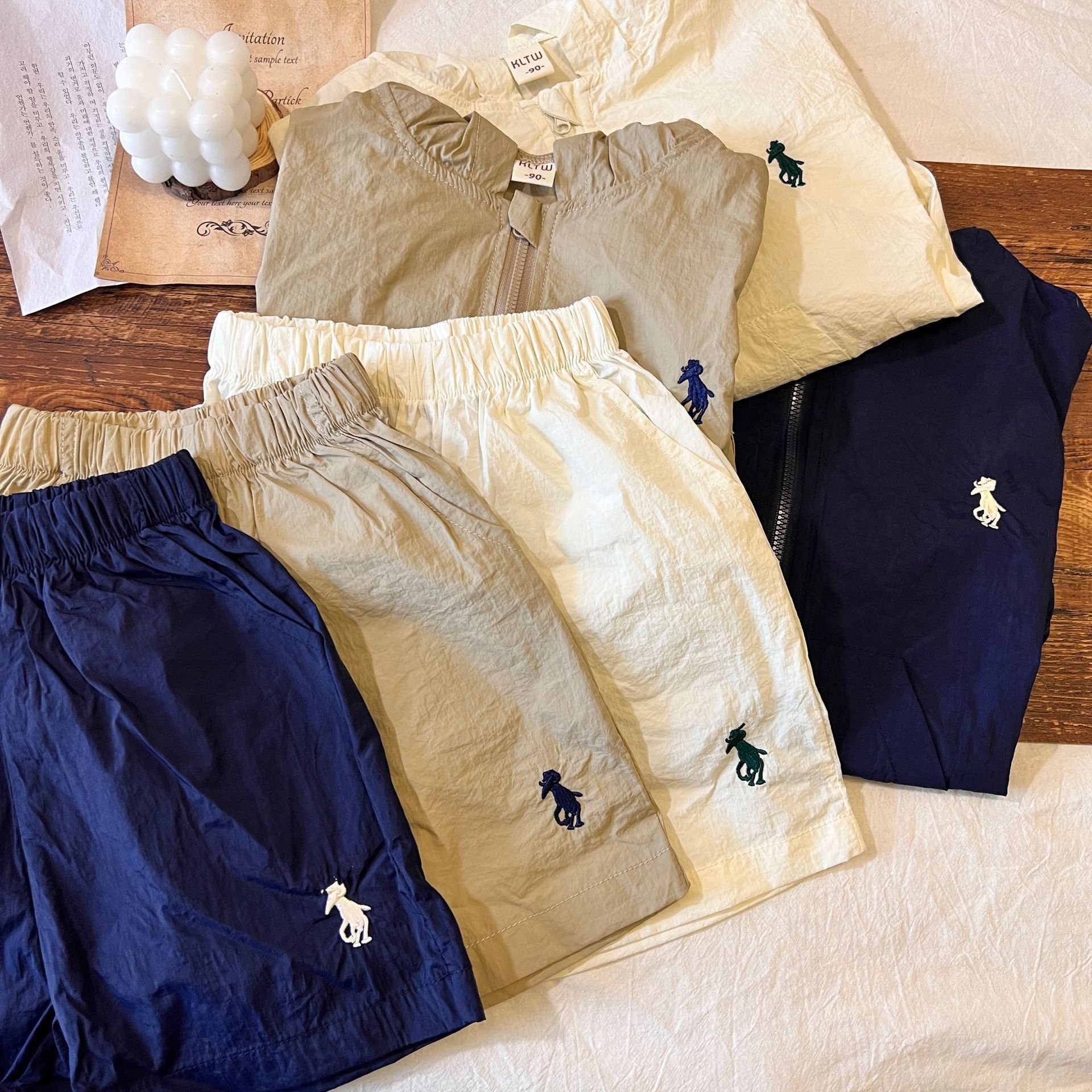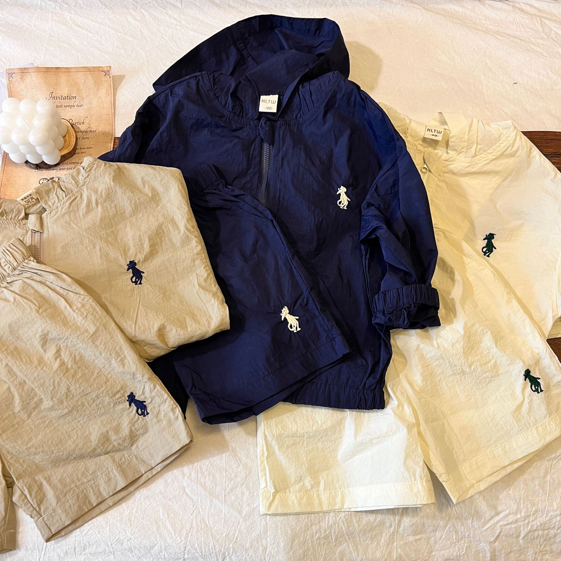 어린이 세트 2024 여름 새로운 아기 선 스크린 옷 소년과 소녀 자수 썬 스크린 긴 소매 세트 후드 스킨