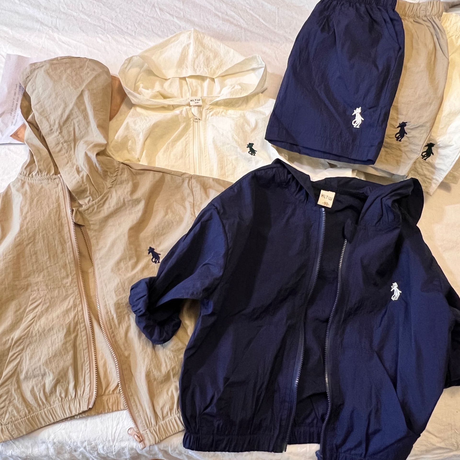 어린이 세트 2024 여름 새로운 아기 선 스크린 옷 소년과 소녀 자수 썬 스크린 긴 소매 세트 후드 스킨스토어 가기