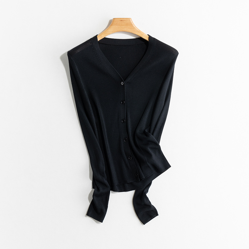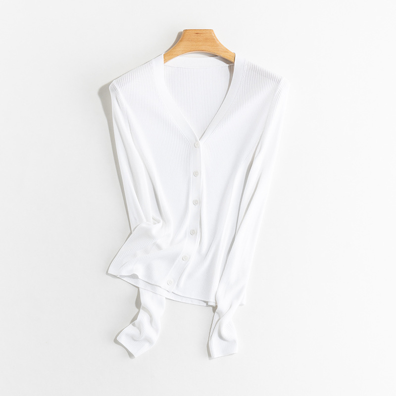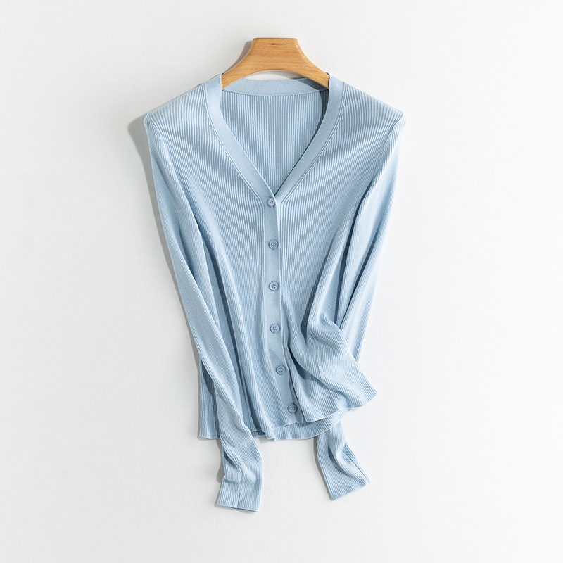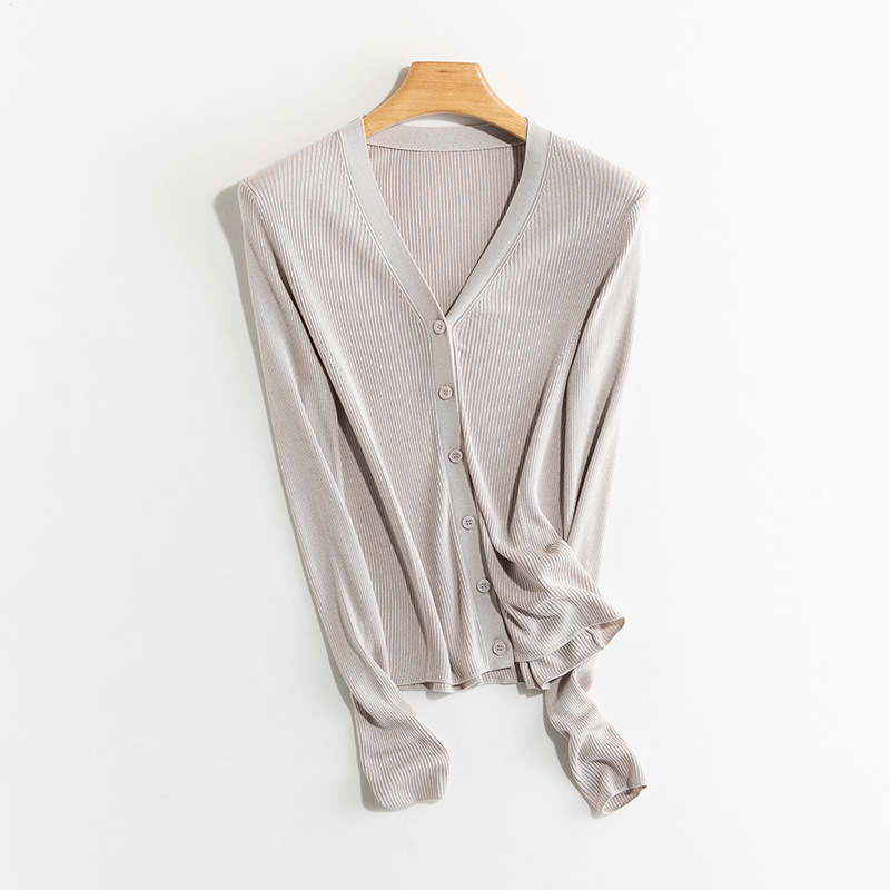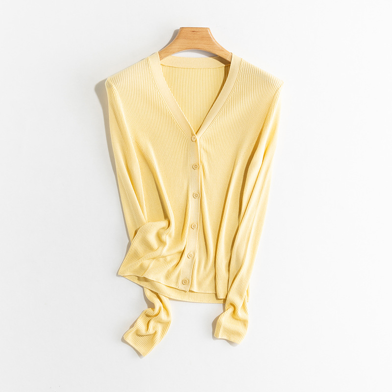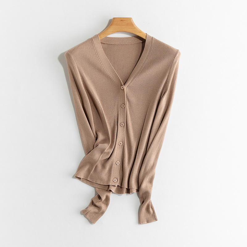 Yuyue 봄과 가을 새로운 얇은 뽕나무 실크 카디건 간단한 솔리드 컬러 긴팔 슬림 서양식 탑 스웨터 여성용